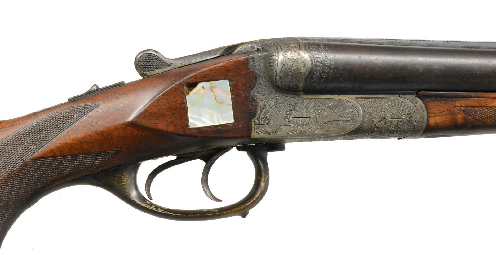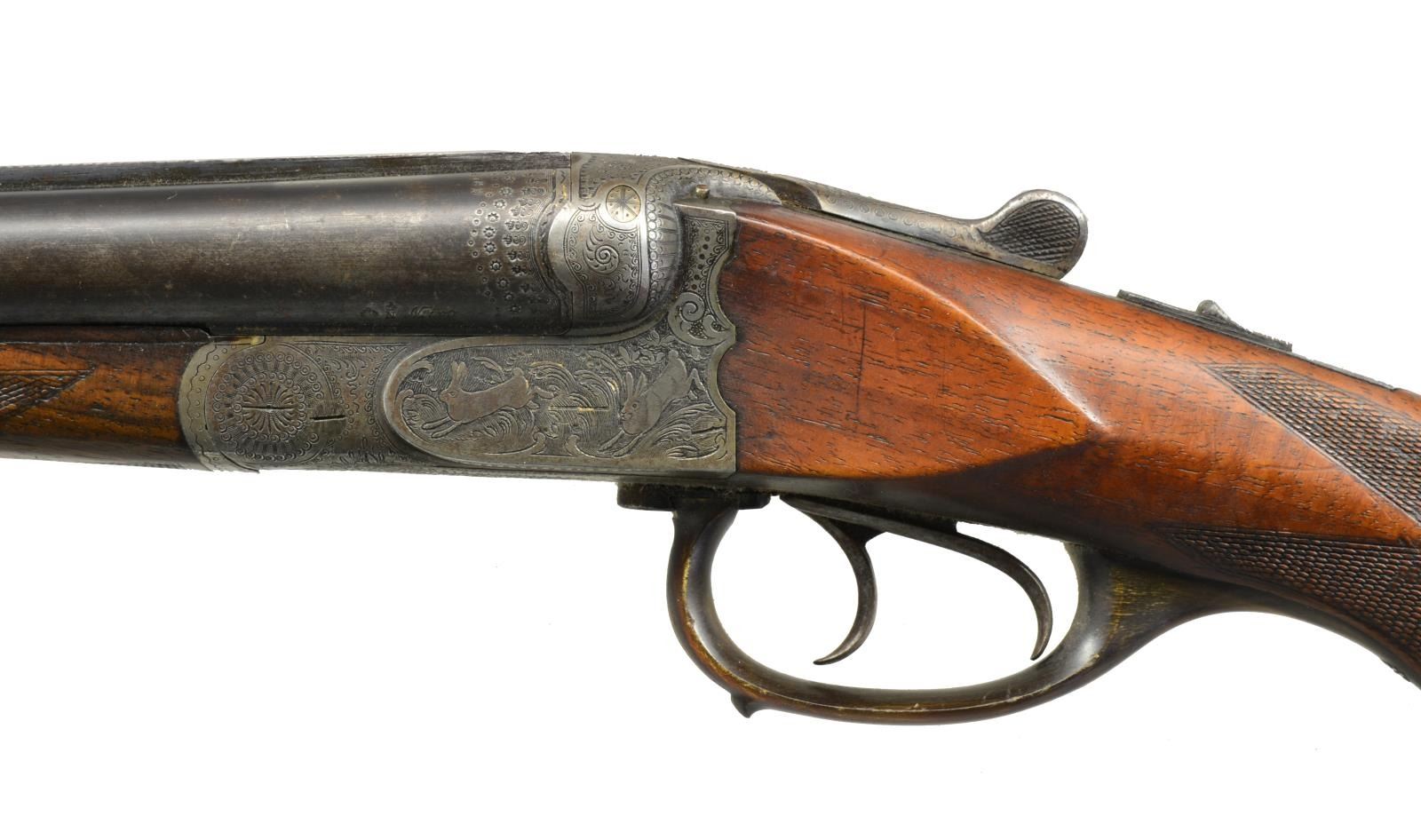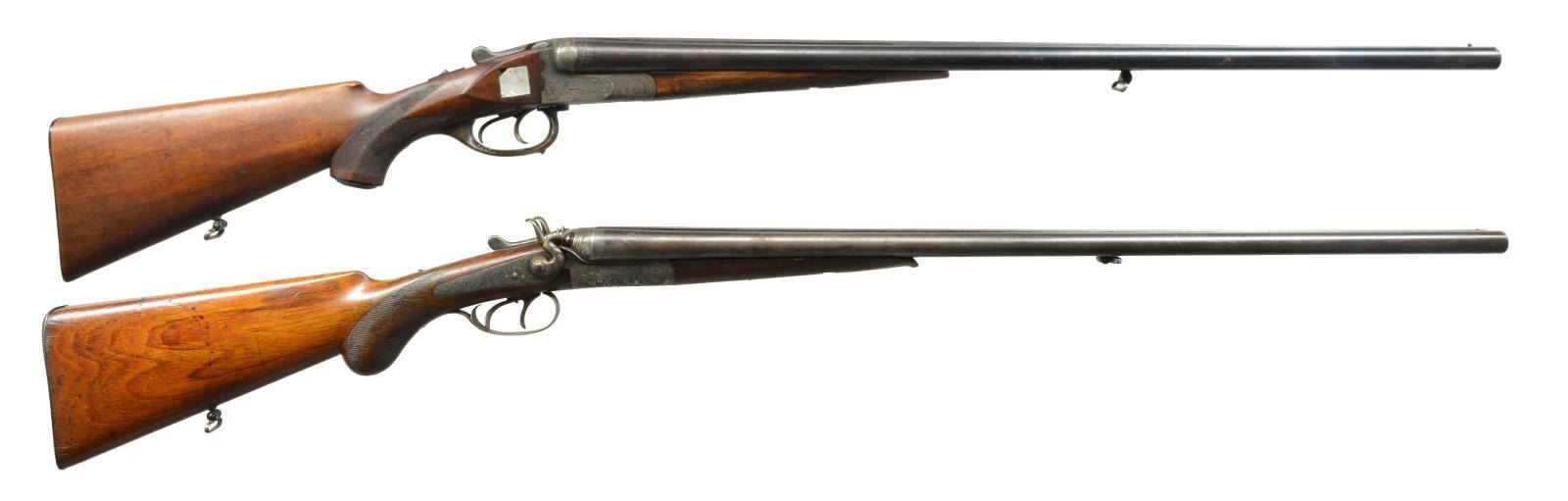 1) GERMAN GUILD. Cal. 16 Ga., 2 1/2". S# 225. Bbls. 29" of Krupp Fluid Steel. Fixed Full & Full chokes. Scalloped boxlock action featuring dbl. under lug & crossbolt locks, side clips, cocking indicators & horn trigger guard. Full coverage engraving features scenes of flying ducks on right side, w/ running rabbit on left side surrounded by arabesque scroll & floral engraving. Engraving extends to breech end of bbls. & forearm iron. Dbl. triggers. Extractors. Splinter forearm & hard rubber capped pistol grip cheekpiece stock of European walnut have hand checkering. LOP: 13 3/4" over grooved horn buttplate. CONDITION: bbls. retain 70% dull fading blue w/ scattered spots of surface corrosion. Action finish is fading to mottled gray. Forearm shows heavy checkering wear w/ lg. chip at left side of tip. Stock has worn finish & checkering w/ numerous handling marks. Right ear has added Mother of Pearl inlay w/ chip at upper rear corner. Action cocks & functions, however safety is frozen, possibly due to hardened grease. (20-1603/DS). 2) SIMSON & CO. HAMMER. Cal. 16 Ga., 2 1/2". S# 13900. Bbls. 28 1/2" of Nitro Proof Krupp Fluid Steel. Fixed Mod. & Full chokes. Bbls. have non matching S# 14164. Rnd. bodied top lever back action lock, hammer shotgun. Features include dbl. under lug & doll's head extension locking & folding peep sight in tang. Dbl. triggers, front trigger is set. Extractors. Action has full coverage vine type foliate scroll engraving w/ punch dot backgrounds featuring a fox on left side of receiver w/ a pointing dog retrieving a patridge on right side. Splinter forearm & rnd. knob cheekpiece stock of European walnut w/ hand checkering & sling swivels. LOP: 13 7/8" to steel shotgun buttplate. CONDITION: bbls. retain 50% dull fading blue showing spots of corrosion. Action finish is fading to silver gray. Wood has worn finish & checkering showing dents & handling marks w/ sm. chip in forearm along right bbl. channel. Sound mechanics. Bore shows scattered pitting. (20-1608/DS). BOTH CURIO. $700-1,000.