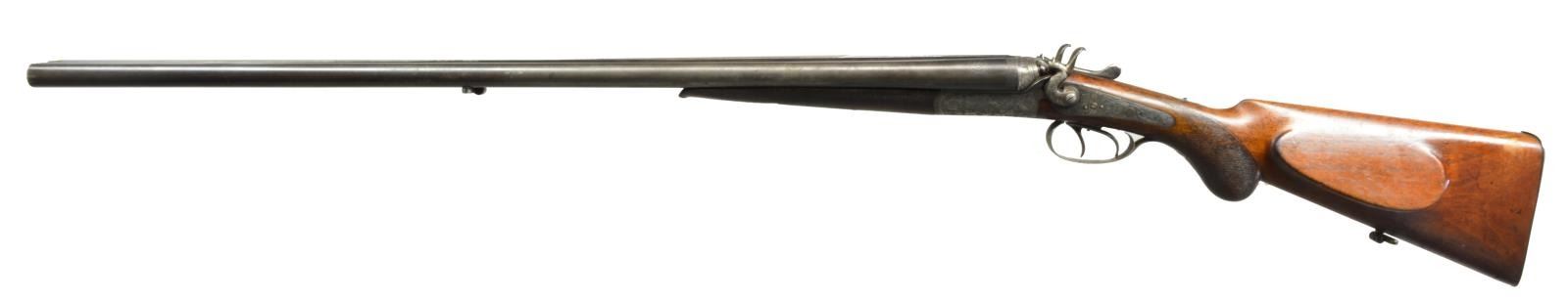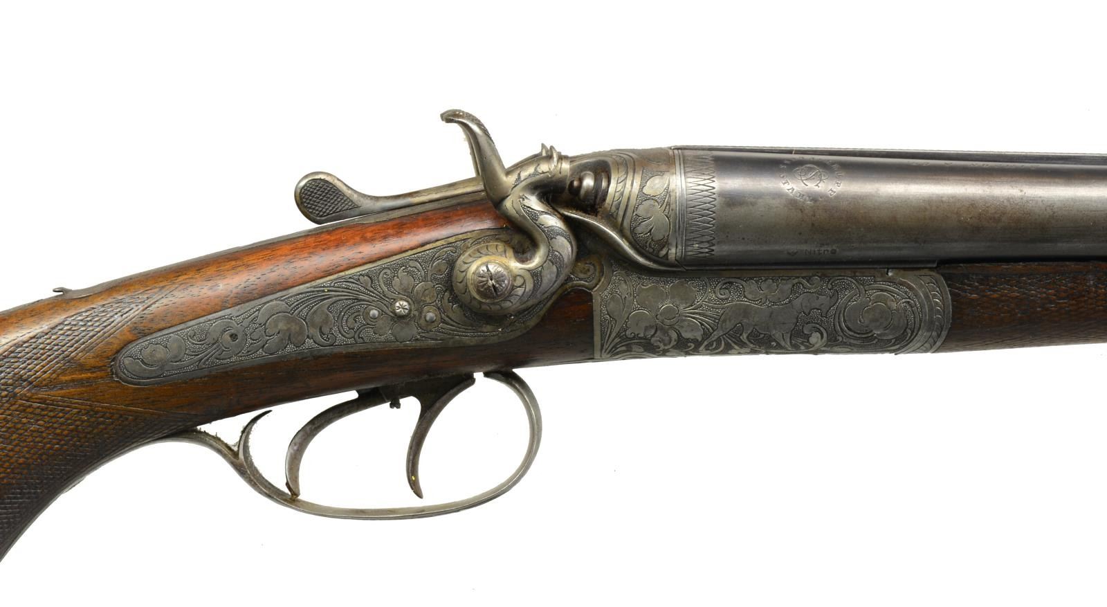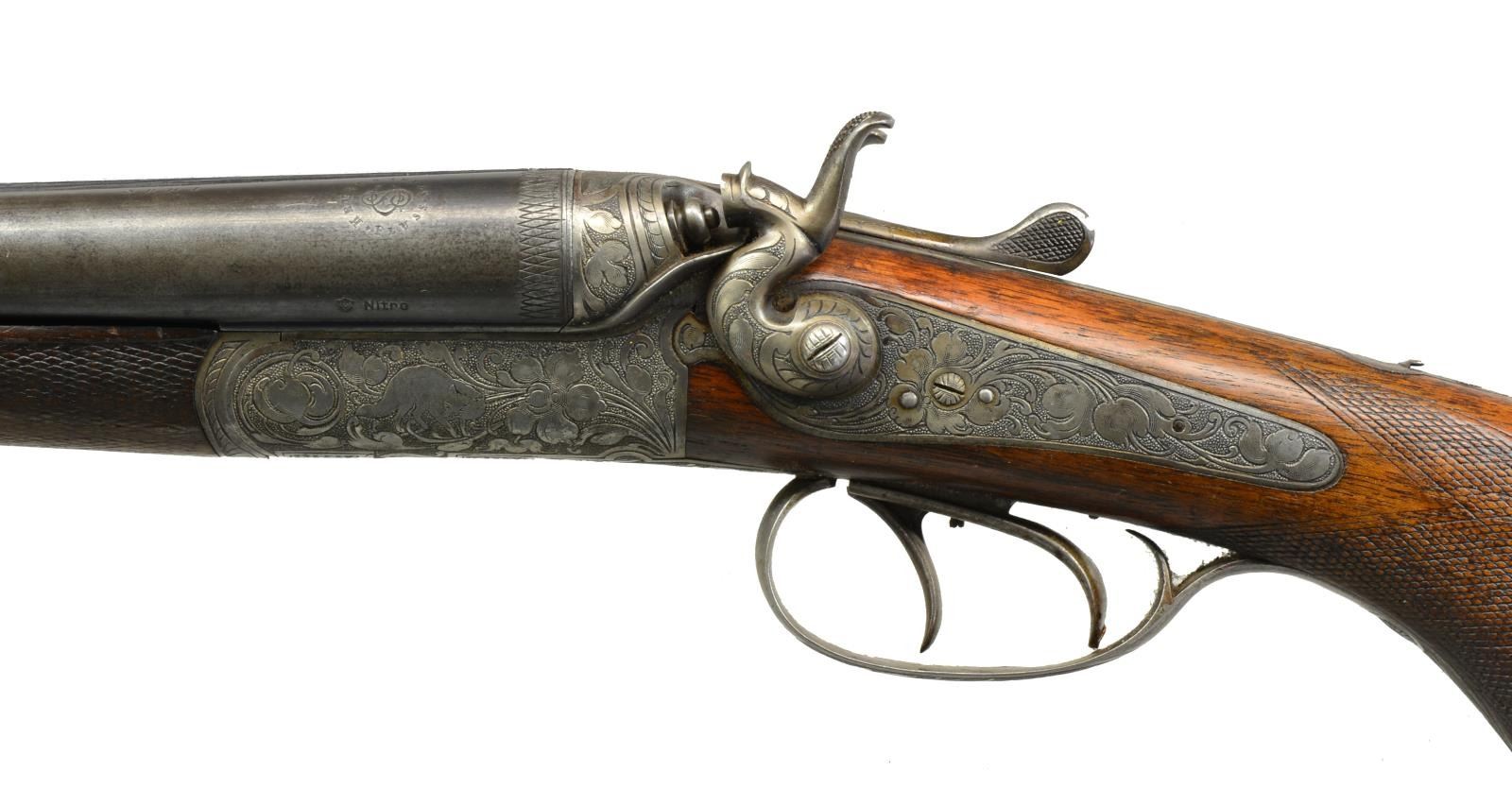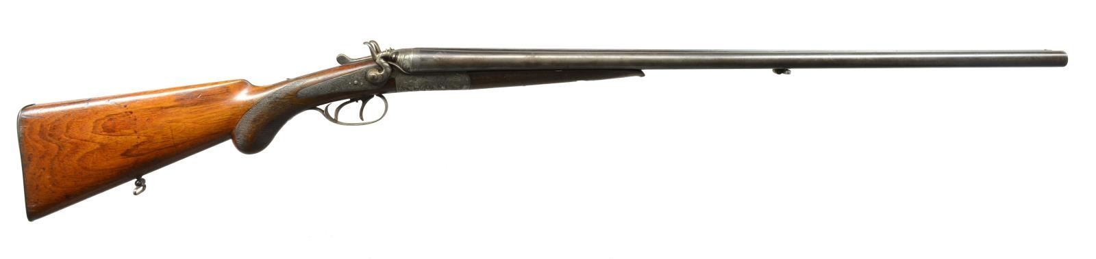 1) GERMAN GUILD. Cal. 16 Ga., 2 1/2". S# 225. Bbls. 29" of Krupp Fluid Steel. Fixed Full & Full chokes. Scalloped boxlock action featuring dbl. under lug & crossbolt locks, side clips, cocking indicators & horn trigger guard. Full coverage engraving features scenes of flying ducks on right side, w/ running rabbit on left side surrounded by arabesque scroll & floral engraving. Engraving extends to breech end of bbls. & forearm iron. Dbl. triggers. Extractors. Splinter forearm & hard rubber capped pistol grip cheekpiece stock of European walnut have hand checkering. LOP: 13 3/4" over grooved horn buttplate. CONDITION: bbls. retain 70% dull fading blue w/ scattered spots of surface corrosion. Action finish is fading to mottled gray. Forearm shows heavy checkering wear w/ lg. chip at left side of tip. Stock has worn finish & checkering w/ numerous handling marks. Right ear has added Mother of Pearl inlay w/ chip at upper rear corner. Action cocks & functions, however safety is frozen, possibly due to hardened grease. (20-1603/DS). 2) SIMSON & CO. HAMMER. Cal. 16 Ga., 2 1/2". S# 13900. Bbls. 28 1/2" of Nitro Proof Krupp Fluid Steel. Fixed Mod. & Full chokes. Bbls. have non matching S# 14164. Rnd. bodied top lever back action lock, hammer shotgun. Features include dbl. under lug & doll's head extension locking & folding peep sight in tang. Dbl. triggers, front trigger is set. Extractors. Action has full coverage vine type foliate scroll engraving w/ punch dot backgrounds featuring a fox on left side of receiver w/ a pointing dog retrieving a patridge on right side. Splinter forearm & rnd. knob cheekpiece stock of European walnut w/ hand checkering & sling swivels. LOP: 13 7/8" to steel shotgun buttplate. CONDITION: bbls. retain 50% dull fading blue showing spots of corrosion. Action finish is fading to silver gray. Wood has worn finish & checkering showing dents & handling marks w/ sm. chip in forearm along right bbl. channel. Sound mechanics. Bore shows scattered pitting. (20-1608/DS). BOTH CURIO. $700-1,000.
