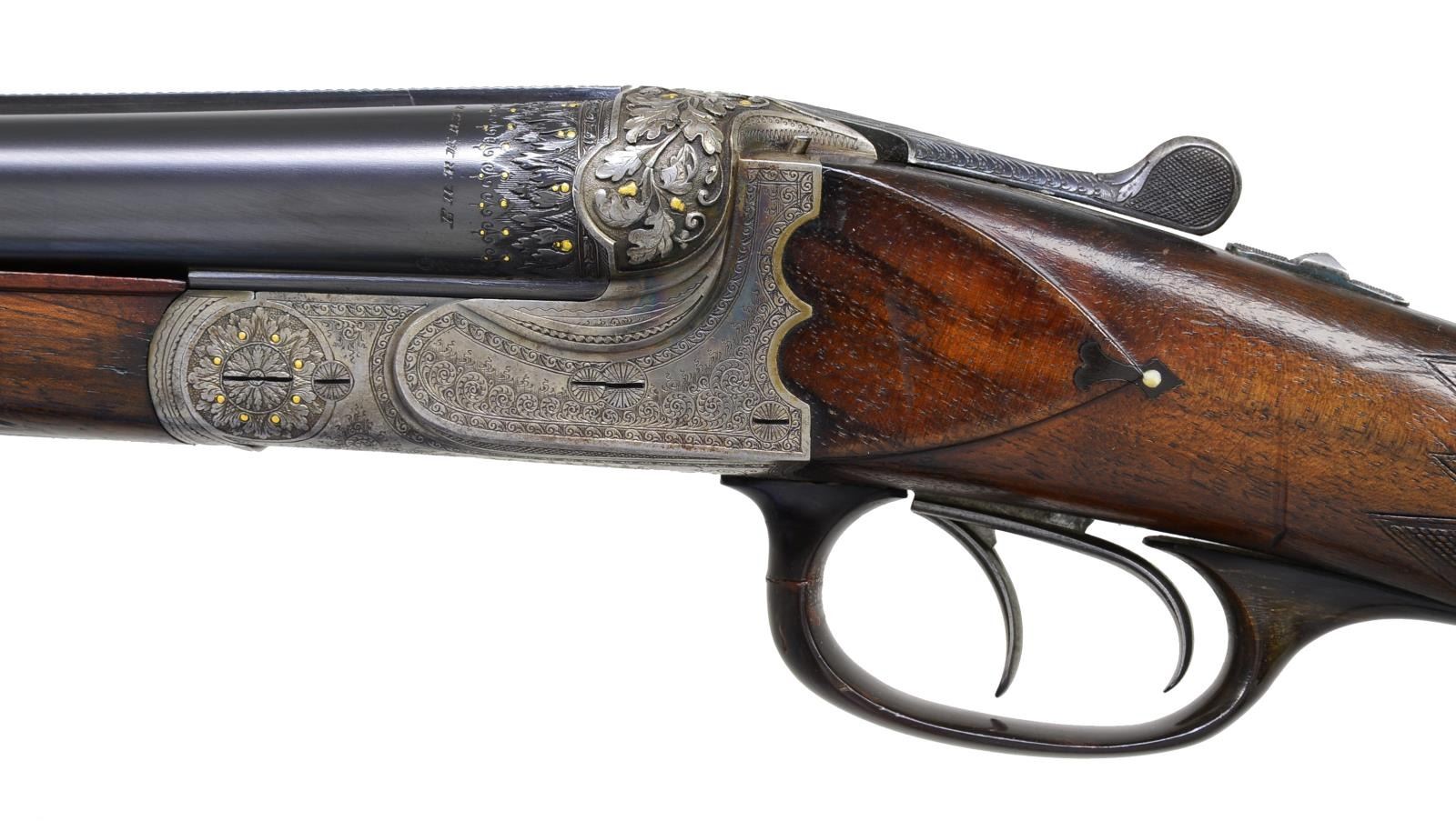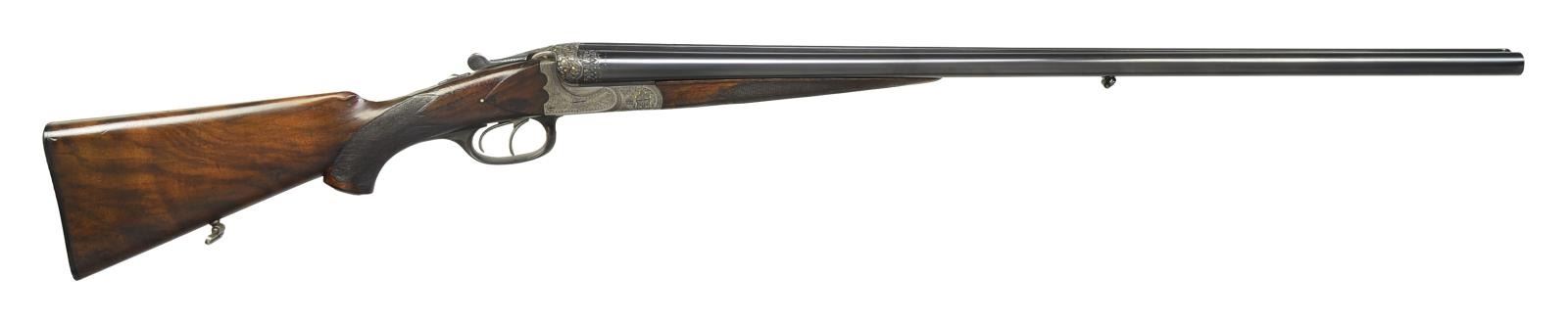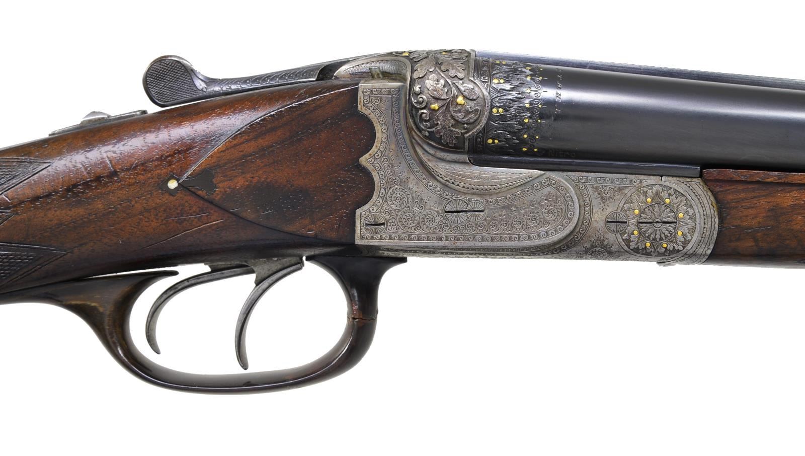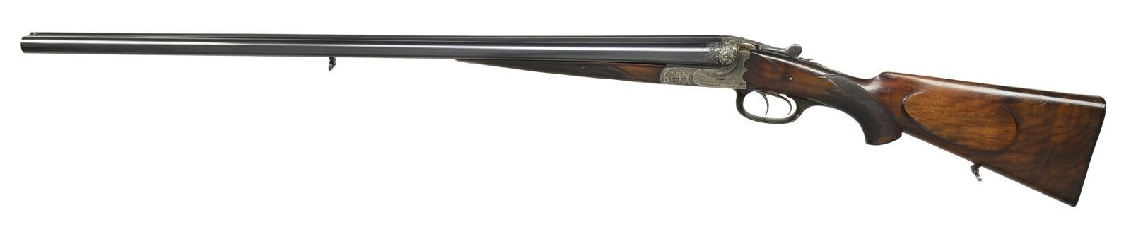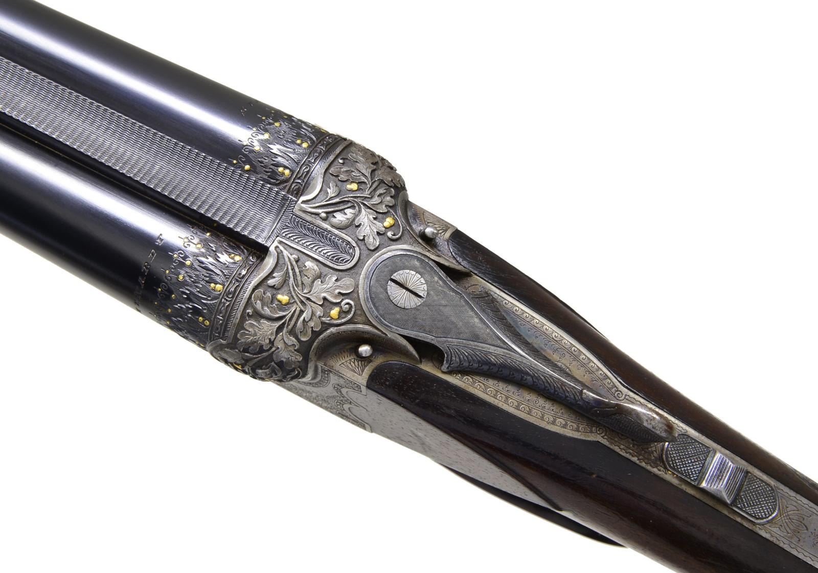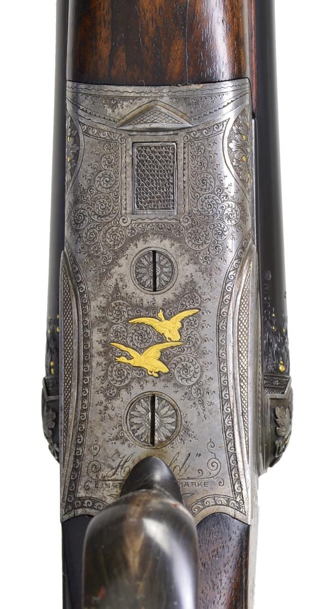 BOXLOCK EJECTOR SHOTGUN BY "HEROLD" (FRANZ JAEGER). Cal. 16 Ga., 2 9/16". S# 6518. Bbl. 28 3/4" shoe lump, fitted w/ slightly raised matted concave game rib. Bbl. flats are stamped w/ pre WWI German nitro proofs. Sling loop is soldered to bottom rib. Case hardened scallop backed boxlock action features non-automatic safety ("SICHER" in gold), pin type cocking indicators, crossbolt 3rd fastener, sideclips, & double triggers. Action is engraved w/ 70% coverage, nicely cut Germanic scroll w/ line & scroll borders surrounding a nicely detailed pair of flying ducks inlaid in gold on floorplate which is also engraved "HEROLD" trade mark name for Franz Jaeger. A floral burst around hinge pin screw has gold inlaid buds. The most striking part of this unusual shotgun are the exquisitely deep relief carved fences along w/ adjacent bbl. treatment. Carving is in oak leaf & acorn motif w/ scrolling oak leaves; acorns are inlaid in relief gold. This fine work transitions onto bbls. w/ 3/4" bands of relief acanthus interspersed w/ gold dots. Trigger guard is of horn. Well marbled, lightly figured European walnut horn capped pistol grip buttstock measures 14" over horn basket weave buttplate. Stock features small right hand shadow line cheekpiece. Inlet horn drop points w/ ivory dot accents, and closely spaced point pattern checkering on semi diamond grip. Matching splinter ejector forend w/ inlet horn tip has Deely release. MEASUREMENTS: BARRELS: Bore diameter: R .672 L .672. Restriction: R .020 (MOD) L .030 (IMOD). Min. Wall Thickness: R .029. L .030. STOCK: LOP: 14" DAC: 1 1/2". DAH: 2 1/2". Cast: Neutral. WEIGHT: 6 lbs. 1 oz. CONDITION: good to very fine as partially refinished. Bbls. retain nearly all of a very fine quality reblack, engraving remaining clear. Action retains 30-40% original case hardening color, quite strong where protected. Stocks retain most of what appears to be their original oil finish w/ numerous marks & dings. Checkering w/ moderate wear has not been recut. There is repair to horn at front of trigger guard bow. There is a lacquer repair to a ding on nose of comb. Two repaired minor cracks are on bottom of forend in front of iron & one in bbl. channel of right bbl & epoxy repaired chip in bbl. channel toward tip. Bores are very good to fine w/ some light scattered frosting toward breech ends. Evidence of 2-3 minor repaired dents, mostly in right bbl. Action is tight, bbls. are on face. Ejectors are slightly out of time. (20-2386/MGM35). CURIO. $2,000-3,500.