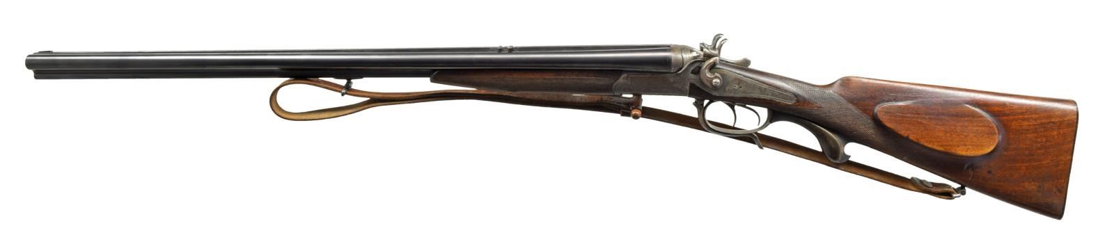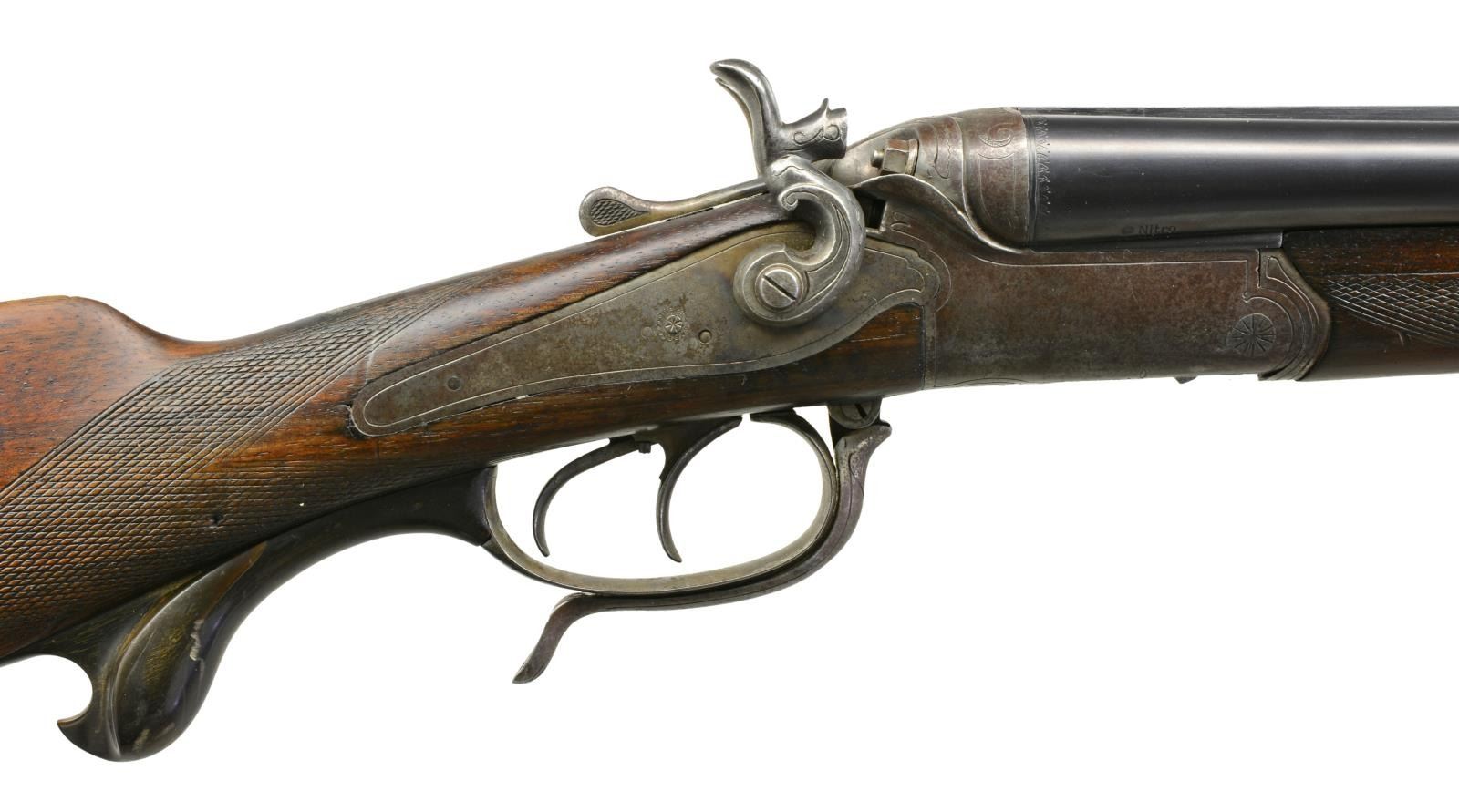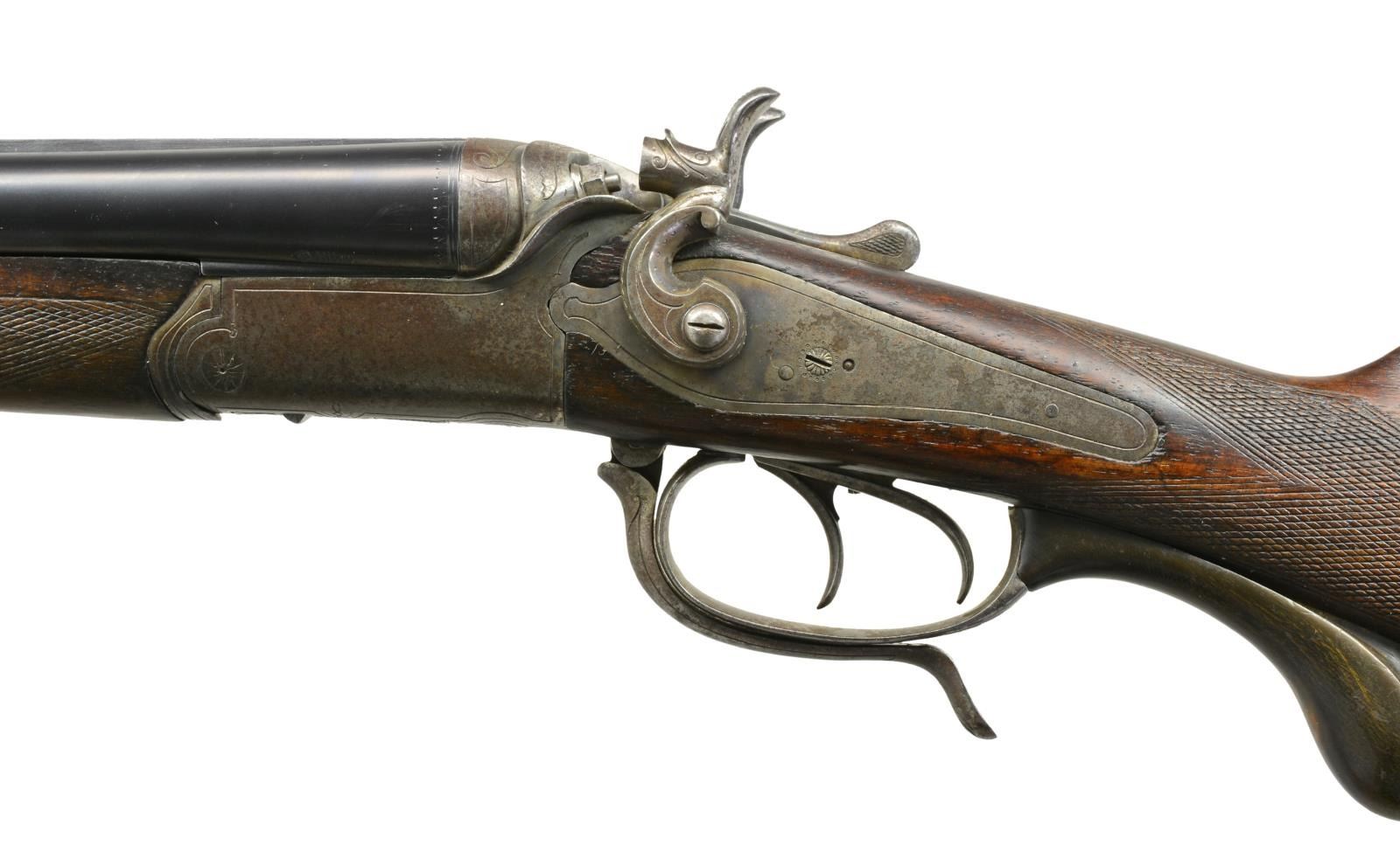 Cal. 20 Ga., 2 1/2". / 6.3mm for unidentified rimmed cartridge. S# 5783. Bbl. 26 7/8". Blade front sight w/ 2 folding leaf rear sight. Rnd. bodied underlever action w/ exposed hammer back action locks, dbl. under lug locking, top tang bbl. selector & set front trigger. Action & locks have borderline engraving. Dbl. triggers, extractors. Splinter forearm & straight grip cheekpiece stock of European walnut w/ hand checkering. Ornate carved horn trigger guard extension. LOP: 13 1/2" over checkered horn buttplate. European style sling on original swivels. Weight: 7 lbs., 0.5 oz. CONDITION: Bbls. retain 98% reblued finish. Action is fading to a mottled silver gray w/ scattered corrosion & retains a sm. amount of case colors in protected areas. Wood has worn finish & checkering showing numerous dents & scratches w/ sm. chips behind locks. Bbls. are slightly loose on frame. Shotguns bores are generally bright. Rifle bore has darkened appearance over worn rifling. (20-1802/DS). CURIO. $1,000-1,500.