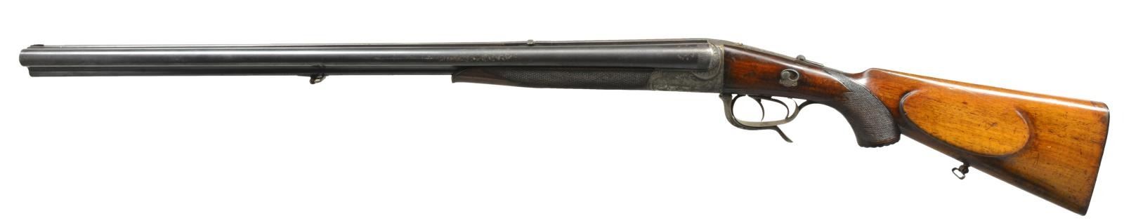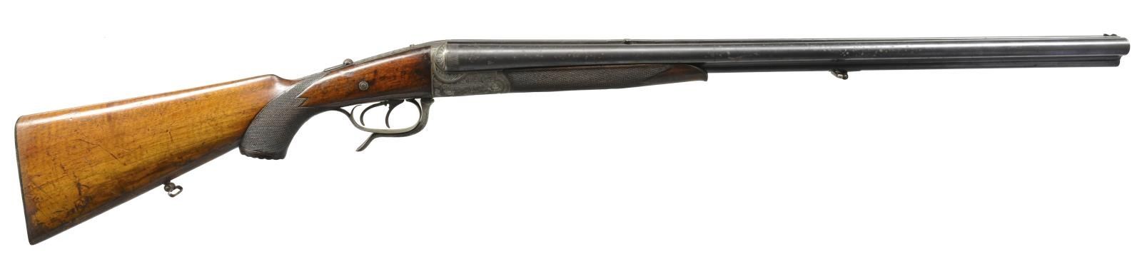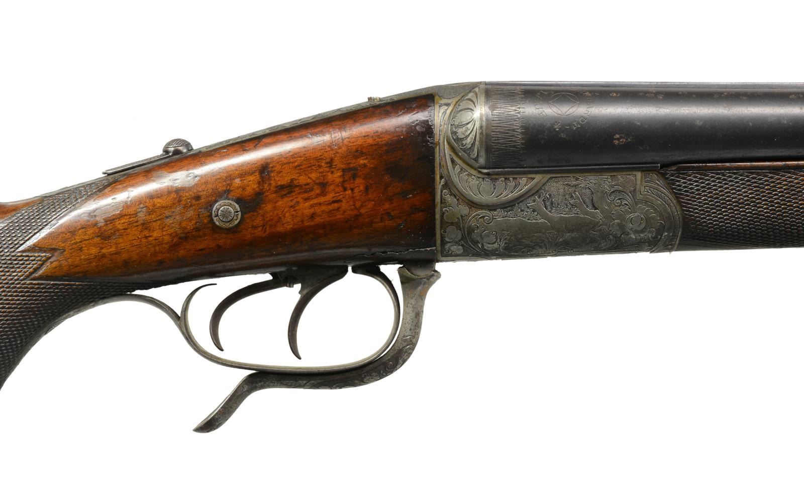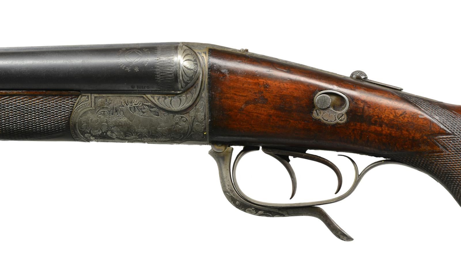 Cal. 16 Ga., 2 1/2" / 9.3x72. S# 37145. Bbls. 26 13/16" of "EHRHARDT" Fluid Steel. Bead front sight w/ bbl. selector operated folding leaf rear sight. Rnd. bodied boxlock underlever action w/ top tang marked "TREFT / D.R.G.M.". Features include dbl. underlug & doll's head locking, cocking indicators, top tang bbl. selector & side safety. Dbl. triggers, front trigger is set. Extractors. Action has full coverage engraving featuring stag on left side w/ roe deer on right side surrounded by vine type foliate scroll w/ punch dot backgrounds. Schnabel tipped splinter forearm & fluted horn capped pistol grip cheekpiece stock of European walnut w/ hand checkering & sling swivels. LOP: 13 1/2" over grooved horn buttplate. CONDITION: bbls. retain 70% dull lightly faded blue showing scattered spots of surface corrosion. Receiver finish is fading to gray. Wood shows moderate finish & checkering wear w/ numerous scratches & handling marks. Right side of stock at action has sm. crack. Forearm has sm. chip at right side of action. Buttplate has sm. chip at toe. Sound mechanics. Shotgun bores are bright. Rifle bbl. has darkened appearance w/ worn rifling. (20-1609/DS). CURIO. $1,200-1,800.