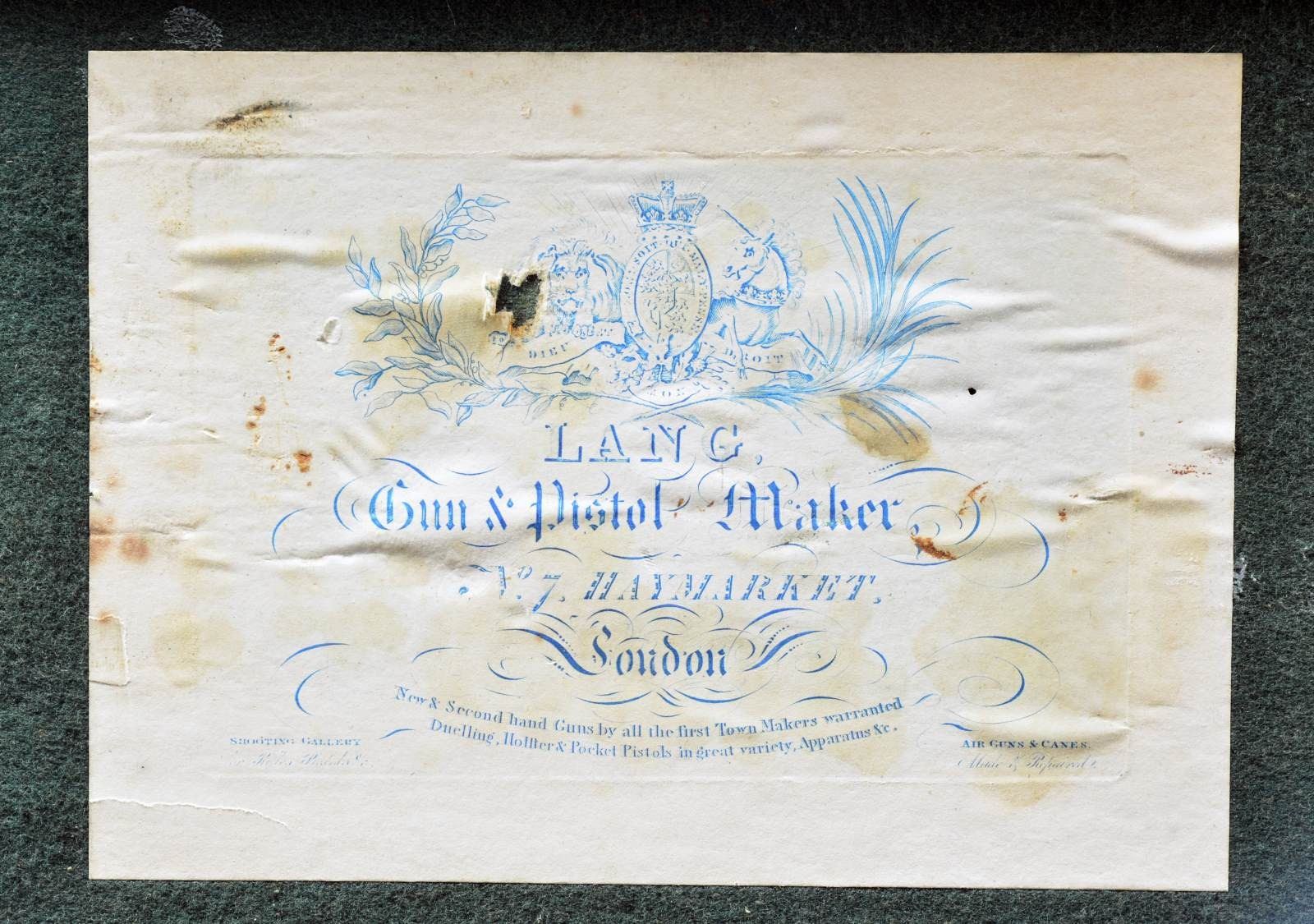 EARLIEST GUN RECORDED IN FACTORY RECORDS IN HIGH ORIGINAL CONDITION W/ ORIGINAL MAHOGANY CASE & FINE ACCESSORIES. Cal. 12 Ga. S# 979. Bbls. 30". Surviving records at Joseph Lang start in 1858 at S# 2085. Earlier guns are mentioned in the records, probably added when the weapons came in for inspection or work. This rifle, #979 is the earliest by far. The next number recorded after this is 1565. This is a 12 bore dbl. rifle (groove diameter .775) w/ 10 groove rifling w/ 1 turn in approx. 50" for rnd. ball. 30" Twist bbls. are engraved "JOSEPH LANG, HAYMARKET LONDON" on rib fitted w/ 1 standing 2 folding leaf V-notch rear sight marked for 50, 150, & 200 yds. A silver bead front sight is also dovetailed through. Bottoms of bbls. are stamped w/ London black powder proofs for 13 bore, S#, & bbl. forgers initials "TP". Original brass tipped ebony ramrod is held by 2 plain pipes, rear w/ sling eye. Patent breeches are nicely filed & engraved w/ shell on rib extension & are fitted w/ vented platinum plugs. Breech iron w/ integral fences is very nicely engraved w/ swags of shaded scroll. Case hardened front spring locks w/ back sliding safeties are fitted w/ serpentine hammers filed similar to those by Thomas Mortimer & later, Alexander Henry. Locks & hammers are engraved in very well cut large open scroll. "Joseph Lang" is in arched device on each lockplate & hammers have stylized dolphin heads. Trigger plate has stylized pineapple finial scroll engraved to match thimble. Blued trigger guard has more open scroll on bow & grip is formed by checkered spur. S# is at rear on tang behind spur. Stock of dense stump figured & nicely streaked European walnut measures 14 1/8" over blued steel buttplate w/ more scroll engraving on long top tang. Stock features a very nicely carved double shadow line right hand cheekpiece w/ ogee transition from face to stock. Squarish checkering w/ mullered borders is at grip. There is an oval silver escutcheon at top grip. A sling retaining button is on toeline. Stock attaches to bbls. w/ sliding captive bolt through engraved oval steel escutcheons. WEIGHT: 9 lbs. 3 oz. UNATTACHED ACCESSORIES: rifle is housed in its original figured mahogany case w/ brass D ring handle & dual brass hook closure. Case is lined in green cloth & has blue printed paper Lang label in lid. Accessories include a steel rnd. ball mold marked "No. 10" casting a .775 diameter ball by Davis, sm. leather covered "Sykes Patent" powder flask w/ brass top throwing a charge of up to 2 3/4 g, rosewood handled nipple wrench, walnut handled turnscrew along w/ brass jag & pointed bullet starter of brass that fit tapped hole in the end of ramrod. Also included is a sm. brass screw which will plug this hole. There is also a tin of Eley Bros. percussion caps. CONDITION: very fine as partially refinished, most likely by the factory when gun was entered into the ledger. Bbls. retaining over 90% of their correct brown refinish w/ good definition to pattern over some scattered dark stains. Breech iron & locks retain over 80% of their original case hardening color w/ some scattered brown stains. Trigger guard retains nearly all of a reblue also probably done by Lang's. Buttplate retains approx. 70% of its original bright charcoal blue w/ some brown stains on edges. The staining on this rifle appears to have happened all at the same time & is most likely the reason for refinishing of bbls. & trigger guard. Stock finish, virtually unaltered since the rifle was made, is very dry w/ slightly raised grain, some scattered stains & some minor marks, the exception being a 1/2" long ding on right side of butt. Bores are very fine, bright & shiny w/ a few scattered pits toward muzzles. Locks are crisp. Exterior of case retains most of what appears to be its original varnish, folding part of D-ring handle is missing & brass is considerably tarnished to green. Hooks & key escutcheon are still relatively bright. Lock & keeper are intact, interior cloth is good w/ some mildew, rubs & soiling. Label is still relatively bright w/ light brown foxing, a few scattered stains & a couple of rubs. 1 Rub goes through to cloth, corresponding to hammer screw. Interior partitions are good, a bit loose but have never been moved. Bullet mold is still relatively bright w/ heat discoloration at ball cavity. Flask has some scuffs in leather & cleaning of brass. Other accessories are very good. These heavier rifles, 12 bore & up, are seldom found in fine condition as many were used in the far regions of the British empire. A very interesting rifle made by James Purdey's son in law. (01-18140/MGM23). ANTIQUE. $5,000-9,000.