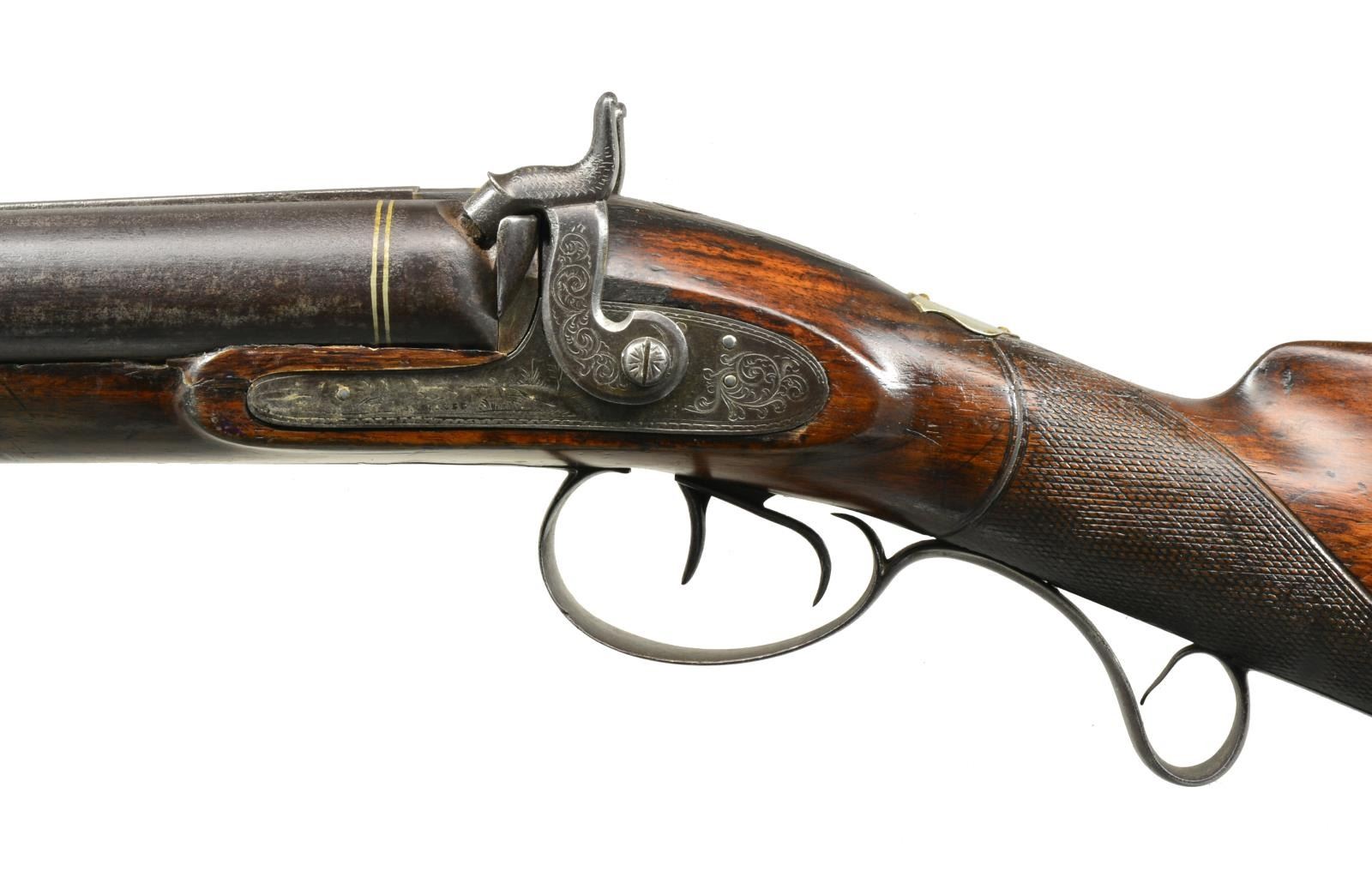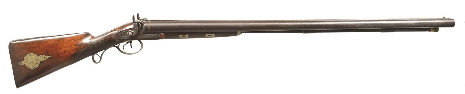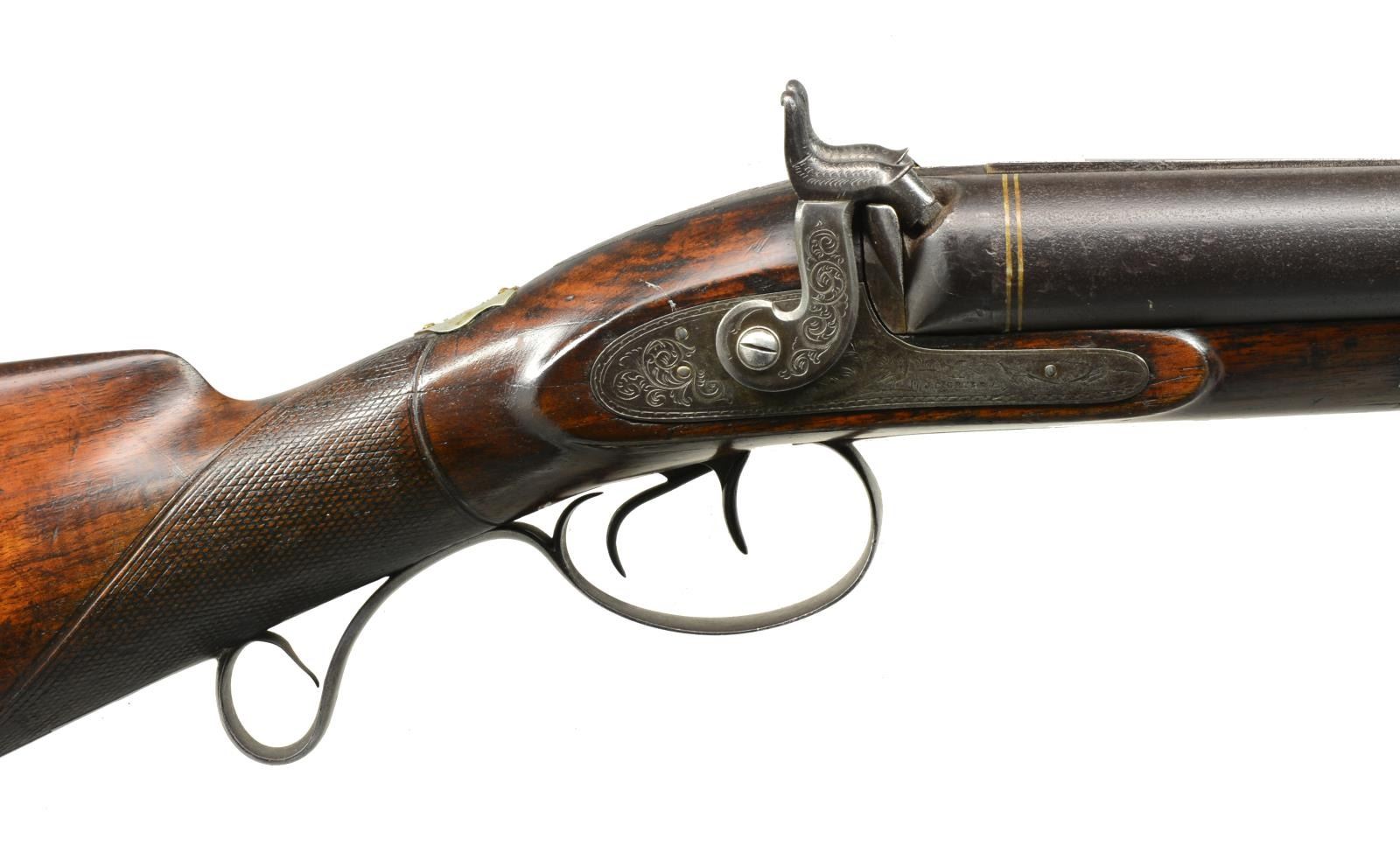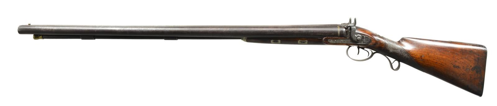 Cal. 8 Bore (.860). NSN. Bbls. 36" of stub twist steel having Birmingham proof marks. Lg. brass bead. Dbl. platinum bands at breech. "J. C. Grubb" marked locks have engraved scenes featuring pheasants w/ scroll highlights & fancy borders. Scroll engraving continues to hammers, standing breech and fancy finial trigger guard. Half length straight grip walnut held by 2 bolts w/ German silver escutcheons & engraved nose cap. Stock features a checkered wrist w/ German silver thumb shield marked "M. G. / 2". Right side of stock has an engraved German silver circular lid patch box. LOP: 14 1/8" w/ steel shotgun butt. Brass tipped ebony ramrod held by 2 plain iron pipes. Weight: 16 lbs., 6 oz. CONDITION: metal has mottled gray brown appearance w/ light pitting. Stock has added varnish over wear & handling marks w/ cracks & repaired chips around locks. Left lock is not functioning properly. Dark pitted bores. (01-18082/DS). ANTIQUE. $900-1,500.