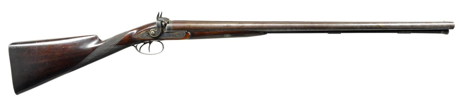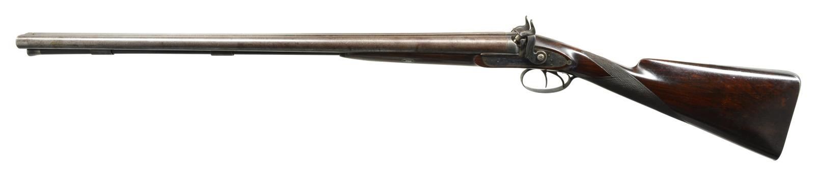 BY J. FISHER OF NEW YORK. Cal. 12 Bore. NSN. John Fisher worked in New York City between 1841 & 1850. As evidenced by this high quality gun, he was a very accomplished maker. 29" High quality Damascus bbls. are engraved "J. Fisher New. York." on broad concave rib. Bbl. flats are stamped w/ London black powder proofs. An ebony ramrod w/ steel tip & brass tail (worm under tail) is held by 2 plain pipes. Breech iron w/ integral fences is case hardened & very nicely scroll engraved. Front spring locks w/ flat faced serpentine hammers are engraved w/ sprays of well cut shaded scroll at tails & nicely detailed game scenes toward front; dogs are pointing birds on both sides. "J. FISHER" is at the front of each lockplate. Lockplates are held in stock by usual screw as well as secondary screws at tails into wood, a seldom seen feature. Stock appears to be of American walnut measuring 14" over blued steel buttplate w/ long scroll engraved top tang. Widely spaced point pattern checkering is at grip. Trigger plate has stylized pineapple finial & blued trigger guard has dog scene on bow. Bbls. attach to stock w/ side bolt through oval steel escutcheons. Bore diameters: left - .739, .000 (cyl), right - .736, .000 (cyl). Wall thickness: left - .032, right - .038. DAC: 1 1/2". DAH: 2 5/16". Cast is neutral. LOP: 14". WEIGHT: 8 lbs. 1 oz. CONDITION: bbls. retain 60-70% original brown w/ fine definition to pattern w/ some scattered staining done by cleaning. Locks & other case hardened parts retain over 85% of their color. Buttplate & trigger guard retain most of their original blue. Stock has nearly all of its original oil finish w/ a number of scratches & marks. Bores are shiny w/ some frosting toward muzzles. Locks are crisp. Rear portion of rib has lifted for about 3". An attractive American gun. (01-18142/MGM37). ANTIQUE. $800-1,500.