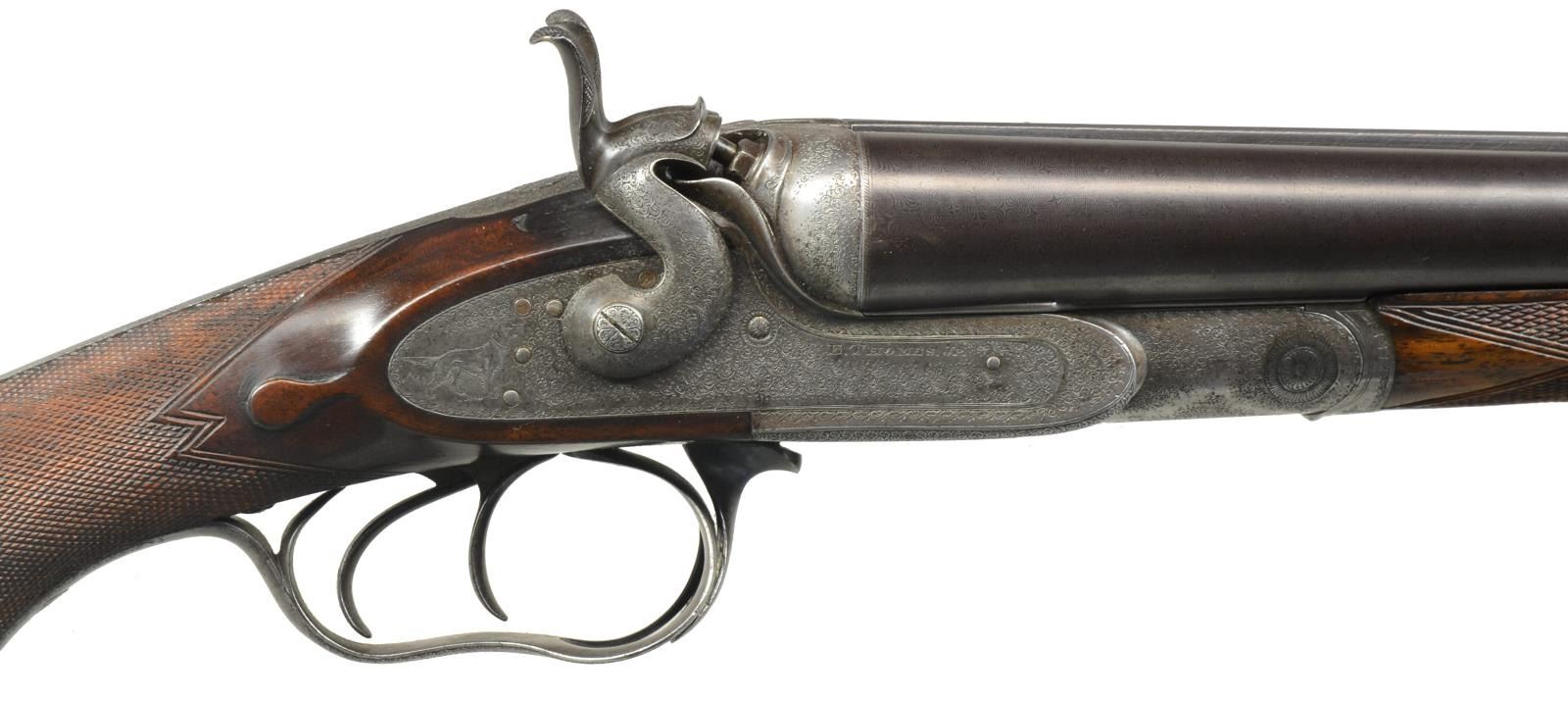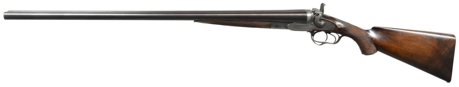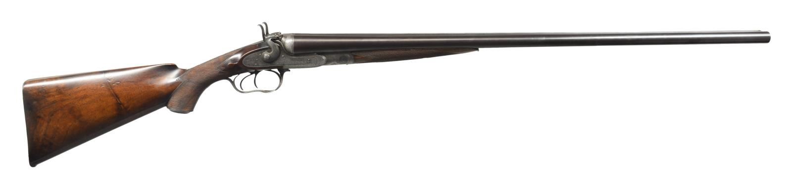 CHICAGO W/ BBLS. BY THOMAS L. GOLCHER OF PHILADELPHIA. Cal. 12 Ga., 2 3/4". NSN. Bbls. 30". This gun looks like a collaboration between 2 very high quality makers & incorporates many of the best known patents of the age. 30" Very high grade Damascus bbls. are engraved "Barrels by Tho. L. Golcher No 116 W. Gerard Ave. Philadelphia PA." on concave game rib w/ square shouldered doll's head extension. There are no other marks on bbls. except "LE" on bottom of left bbl. Finely made action incorporates Purdey under bolting system operated by thumb lever, w/ access through trigger guard bow. Lever also actuates a sliding dovetailed bolt which engages rib extension in a manner similar to that used by D.M. Lefever in his early guns. Action is fitted w/ front spring side locks w/ rnd. bodied serpentine hammers. Action is nicely filed & engraved w/ 90% coverage, very nicely cut miniscule scroll w/in line & scroll borders. This scroll surrounds some game scenes w/ portrait of spaniel retrieving snipe on bottom of action & nicely detailed pointing pointer at rear of left lockplate & alert setter on right. Steel trigger guard has tang that extends to engraved steel grip cap. Buttstock appears to be of somewhat figured dense American walnut & measures 14" over engraved steel skeleton buttplate. Stock also features drop points & closely spaced point pattern checkering at grip. Matching splinter forend w/ inlet steel tip has Deely type release which engages broad hooked loop similar to that found on guns by H. A. Lindner. MEASUREMENTS: BARRELS: Bore diameter: R .726 L .727. Restriction: R .022 (MOD) L .023 (MOD). Min. Wall Thickness: R .035 L .032 STOCK: LOP: 14". DAC: 1 3/4-". DAH: 2 5/8". Cast: Neutral. WEIGHT: 8 lbs. 13 oz. CONDITION: good as partially refinished. Bbls. retaining most of an old rebrown, pattern visible but quite dark. Action & locks have traces of original color where protected, but are mostly silver gray. Engraving still sharp & clear. Stocks w/ old oil refinish over numerous marks & dents, checkering recut. There is a bump at toe which has bent buttplate & somewhat dented wood. Bores are fine, shiny w/ some scattered light pitting. Left bbl. breech end 11" from bottom there is a dent. Action is tight, locks are good, right hammer is a bit loose. (01-18407/MGM96). ANTIQUE. $1,200-1,800.