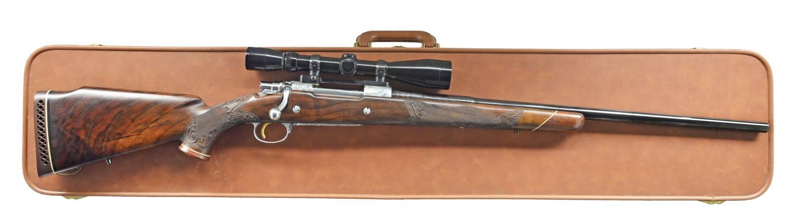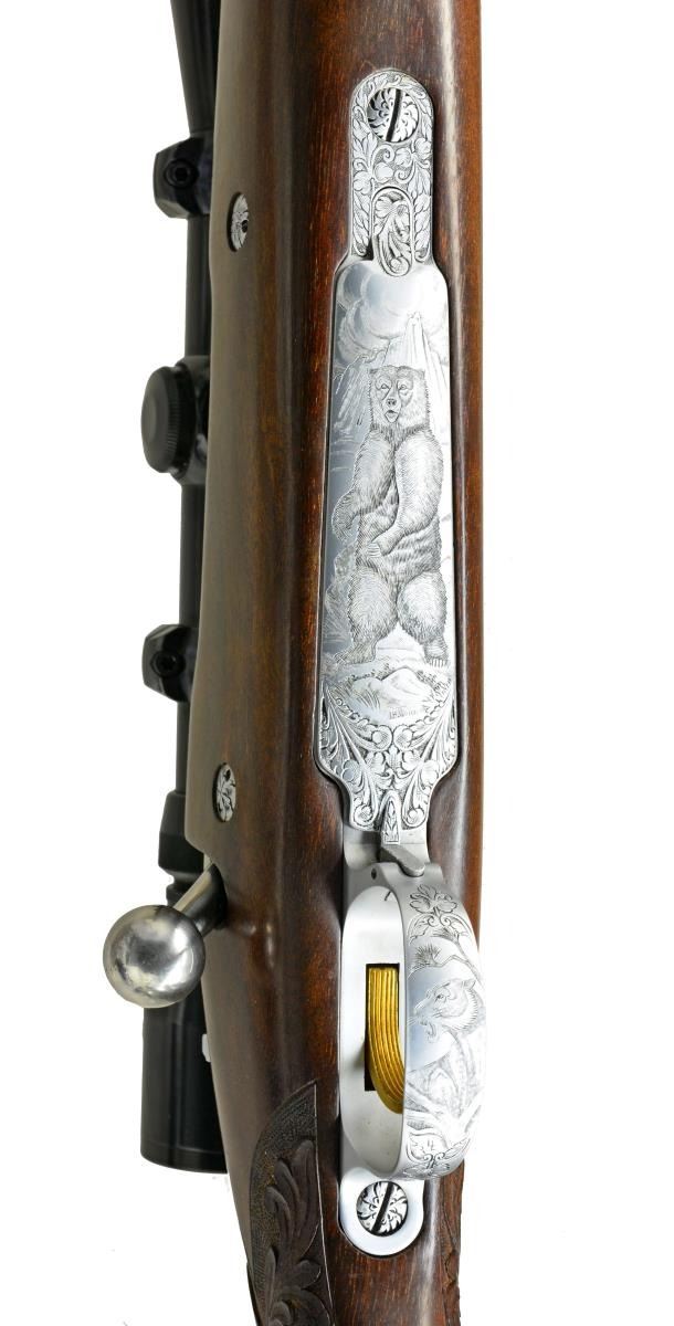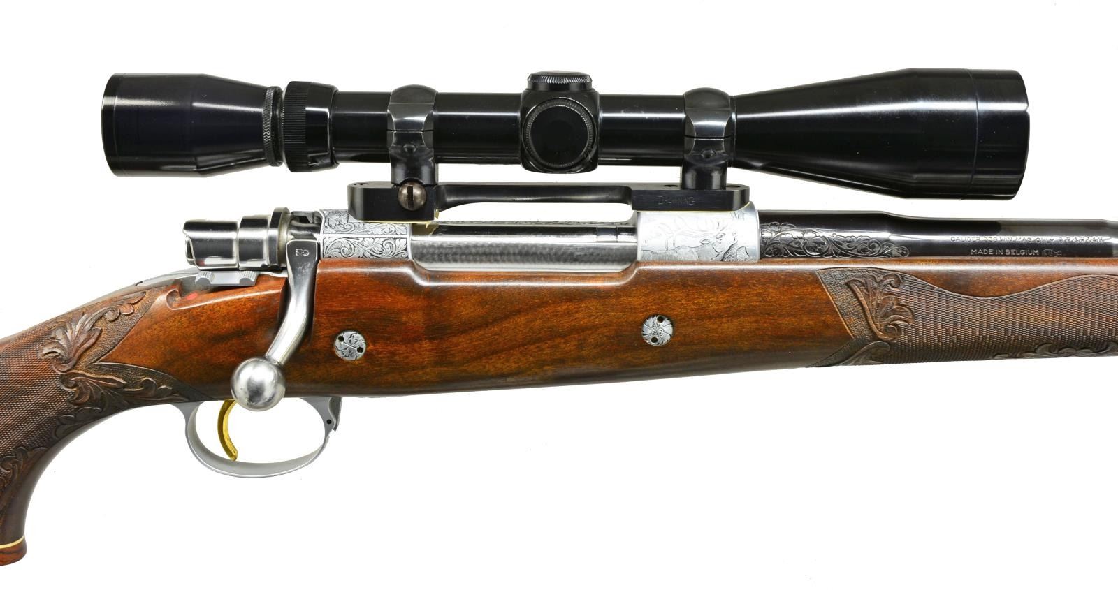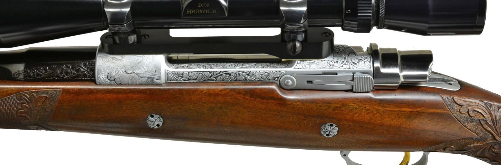 GRADE BOLT RIFLE IN .338 WIN. MAG. W/ LONG EXTRACTOR, SCOPE & CASE. Cal. .338 Win. Mag. S# 9P49148. Bbl. 24". These scarce & desirable rifles were the top of the Browning line. They were made in a lg. variety of calibers w/ magnum calibers being fairly scarce. This 1969 production rifle has a 24" medium weight bbl. marked on right side w/ cal., S#, & “MADE IN BELGIUM”. There are 2 1/4" flourishes of well cut semi relief shaded acanthus scroll on breech end. Matte coin finished action w/ bright polished bolt, gold plated trigger & steel bottom metal w/ hinged floorplate is of the scarce long extractor variety. Receiver ring, floorplate, & trigger guard bow are engraved w/ big game animals suitable for this heavy cal. w/ moose in swamp on left side of ring, bugling elk on right, & standing grizzly bear w/ mountains in background on floorplate. Balance of action & floorplate are engraved w/ shaded acanthus. Trigger guard bow depicts a snarling puma. Moose & bear scenes are signed by noted Browning engraver, J. Baerton. Puma scene is signed w/ initials "L.L." Oil finished stump figured American walnut pistol grip stock measures 13 3/4" over brown Browning white line pad. Stock features slight Monte Carlo, swept right hand cheekpiece, rosewood grip cap & forend tip w/ white line spacers. Gold rectangle in bottom of grip cap engraved “C.A.S.”. Stock is also fitted w/ 2 engraved recoil bolts. Checkering at grip & forend is very closely spaced & flanked at front & rear by relief carved acanthus scroll in stippled outline. Rifle is mounted w/ Browning 3-9x scope w/ crosshair reticle in steel Browning rings & 1 piece Browning base. UNATTACHED ACCESSORIES: rifle is housed in tan Hartman case lined in faux fur containing instruction manual, hang tag & a key. Factory letter supports rifle as found w/ oil finish, engraved initials, & cal. Also included are 5 photocopied pictures of this rifle. CONDITION: “collector” grade, close to "as new" w/ a sm. number of minor handling & assembly marks in all fine factory finishes. Bright shiny bore, mechanically crisp. There is some flaking of gold on left side of trigger. Scope w/ some very slight marks, optically clear. Case is also very fine w/ a couple of minor rubs on exterior, compressions & very light soiling of interior fur. (20-4086/MGM). CURIO. $7,000-9,000.