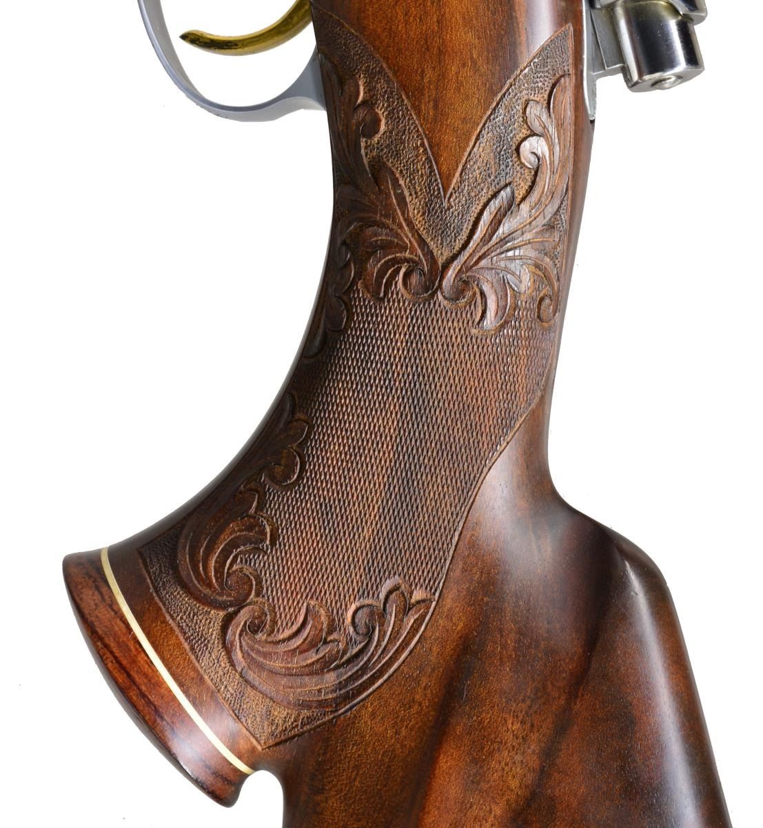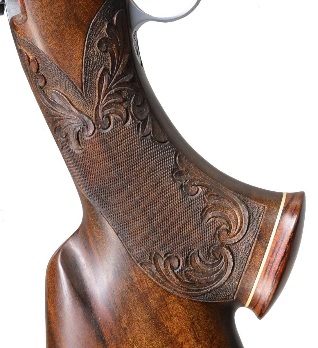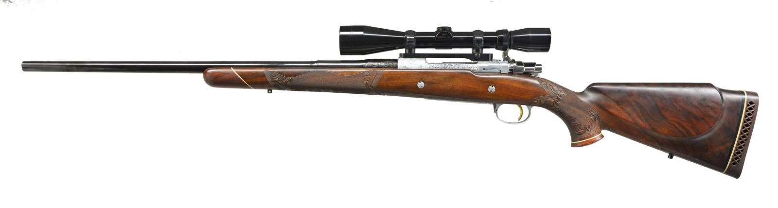 GRADE BOLT RIFLE IN .338 WIN. MAG. W/ LONG EXTRACTOR, SCOPE & CASE. Cal. .338 Win. Mag. S# 9P49148. Bbl. 24". These scarce & desirable rifles were the top of the Browning line. They were made in a lg. variety of calibers w/ magnum calibers being fairly scarce. This 1969 production rifle has a 24" medium weight bbl. marked on right side w/ cal., S#, & “MADE IN BELGIUM”. There are 2 1/4" flourishes of well cut semi relief shaded acanthus scroll on breech end. Matte coin finished action w/ bright polished bolt, gold plated trigger & steel bottom metal w/ hinged floorplate is of the scarce long extractor variety. Receiver ring, floorplate, & trigger guard bow are engraved w/ big game animals suitable for this heavy cal. w/ moose in swamp on left side of ring, bugling elk on right, & standing grizzly bear w/ mountains in background on floorplate. Balance of action & floorplate are engraved w/ shaded acanthus. Trigger guard bow depicts a snarling puma. Moose & bear scenes are signed by noted Browning engraver, J. Baerton. Puma scene is signed w/ initials "L.L." Oil finished stump figured American walnut pistol grip stock measures 13 3/4" over brown Browning white line pad. Stock features slight Monte Carlo, swept right hand cheekpiece, rosewood grip cap & forend tip w/ white line spacers. Gold rectangle in bottom of grip cap engraved “C.A.S.”. Stock is also fitted w/ 2 engraved recoil bolts. Checkering at grip & forend is very closely spaced & flanked at front & rear by relief carved acanthus scroll in stippled outline. Rifle is mounted w/ Browning 3-9x scope w/ crosshair reticle in steel Browning rings & 1 piece Browning base. UNATTACHED ACCESSORIES: rifle is housed in tan Hartman case lined in faux fur containing instruction manual, hang tag & a key. Factory letter supports rifle as found w/ oil finish, engraved initials, & cal. Also included are 5 photocopied pictures of this rifle. CONDITION: “collector” grade, close to "as new" w/ a sm. number of minor handling & assembly marks in all fine factory finishes. Bright shiny bore, mechanically crisp. There is some flaking of gold on left side of trigger. Scope w/ some very slight marks, optically clear. Case is also very fine w/ a couple of minor rubs on exterior, compressions & very light soiling of interior fur. (20-4086/MGM). CURIO. $7,000-9,000.