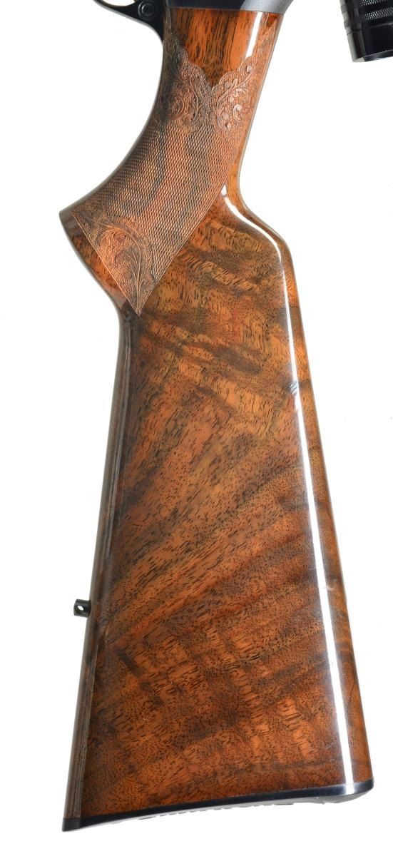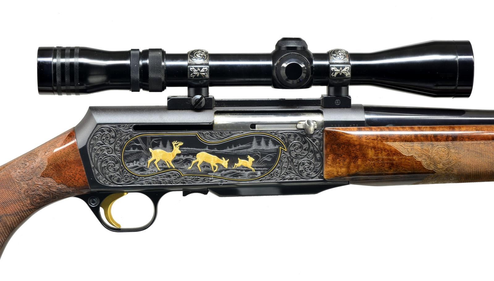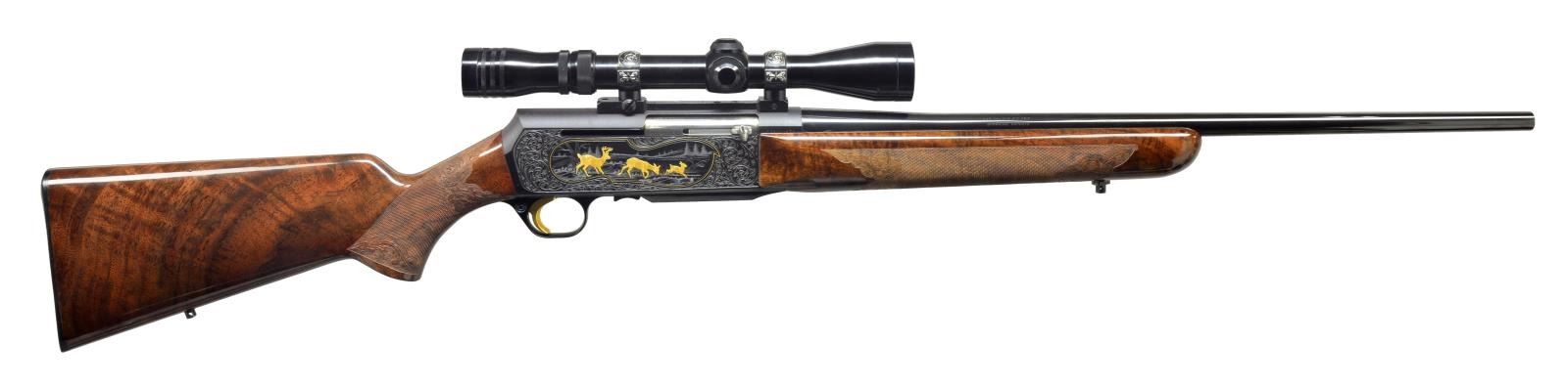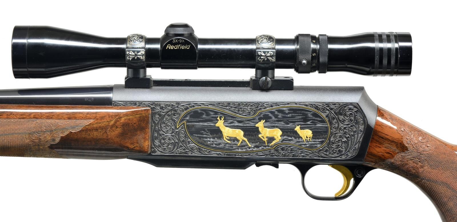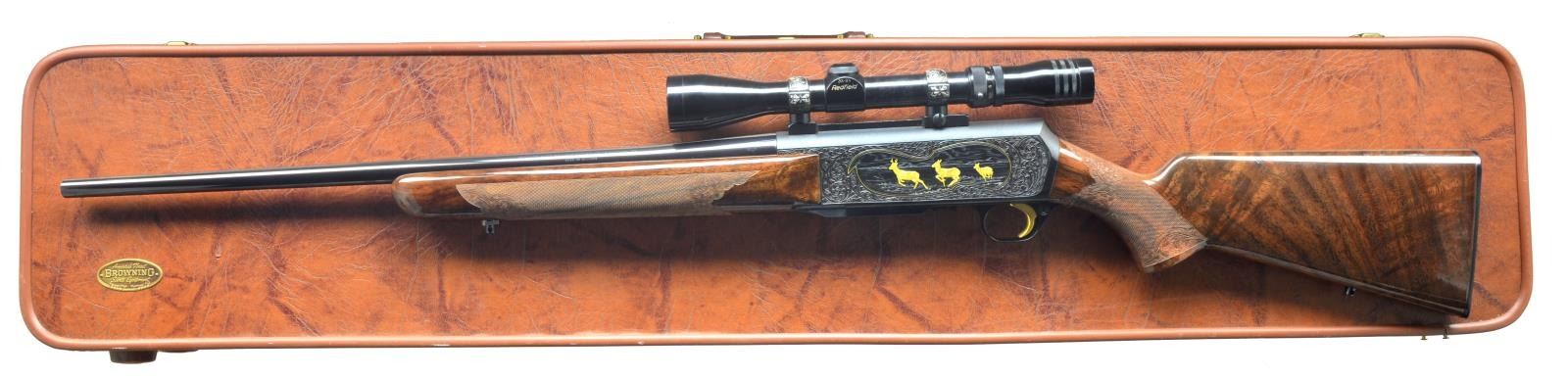 Cal. 270 Win. S# 73311M72. Bbl. 22 1/2" rnd. bbl. made w/out sights. Checkered forend & buttstock w/ carvings & sling swivels. Browning hard rubber buttplate. Attached is a Redfield style base w/ engraved rings holding a Redfield 3-9x Widefield scope. Fully engraved w/ scroll & scene of 3 gold antelope on left side & 3 gold deer on right side. Left side scene below antelope is signed by "J. Lewanczvk". A second signature in oval reads "J.M. Deprez" MAGS: 1-4 rd. UNATTACHED ACCESSORIES: brown Browning hard case w/ white fleece lining. CONDITION: bbl. retains most of its original blue w/ some minor handling marks. Wood has original finish w/ good checkering & minor handling marks. Near excellent bore. (20-1692/BT). MODERN. $5,000-7,000.