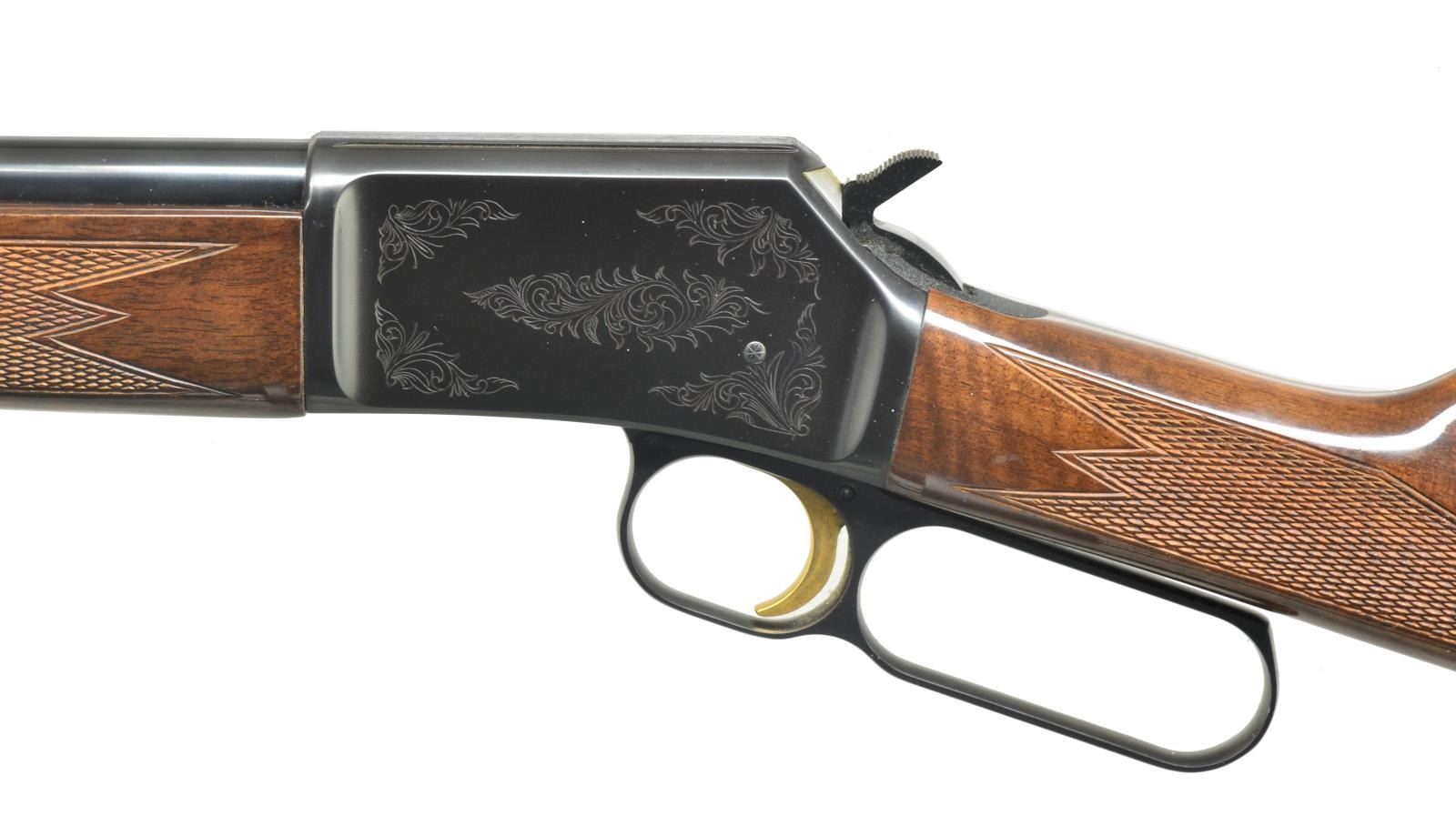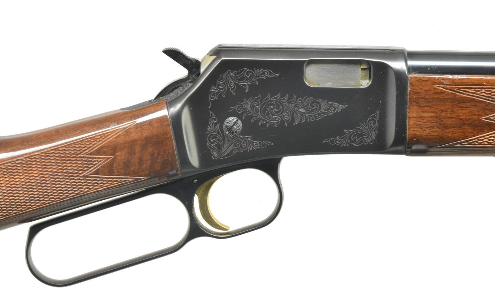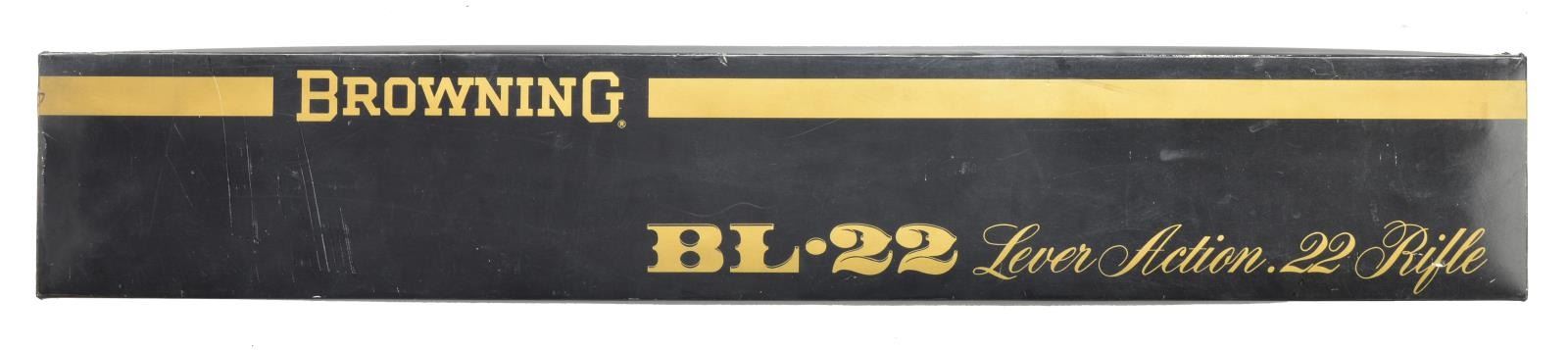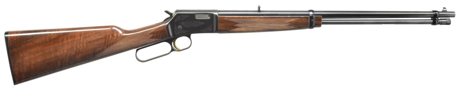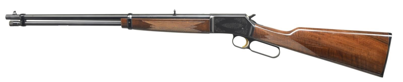 Cal. 22 LR. S# 72B72815. Bbl. 20" rnd. w/ bead front sight & folding leaf rear sight. Tubular mag. Action features a short throw lever, gold finished trigger, scroll engraving & tip off scope grooves. Blue finish. Forearm & straight grip stock w/ original buttplate of gloss finished walnut w/ cut checkering. Mfg. in Japan. UNATTACHED ACCESSORIES: black 2 piece box w/ mismatched serial number. Box contains operation manual & Browning pocket catalog. CONDITION: 98% original blue. Original wood finish shows sm. scattered scratches & marks. Bright near excellent bore. (20-2269/DS). MODERN. $350-550.