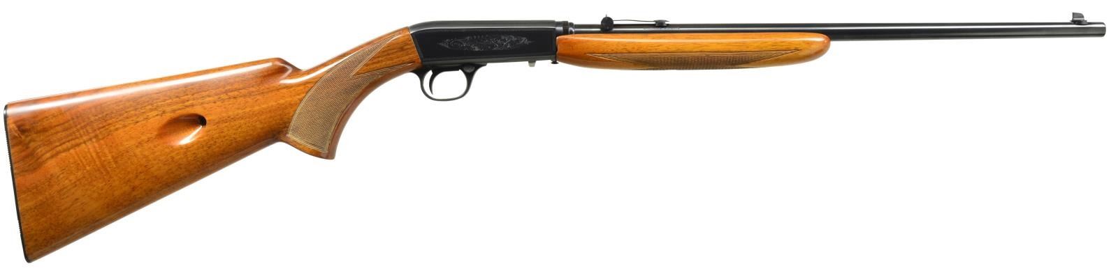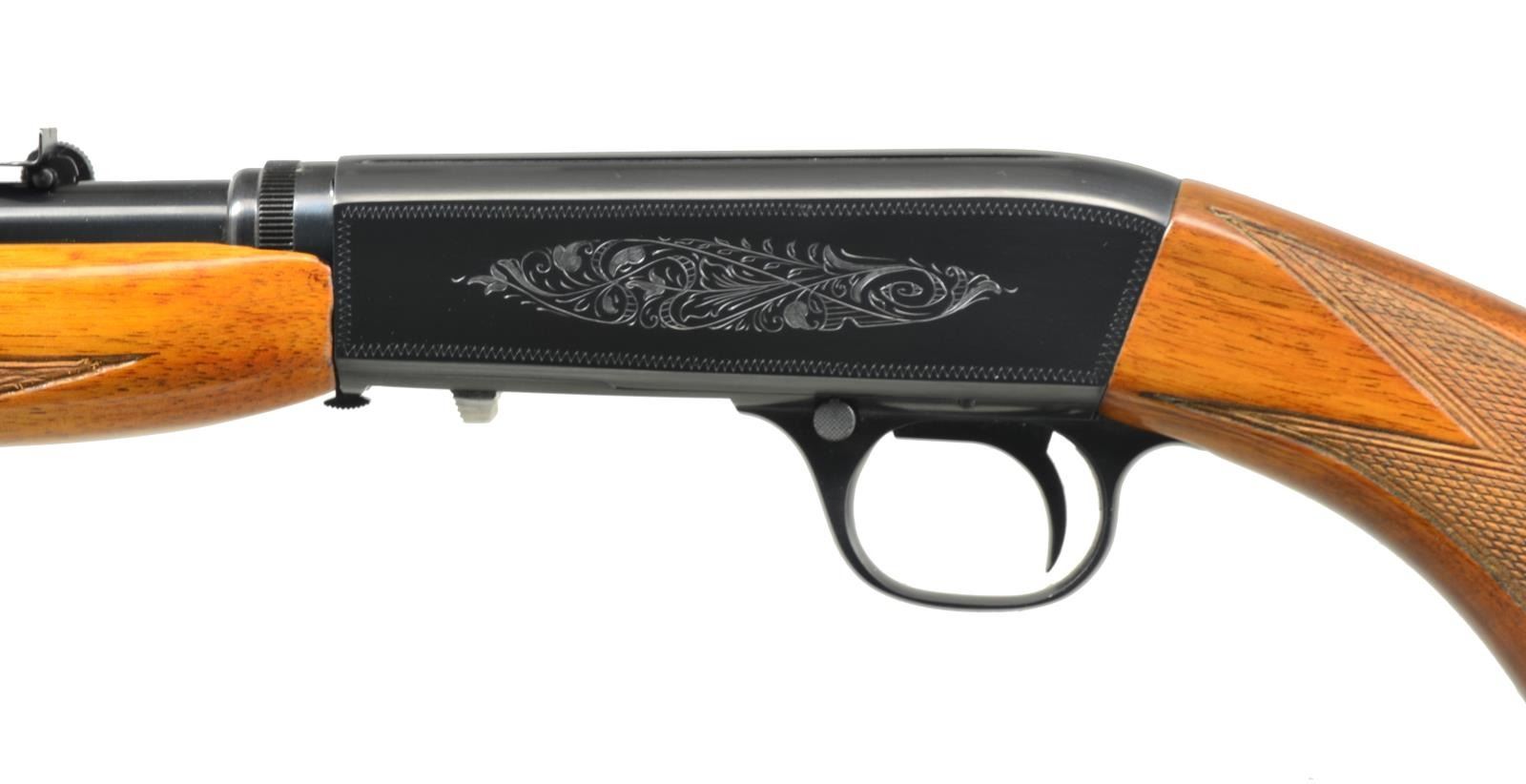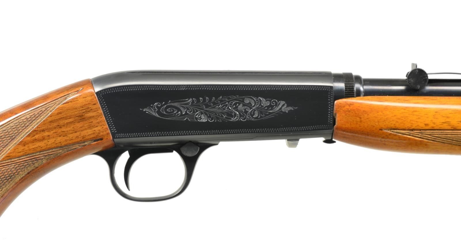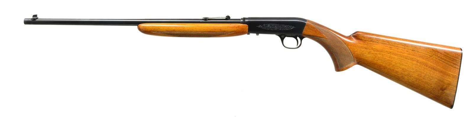 RIFLE. Cal. 22 LR. S# T55287. Bbl. 19 1/2" rnd. w/ blade front sight & wheel adj. rear sight. Bottom ejection takedown action w/ blue finish & scroll engraving. Trim beavertail forearm & pistol grip stock of gloss finished walnut w/ hand checkering & steel buttplate. Mag. tube inserts through buttplate & loads through right side of stock. T Prefix on S# indicates Belgium mfg. 1956-1961. CONDITION: 99% original blue. Very good original stock finish. Bright bore has sharp rifling. PROVENANCE: From the Frederic W. Thrane Collection. (20-2446/DS). CURIO. $700-1,000.