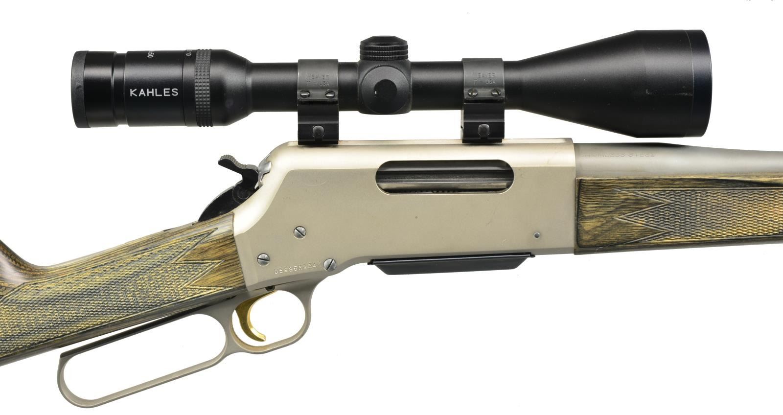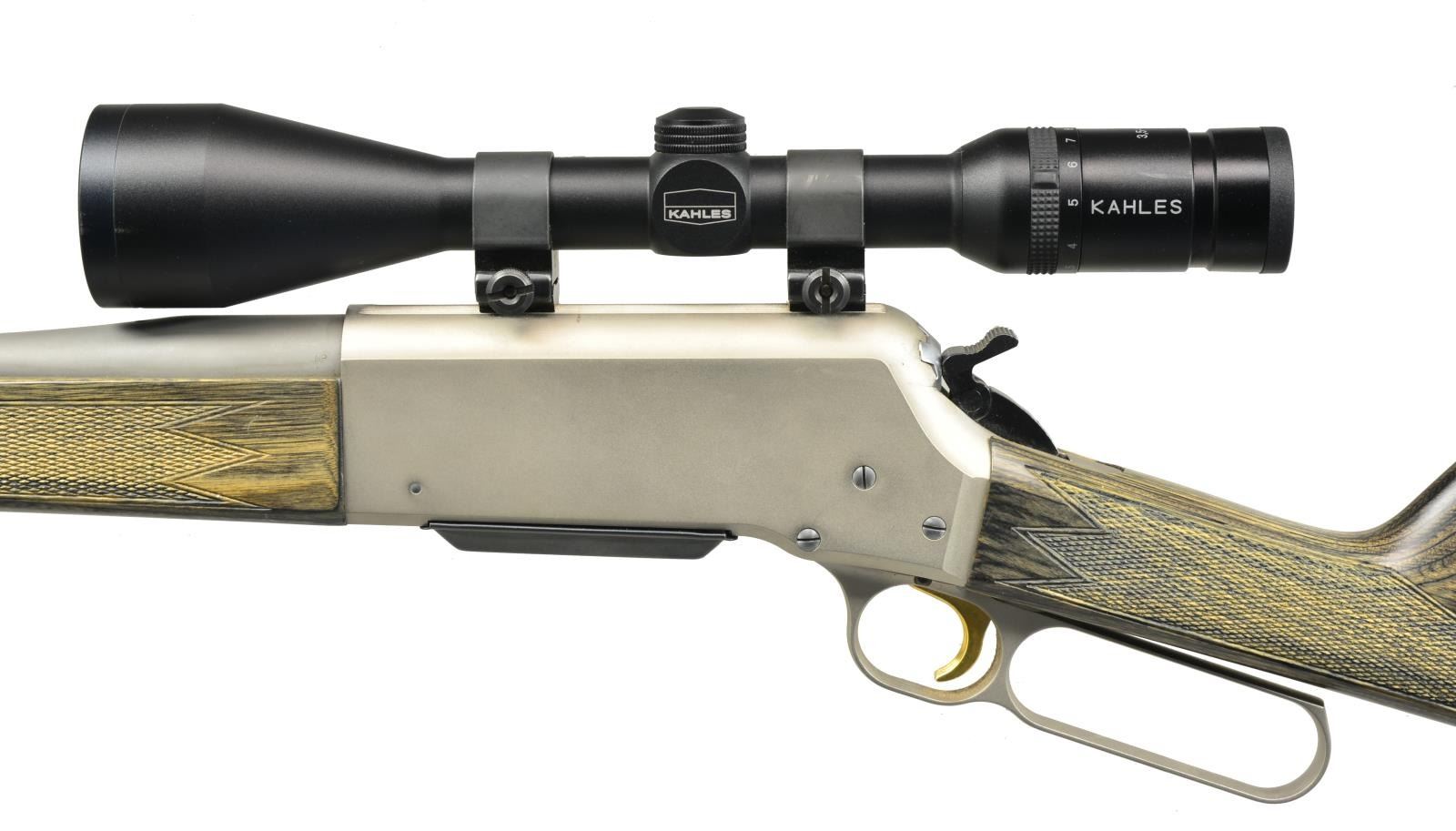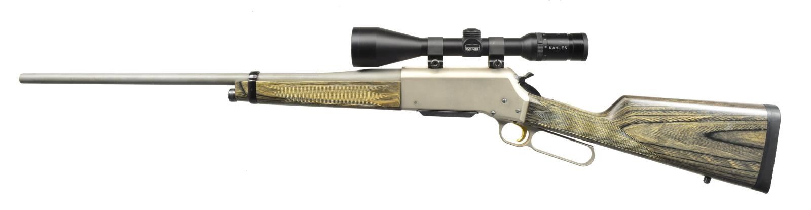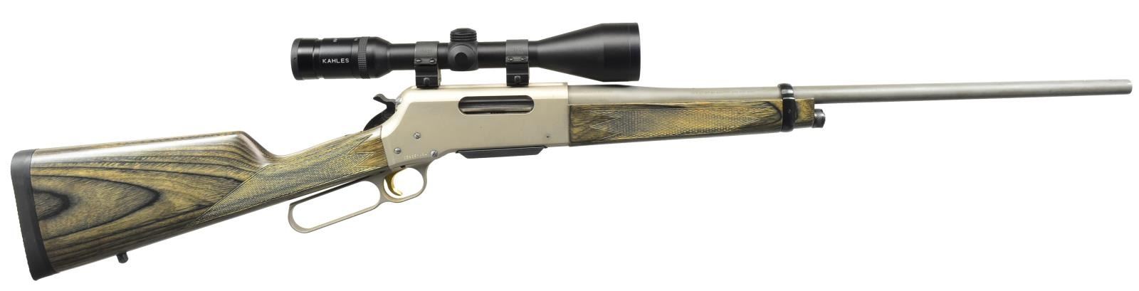 Cal. 270 WSM. S# 05935MW341. Bbl. 22" stainless steel rnd. w/ sights removed. Matte finished alloy action. Gold finished trigger. Band fastened forearm & straight grip stock of green/gray laminated wood w/ cut checkering & swivel bases. Front swivel is removed. LOP: 13 7/8" over solid black Browning pad. Kahles 3.5-10x50 matte finished scope w/ duplex reticle on Weaver rings. 2004 Mfg. MAGS: 1 detachable 3 rd. CONDITION: 97% metal finish showing light staining & sm. handling marks. Wood has very good finish. Bright near excellent bore. (20-2883/DS). MODERN. $800-1,200.
