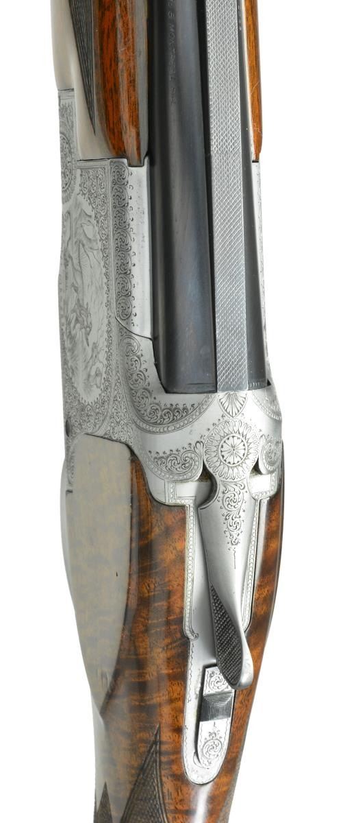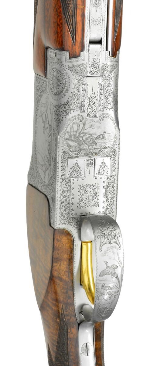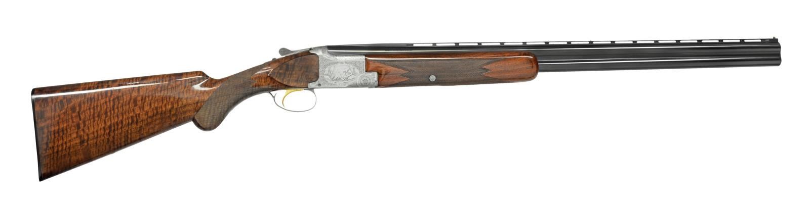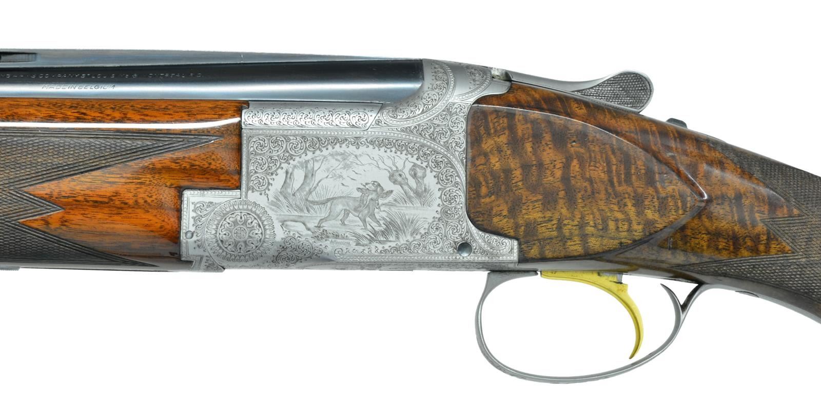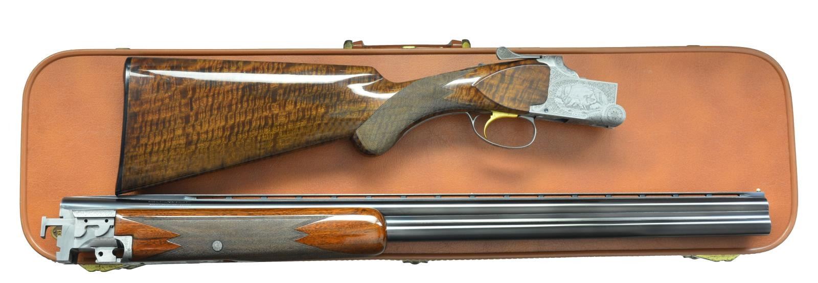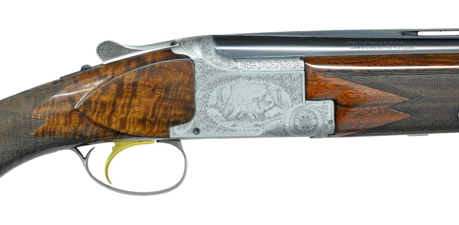 SET O/U SHOTGUN. Cal. 12 Ga., 2 3/4". S# 23202S4. Bbls. 28" VR w/ fixed Skeet & Skeet chokes. Ivory front & mid beads. Coin finished boxlock action w/ full coverage Pointer grade engraving signed by Belgium Master Engraver A. Marechal. Engraving consists of vignettes w/ setter retrieving a duck on left, pointer w/ pheasant on right, partridge on floorplate & pheasants on trigger guard bow. Scenes are surrounded by full coverage arabesque scroll & fancy beaded borders. Original Lightning forearm of gloss finished walnut having wrap around hand checkering. Browning replacement rnd. knob long tang stock of gloss finished fancy walnut w/ hand checkering having tight fiddle figured grain & vivid color contrasts. LOP: 14 1/4" over Browning buttplate. DAC: 1 5/8". DAH: 2 5/8". WEIGHT: 8 lbs. 1964 Belgium mfg. UNATTACHED ACCESSORIES: Purbaugh sub gauge 20, 28 & 410 Skeet tube set. Tubes are stored in black Naugahyde case w/ extractors & tools. Gun is stored in a Browning Hartmann takedown luggage case containing black envelope w/ instructions & wide trigger shoe. CONDITION: over 95% original bbl. blue. Action has lightly worn coin finish showing spots of staining. Forearm has worn checkering w/ good finish. Stock shows scattered scratches & marks. Very good bores. (20-127/DS). CURIO. $4,000-5,500.