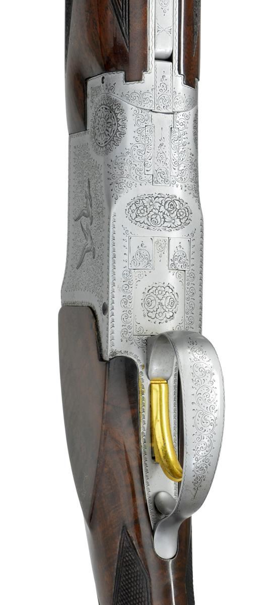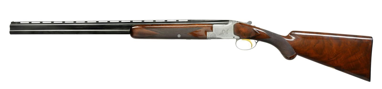 GUN. Cal. 20 Ga., 3”. S# 43528V7. Marked for IC & Mod chokes, bbls. measure 26 3/8”, fitted w/ narrow matted ventilated ribs. All correct factory markings are on top along w/ “MADE IN BELGIUM”. Small sized coin finished Browning OU action features gold plated single selective trigger. Action engraved in usual “pigeon” style w/ attractive vignettes of pigeons flying through a field of nicely cut scroll on sides. Rose bouquet highlights are on bottom & fences are nicely relief carved in oak leaf motif. Short tang, rnd. knob buttstock of nicely crotch figured American walnut measures 14 1/4” over composition Browning buttplate. Point pattern checkering is at grip & gold oval on toeline is engraved “RLW”. Field type forend matches well. Chokes still measure IC & Mod. DAH: 2 3/8”. DAC: 1 9/16”. WEIGHT: 6 lbs. 6 oz. CONDITION: very fine retaining over 95% original finishes on wood & metal. Gun tests positive for salt using the silver nitrate test. Stocks & associated metal have salt damage at base of top tang either side of top lever w/ some rusting of metal & bubbling of stock finish. There is some crazing of varnish finish, mostly at toe & some chips plus marks at grip. Bright shiny bores. Mechanically fine. (20-520/MGM45). CURIO. $3,000-5,000.