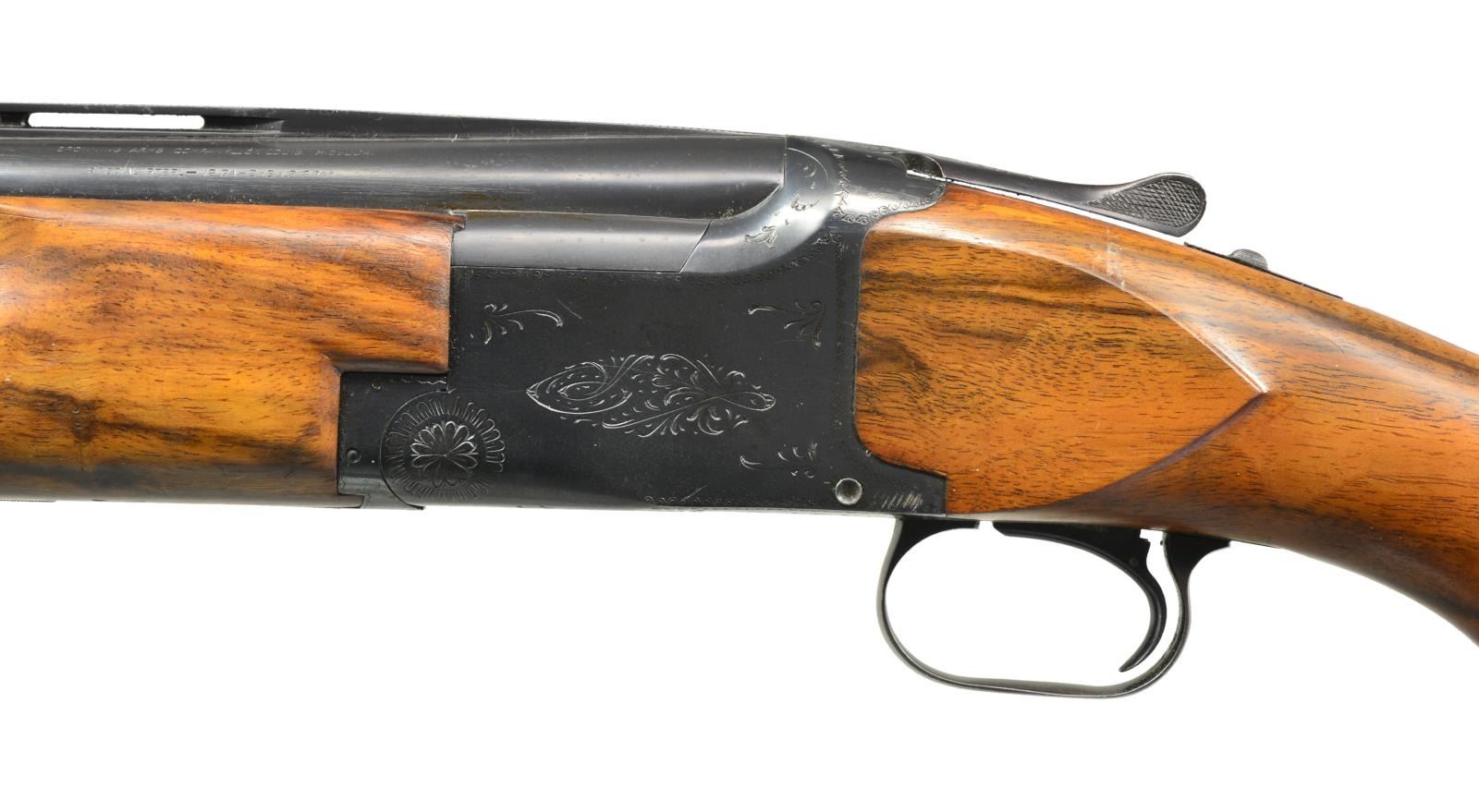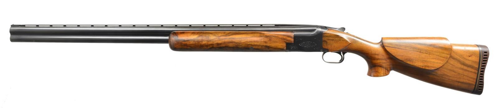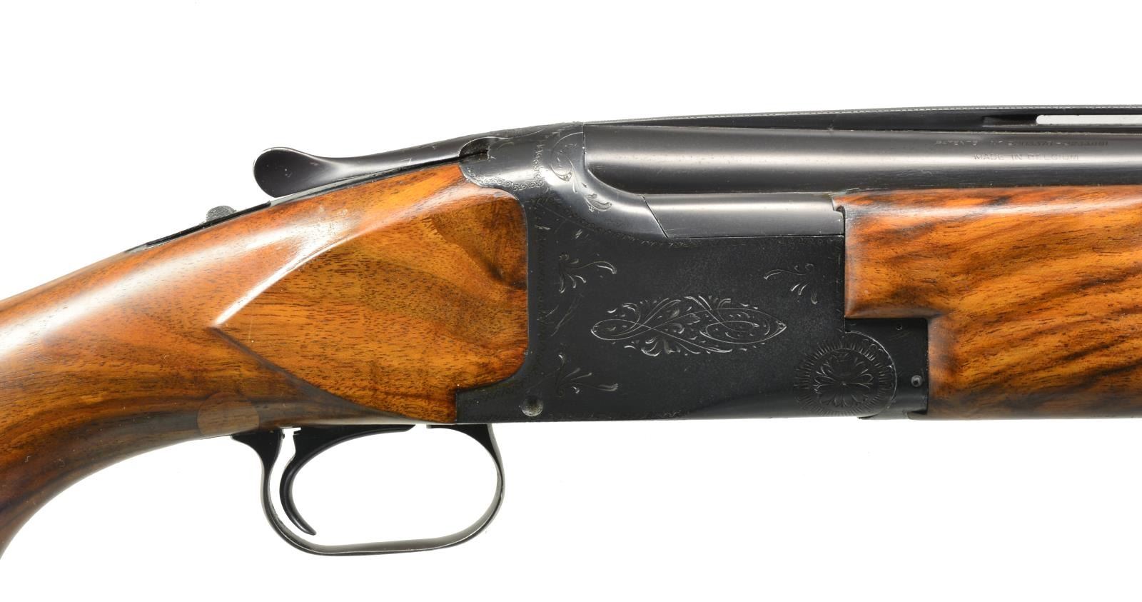 Cal. 12 Ga., 2 3/4". S# 288C5. Bbls. 30" VR w/ fixed Mod. & Full chokes. Steel front bead. Blued boxlock action w/ scroll engraving. SST. Selective ejectors. Custom target style forearm & Monte Carlo cheekpiece pistol grip stock of nicely grained Bastgone walnut. Replacement trigger guard. LOP: 14" over Pachmayr trap pad. 1965 Belgium mfg. CONDITION: 90% reblued metal finish retaining some light pitting & showing a few handling marks. Wood shows scattered scratches & marks. Stock has an added wood repair near the back of the lower tang. Selective trigger is not shifting properly to 2nd bbl. Good bright bores. (20-2494/DS). CURIO. $500-800.