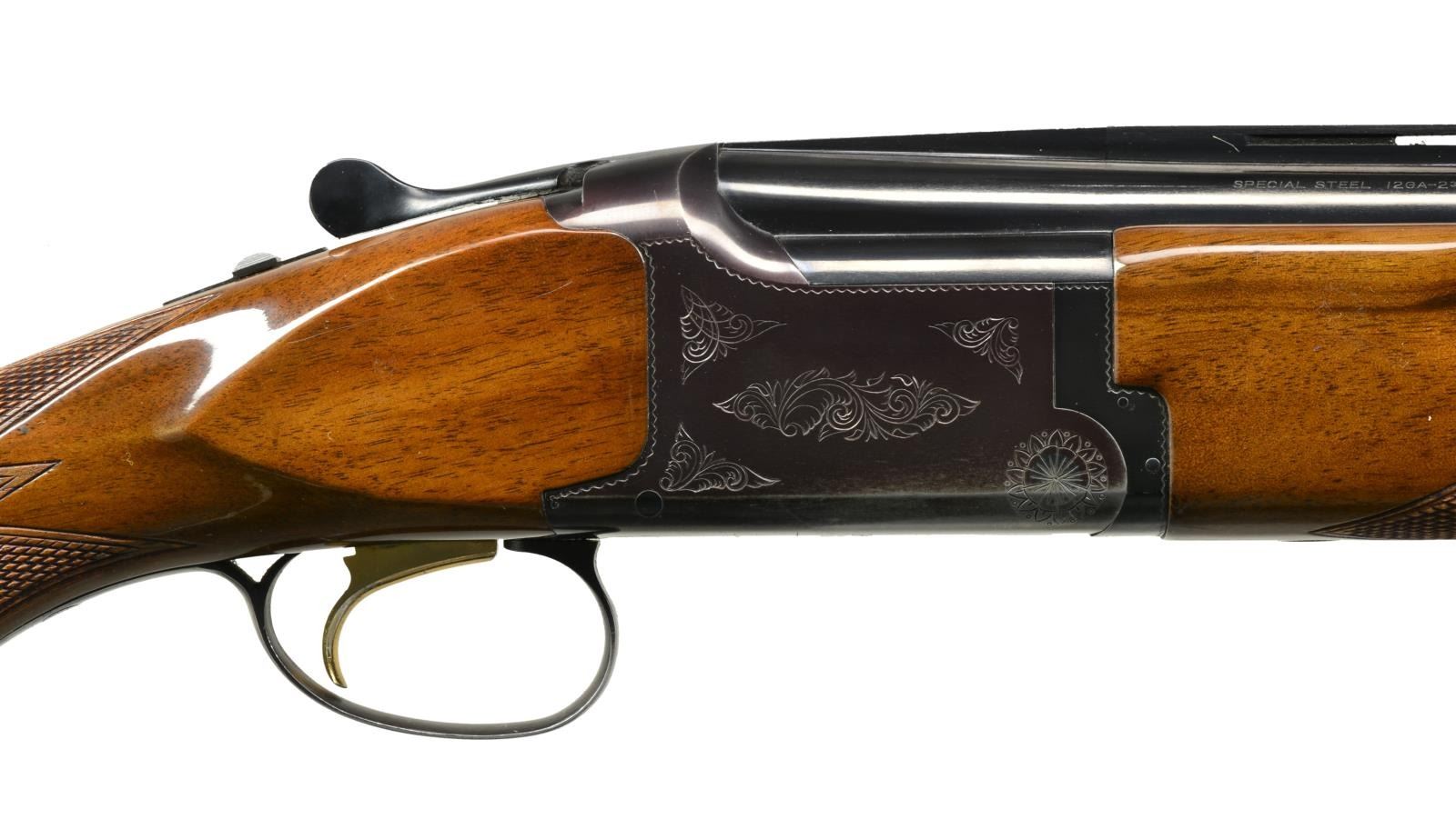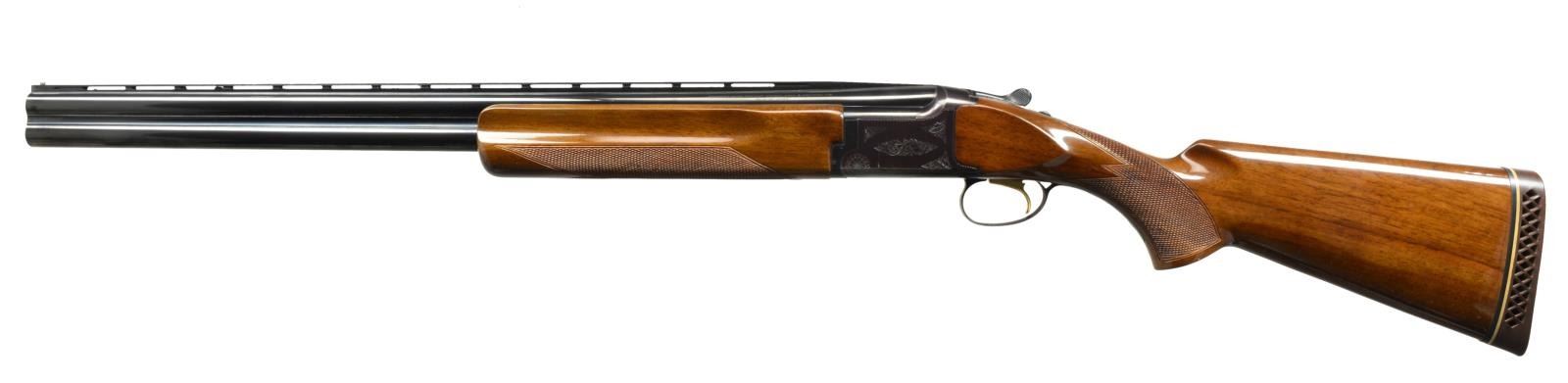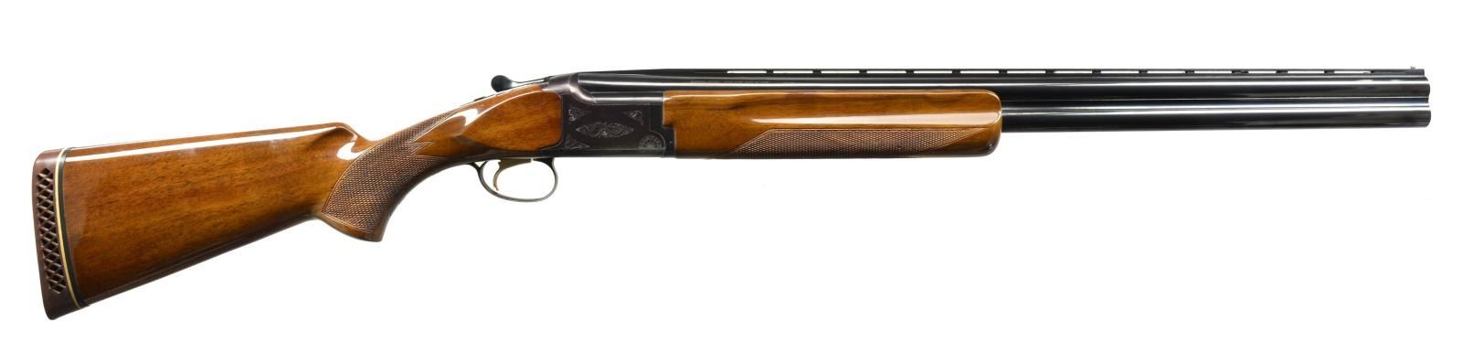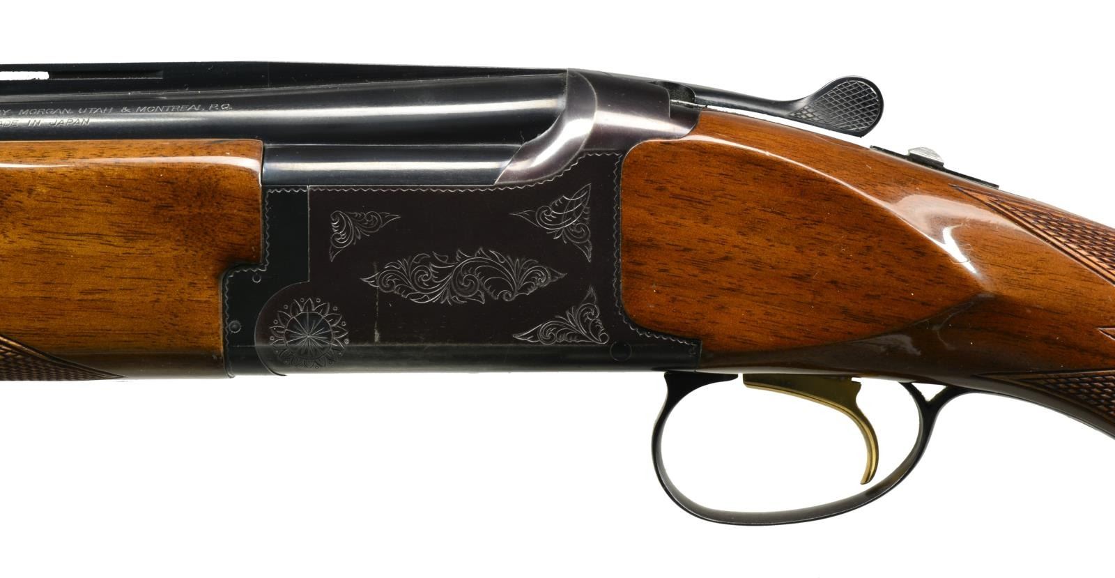 Cal. 12 Ga., 2 3/4" & 3". S# 10611PY153. Bbls. 26" VR w/ fixed Skeet & Skeet chokes. Steel front bead. Blued boxlock action w/ scroll engraving, ejectors & gold finished SST. Target style forearm & flat knob pistol grip stock of checkered gloss finished walnut. LOP: 14 1/4" over original Browning pad. CONDITION: bbls. retain over 95% blue. Action retains 80% blue w/ areas of thinning & fading to plum color. Original wood finish shows numerous scratches & marks. Sound action. Good bright bores. (20-1582/DS). MODERN. $500-700.