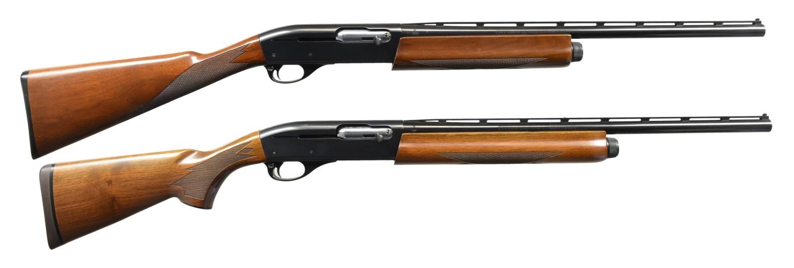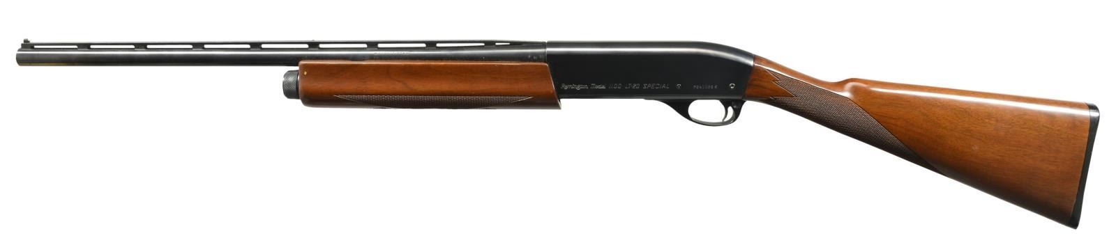 SHOTGUNS. ALL: cal. 20 Ga., 2 3/4". Bbls. 21" VR w/ Remchokes. White target front sights w/ steel mid beads. 1) LW 20 SPECIAL FIELD. S# P241026K. Full choke tube included. Gloss finished checkered walnut forearm & straight grip checkered stock w/ original buttplate. CONDITION: 97% blue showing light scratches. Wood finish shows a few sm. scratches & marks. Very good bright bore. (20-2875/DS). 2) LW 20. S# R090416K. Mod. tube included. Checkered walnut forearm & pistol grip stock w/ plastic grip cap. Youth length stock w/ LOP: 13" over Remington solid brown pad. CONDITION: over 97% blue showing wear spots on action. Very good bright bore. (20-2876/DS). ALL MODERN. $1,000-1,500.