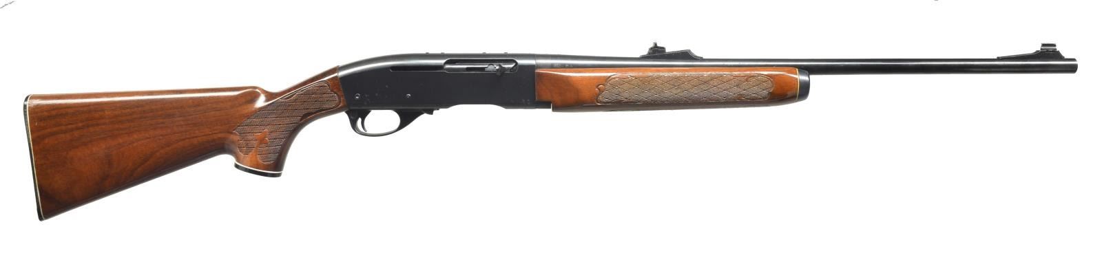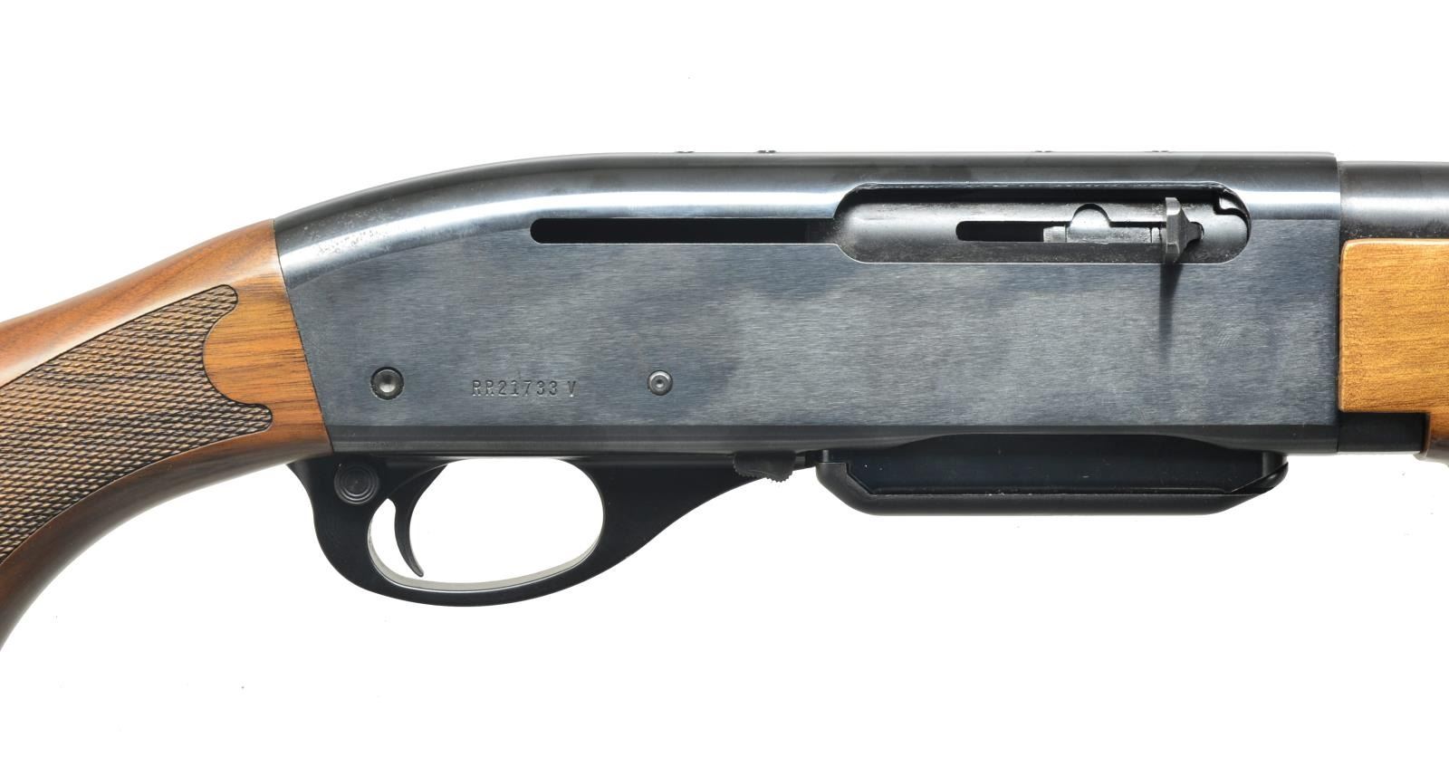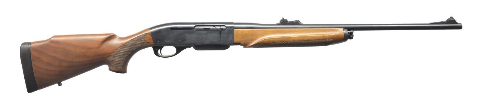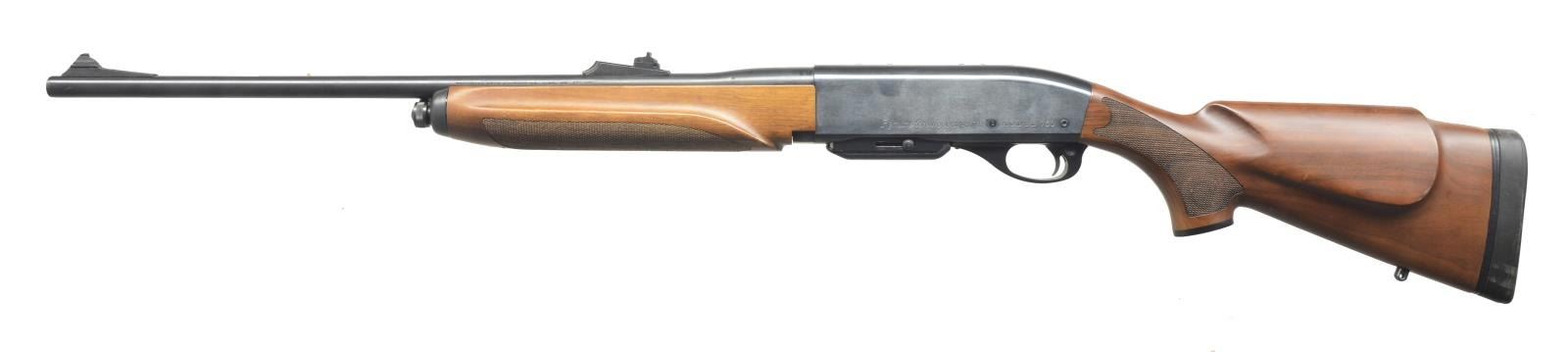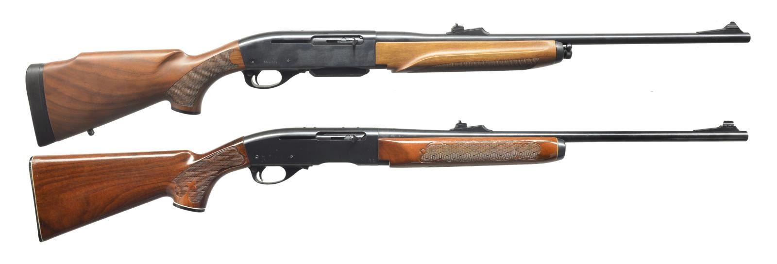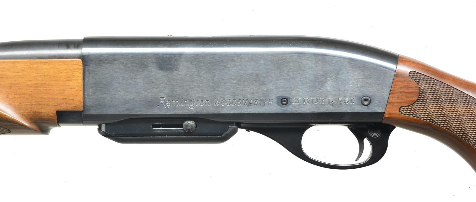 1) REMINGTON 750 WOODSMASTER. Cal. 270 Win. S# RR21733V. Bbl. 22 1/2". Screw on ramp front w/ dovetail bead sight & screw on adj. rear sight. Receiver drilled & tapped for scope base w/ filler screws. Beaver tail style forend w/ checkered bottom, lg. “R” checkered pistol grip w/ black grip cap & solid black Remington recoil pad. Left side cheekpiece. Sling swivels included. MAGS: 1-5 rd. CONDITION: bbl. has good original blue w/ a few minor handling marks. Receiver has good original blue w/ a couple spots of light surface oxidation & minor wear on sharp edges. Forend has original finish w/ good checkering. Buttstock has original finish w/ a couple light scratches & good checkering. Bottom of mag. is original blue finish w/ some blending brown patina. Bore is good. (20-3507/BT). 2) REMINGTON 742 WOODSMASTER. Cal. 30-06. S# A7425622. Bbl. 22 1/2". Screw on ramp front w/ dovetail bead sight. Screw on adjustable rear sight. Top of receiver is drilled & tapped for scope base, retaining filler screws. 3-Panel basket weave forend. Basket weave pistol grip w/ fleur-de-lis, black grip cap w/ white line spacers & black hard rubber Remington buttplate w/ white line spacers. CONDITION: bbl. retains very good original blue w/ some light spots of surface oxidation near muzzle & some fine surface oxidation over chamber. Receiver has excellent original blue w/ a few spots of fine surface oxidation & wear on sharp edges. Forend has original finish w/ some minor handling marks & good checkering. Buttstock has original finish w/ couple minor scratches & good checkering. Bore is very good. (20-3627/BT). BOTH MODERN. $750-1,000.