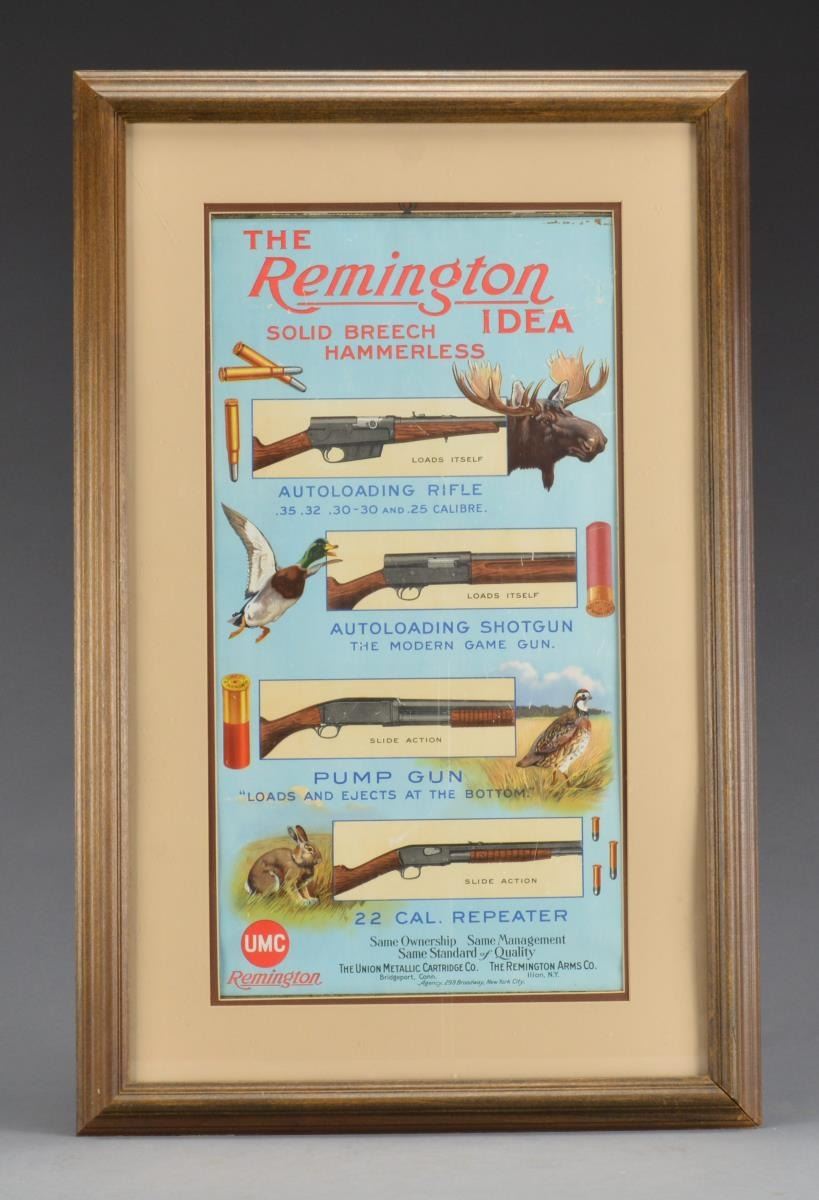 24 3/8" x 12 3/4" Poster advertising Remington firearms & ammunition. Top of poster reads "SOLID BREECH / HAMMERLESS". Top image shows the action of Rem. Model 8 autoloading rifle surrounded by 3 cartridges & portrait of lg. bull moose. Image 2 shows the action of Rem. M11 autoloading shotgun bordered by flying mallard & UMC Nitro Club shot shell. Image 3 depicts the action of Rem. M10 pump shotgun w/ UMC arrow shot shell & bobwhite quail. Bottom image depicts Rem. M12C slide action rifle w/ jack rabbit & 22 short, long & long rifle ammo. Bottom of poster has UMC & Remington logos followed by "Same Ownership Same Management / Same Standard of Quality / The Union Metallic Cartridge Co / Bridgeport, CONN / The Remington Arms Co. / Ilion, N.Y. / Agency, 299 Broadway New York City". Glass fronted wood frame sized 33 1/4" x 21 1/4". CONDITION: colors are generally bright. Post shows spots of light staining at top border w/ sm. wrinkles & tears close to edges. (02-14542/DS). $600-800.