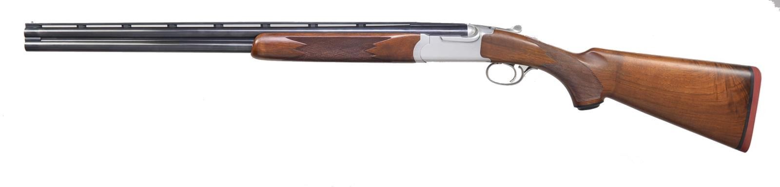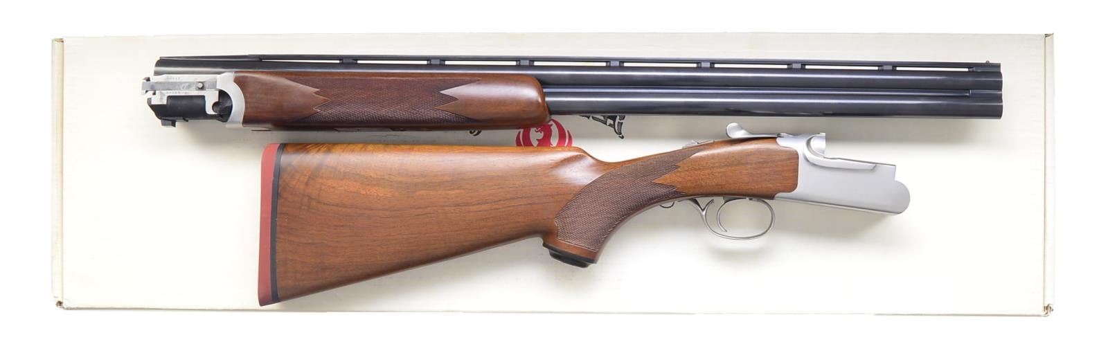 ENGRAVED "1 OF 51" ON TRIGGER GUARD. Cal. 20 Ga.,3". S# 400-13503. Standard target configuration w/ 26" fixed choke bbls. w/ side ribs & ventilated top rib. Right side of monobloc is stamped "SKEET" & "SKEET". Standard stainless steel action w/ single selective trigger has Ruger markings on bottom. Trigger guard bow engraved "1 of 51". Capped pistol grip stock is of lightly figured American walnut & measures 14 1/4" over red Ruger pad. Full skeet forend matches well. UNATTACHED ACCESSORIES: original white cardboard box w/ end label for this shotgun, containing instruction manual. Letter from Sturm Ruger & Co. indicating that this gun is "1 of 51" of the "first preproduction experimental group of 20 ga. stainless steel o/u shotguns." "These were originally produced & boxed in 1979. In January of 1985, a decision was made by the management" "to sell these units to employees & friends of the company." CONDITION: very fine w/ evidence of limited firing. Bbls. retaining over 95% blue w/ chatter marks from firing on sides under forearm. Breech face shows extractor wear. There are only the faintest handling marks in all external surfaces. Box is fine, lightly soiled. (20-1651/MGM75). MODERN. $1,500-3,000.