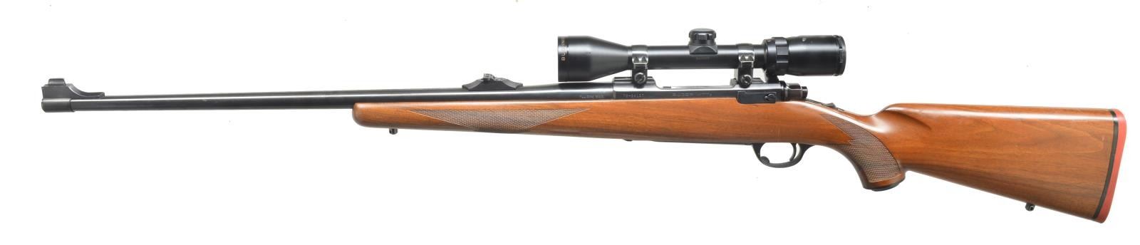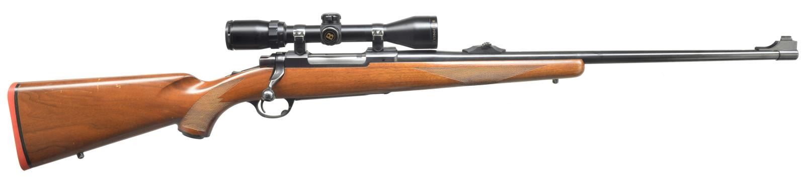 Cal. 7mm Rem. Mag. S# 70-38157. Bbl. 24” rnd. Ramp front w/ bead front sight & screw on base w/ adj. flip up rear sight. Receiver cut for Ruger rings, which are included, holding a Bushnell Banner 3-9 Scope w/ circle crosshairs. Checkered stock. Checkered pistol grip w/ black grip cap & Ruger emblem. Solid orange Ruger recoil pad. Sling swivels included. CONDITION: bbl. retains original blue w/ some minor discoloration near muzzle. Receiver has original blue w/ minor sharp edge wear. Trigger guard & floor plate have original finish w/ some minor scratches on trigger bow. Bolt has etched matching number. Bore is good. (20-4171/BT). MODERN. $600-900.