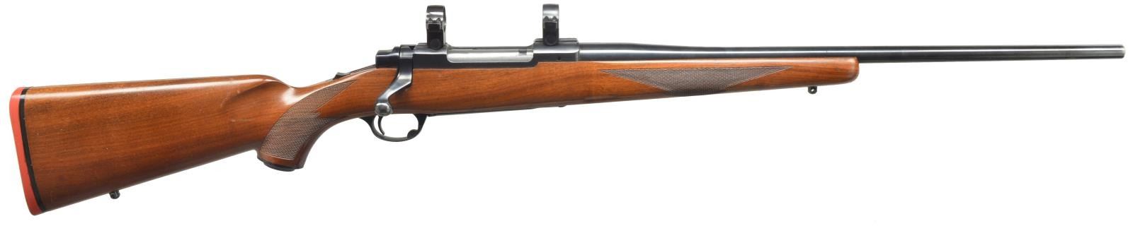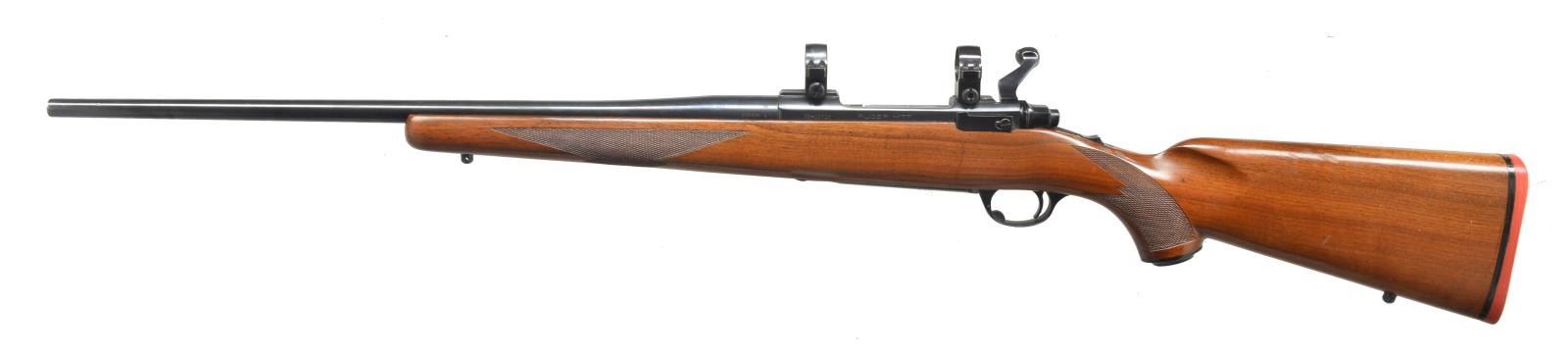 Cal. 270 Win. S# 70-25716. Bbl. 22” rnd. made w/ out sights. Receiver cut for Ruger rings installed. Checkered stock & checkered pistol grip. Black grip cap w/ Ruger emblem. Solid red Ruger recoil pad. Sling swivel studs included. Bolt has etched matching number. CONDITION: bbl. has good original blue w/ minor muzzle wear. Receiver has good original blue w/ minor sharp edge wear. Floorplate & trigger guard have original finish. Stock has original finish w/ a few minor scuff marks & tiny dings. Bore is good. (20-4160/BT). MODERN. $600-900.
