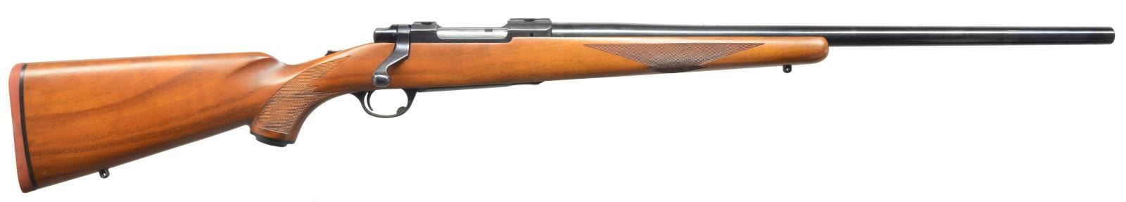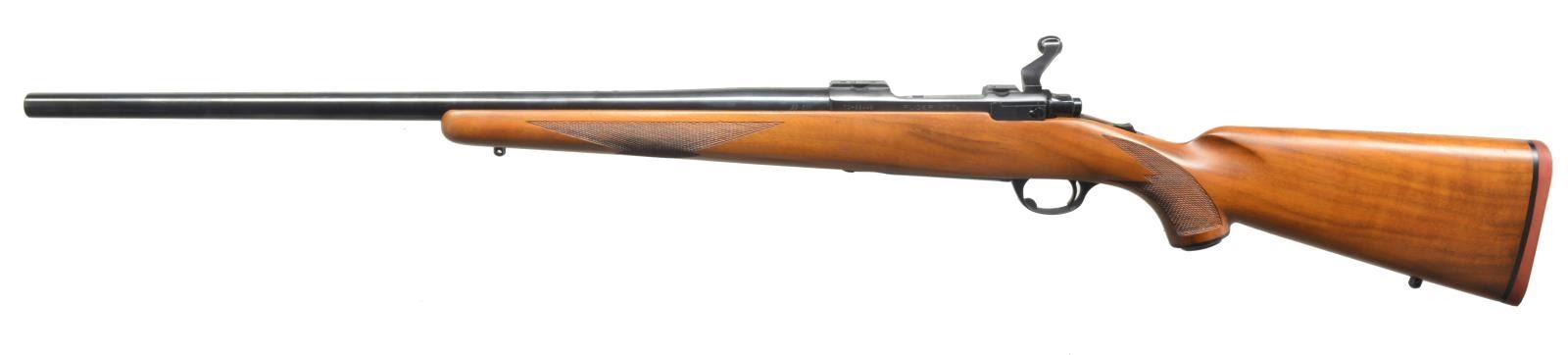 Cal. 22-250. S# 70-38449. Bbl. 24” heavy rnd. made w/ out sights. 2-Screw holes drilled & tapped w/ filler screws for scope base. Receiver cut for Ruger rings (not included). Front bridge drilled for target scope base. Checkered stock w/ checkered pistol grip. Black hard rubber grip cap w/ Ruger emblem insert. Solid red Ruger recoil pad. Sling swivel studs included. CONDITION: bbl. retains most of original blue. Receiver retains most of original blue w/ faint sharp edge wear. Trigger guard & floorplate retain original finish w/ some minor scratches on trigger guard bow. Stock has original finish w/ a few minor handling marks & good checkering. Bore is good. (20-4186/BT). MODERN. $600-900.