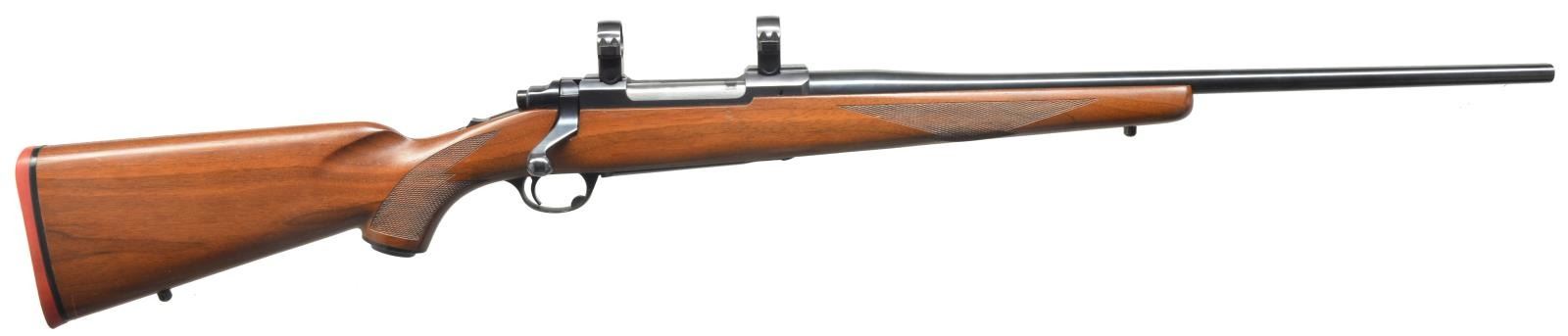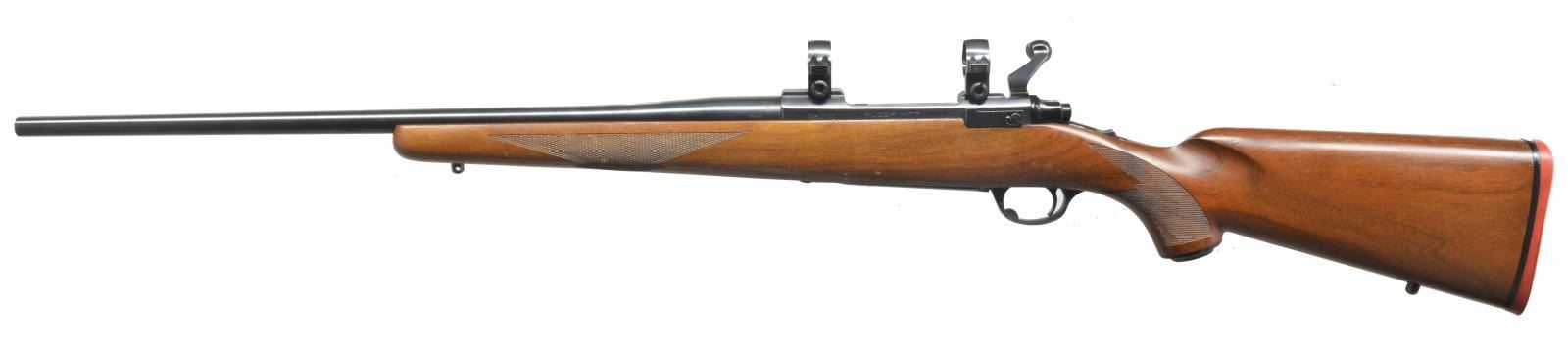 Cal. 30-06. S# 70-25467. Bbl. 22” rnd. made w/ out sights. Receiver is cut for Ruger rings that are attached. Checkered stock w/ checkered pistol grip & hard rubber grip cap w/ Ruger emblem. Solid Ruger red recoil pad. Sling swivel studs attached. CONDITION: bbl. retains most of original blue w/ minor muzzle wear. Receiver retains most of original blue w/ minor sharp edge wear. Bolt knob is slightly thinning. Floor plate has slightly faded w/ wear on sharp edges. Stock has original finish w/ some minor handling marks. Forend checkering on left side has a few flattened points. Right side is good. Pistol grip checkering is good on both sides. Bore is good. (20-4187/BT). MODERN. $500-800.