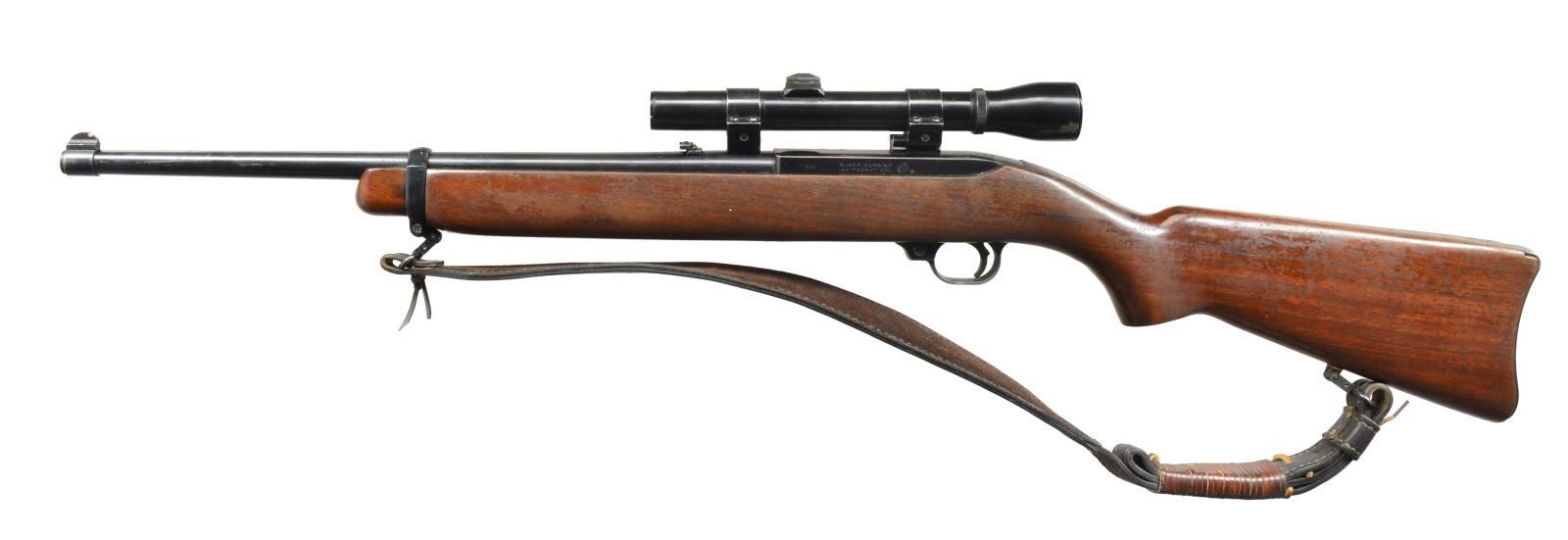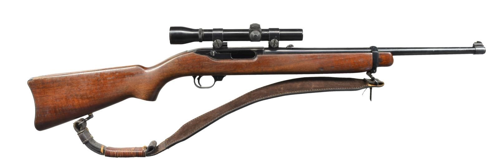 Cal. 44 Mag. S# 57221. Bbl. 18 1/2" w/ Ruger white insert front sight & folding vertical line rear. Early model mfg.1962 w/ anodized aluminum buttplate & w/out bbl. warning marks or mag. unloading button. Wide designed leather sling & Uncle Mike's detachable swivels. Weaver K3 60-C steel tube El Paso crosshair reticle scope in Weaver mounts. CONDITION: good overall appearance w/ finish wear & light marks on stock set plus noticeable wear on buttplate. Highpoint wear & scattered peppery oxidation plus light marks on bbl. Peppery oxidation on scope exterior & slight fuzz around perimeter of optics; clear cross wires. Near excellent bore. (20-2625/NW). CURIO. $450-600.