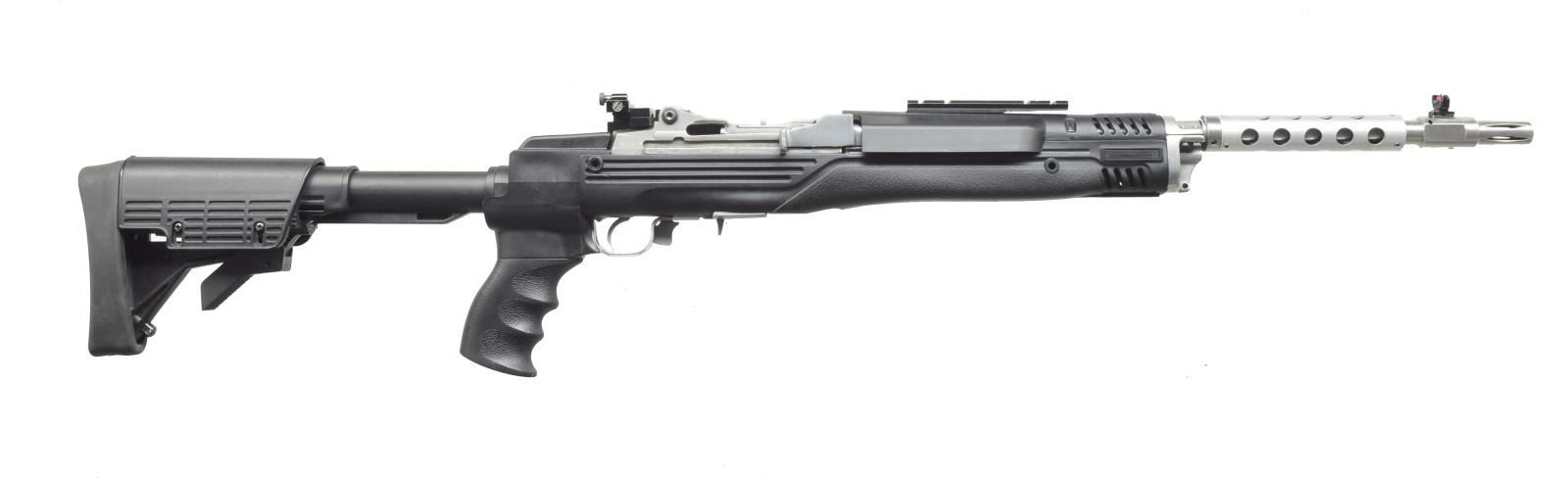 Cal. 223 Rem. S# 181-91647. Bbl. 18 1/2" w/ added slotted flash hider incorporating front sight having red bead & protective ears. Forward portion of bbl. covered w/ aftermarket ventilated heat shield. Mfg. 1980 as standard stainless rifle. Fitted w/ ATI folding stock having 6 position collapsible buttstock; adj. cheek piece, rubber butt plate & sling stud. Attached handguard fitted w/ Weaver style base for scout scope use. Rear sight replaced w/ Williams Fool Proof receiver sight. MAGS: NONE. CONDITION: about near excellent appearance w/ minor flaws: gas block missing swivel loop, scope base w/ finish marks & receiver sight missing elevation screw relying on hand adjustment & standard jib lock. Near excellent bore. (20-2519/NW). MODERN. $500-750.