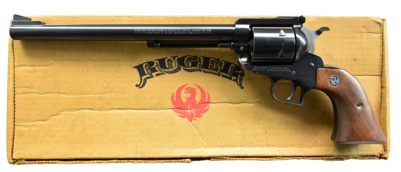 Cal. 44 Mag. S# 83-16221. Bbl. 10 1/2". Mfg. 1979 w/ standard Super Blackhawk features & unusual long bbl. w/ catalog #S-410N. Walnut grips w/ silver eagle medallions. UNATTACHED ACCESSORIES: matching numbered original brown cardboard box w/ 1 repaired corner & slight tattered appearance plus packaging. CONDITION: very good plus overall w/ faint thinning at muzzle & cyl. turn line. Small mark at bottom front of cyl. frame. (20-1510/NW). MODERN. $400-600.