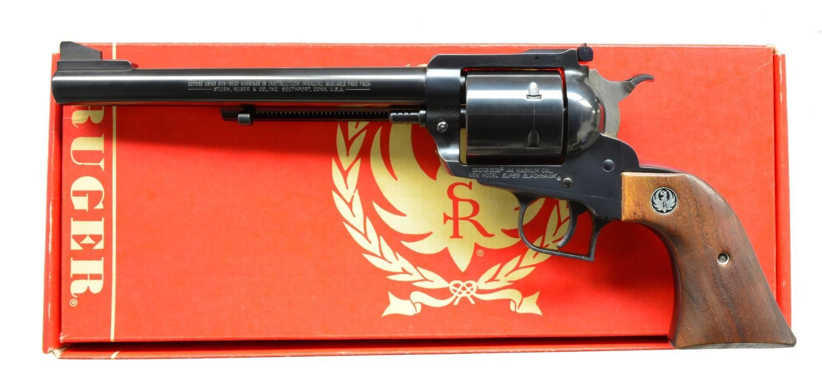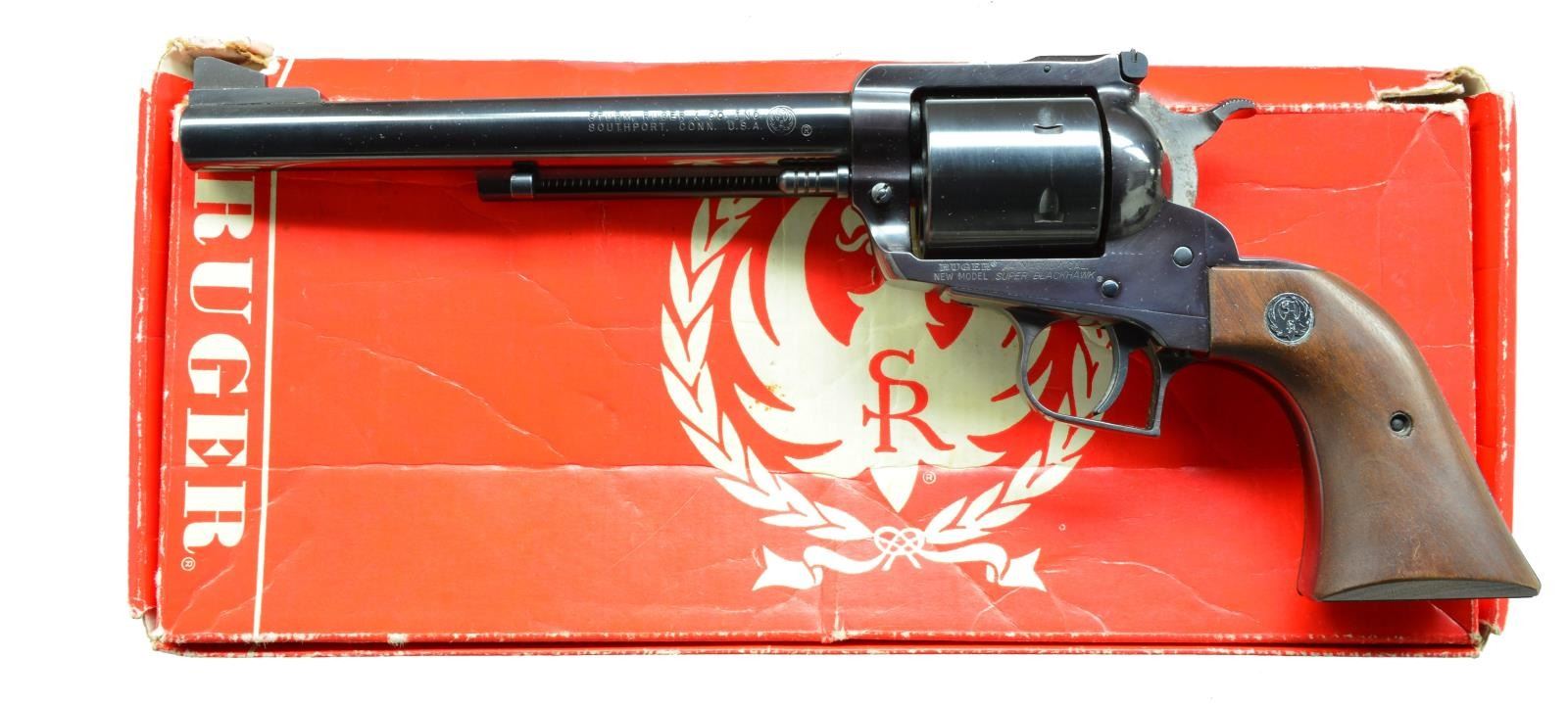 BOTH: cal. 44 Mag. Bbls. 7 1/2". Blued w/ steel Dragoon style trigger guards, unfluted cyls., adj. sights, wide spur hammers, alloy ejector housings & wide grooved triggers. Walnut grips w/ silver eagle medallions. UNATTACHED ACCESSORIES: matching numbered red & white one piece boxes w/ packaging; #1 slightly tattered on edges & corners, #2 near excellent. CONDITION: faint hint of cyl. turn lines & light staining on sides of hammers. All other aspects near excellent including bores. 1) S# 81-38534. Mfg. 1975 w/out warning marks on bbl. plus blued grip screw bushings & screw. (20-1518/NW). 2) S# 82-67775. Mfg. 1978 w/ warning marks on bbl. plus stainless grip screw bushings & screw. (20-1519/NW). BOTH MODERN. $700-1,000.