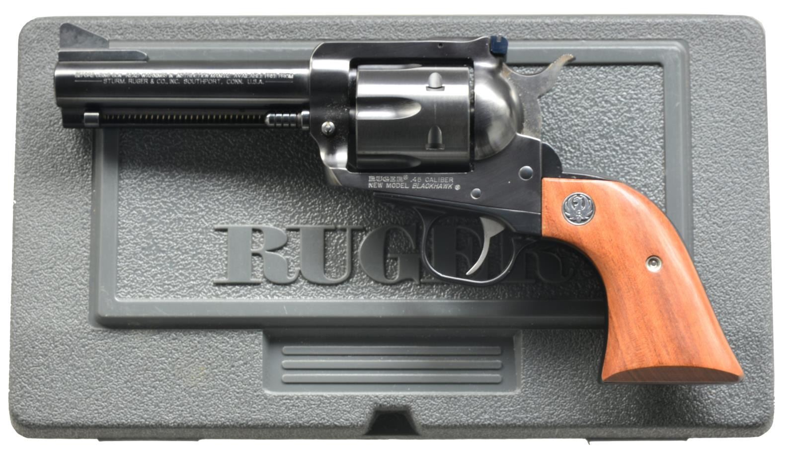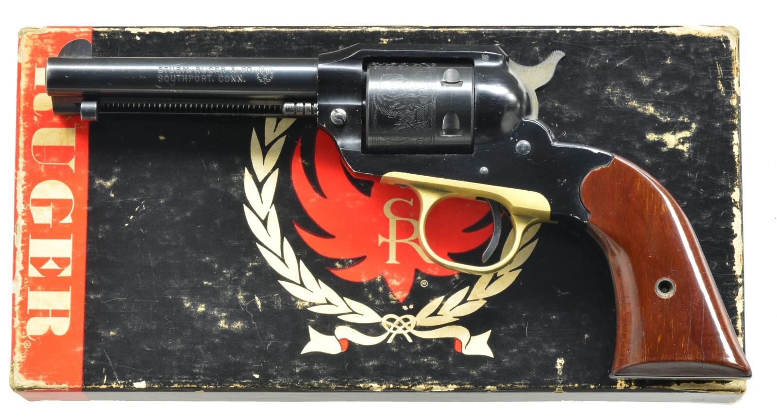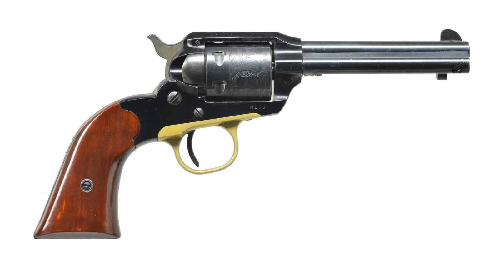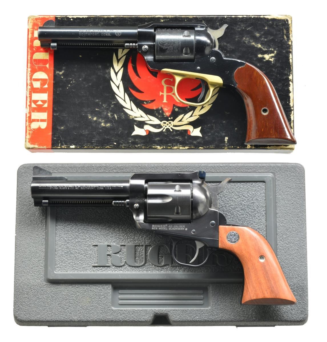 1) OLD MODEL BEARCAT. Cal. 22 LR. S# M159. Bbl. 4" w/ blade front sight & frame notched rear. Mfg. 1959 & referred to "Alpha Cat" by collectors; 3 groups of letter prefix models, 1958 - 1960. Some speculate letter prefix was to confuse competition on how many were produced. Early brown synthetic grips w/out medallions; only Ruger handgun ever mfg. w/out grip medallions or logo. Black alloy frame & brass toned alloy trigger guard. Steel ejector rod housing. Original lock work, not factory safety updated. UNATTACHED ACCESSORIES: unnumbered original style 2 piece box w/ light scuffs & 1 broken lid corner. CONDITION: very good overall appearance w/ slight high point wear & marks on & around cyl. pivot pin. Near excellent bore & grips. (20-2356/NW). CURIO. 2) NEW MODEL BLACKHAWK. Cal. 45 Colt. S# 48-19879. Bbl. 4 5/8" w/ ramped blade front sight & adj. rear. Factory wood grips w/ silver eagle medallions. UNATTACHED ACCESSORIES: original factory gray plastic case & manual plus aftermarket imitation ivory grips. CONDITION: very faint cyl. turn line; all other aspects near excellent including bore. PROVENANCE: The Estate of Richard Willman. (20-2364/NW). MODERN. $800-1,200.
