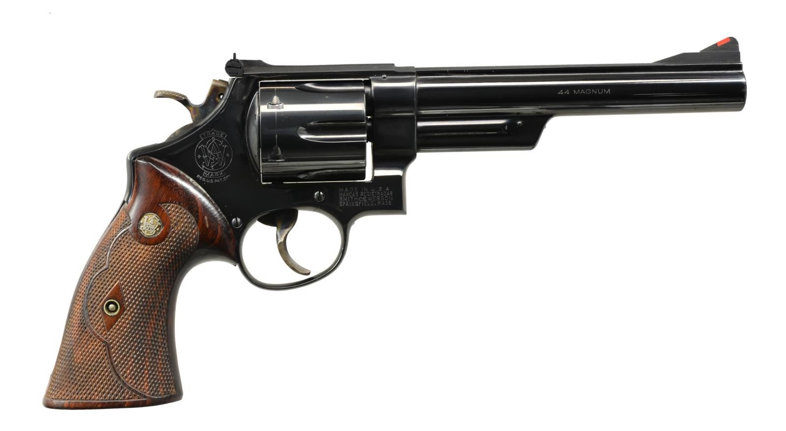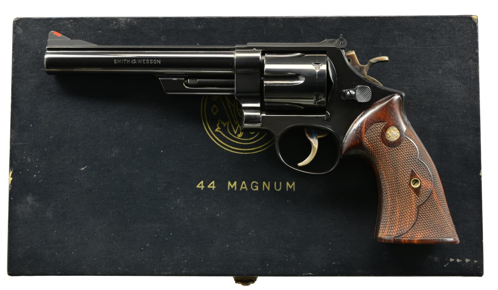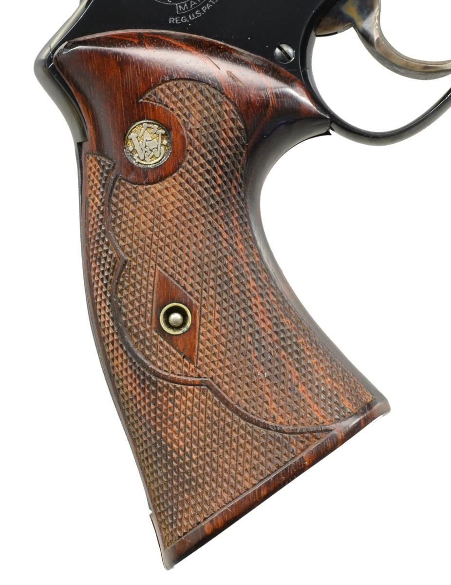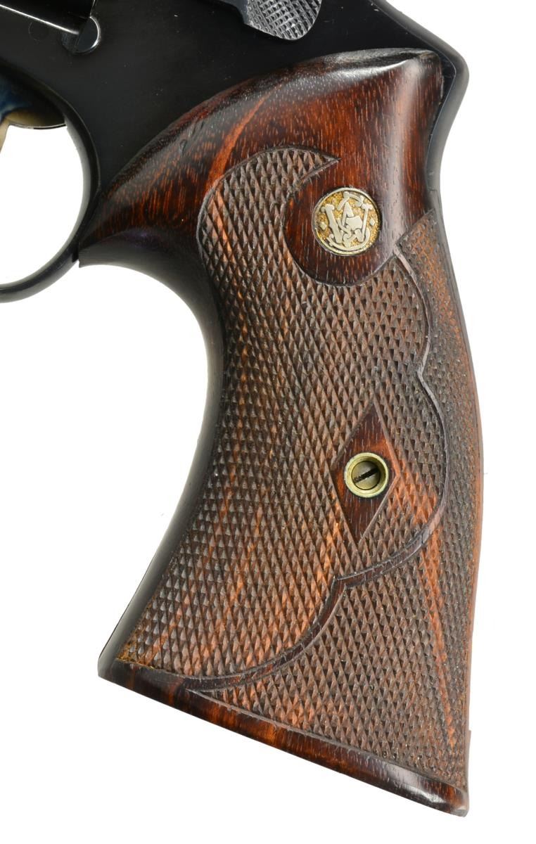 Cal. 44 Mag. S# S180864. Bbl. 6 1/2" w/ rib. Serrated red ramp front sight w/ white outline adj. rear sight. 6 Shot fluted cyl. 4 Screw N frame action w/ pinned bbl. Blue finish. Case colored target hammer & trigger. 2 Piece Goncalo Alves target grips w/ S&W medallions. Consignor information attributes checkering to famous gripmaker Lew Sanderson. UNATTACHED ACCESSORIES: original S&W 44 Mag. marked black display box w/ fitted interior containing screwdriver, bore mop & patch jag. Interior is torn. CONDITION: over 97% metal finish showing a cyl. drag line. Grips have very good finish showing a few sm. marks. Sound mechanics. Near excellent bore. (20-1967/DS). CURIO. $2,000-2,900.