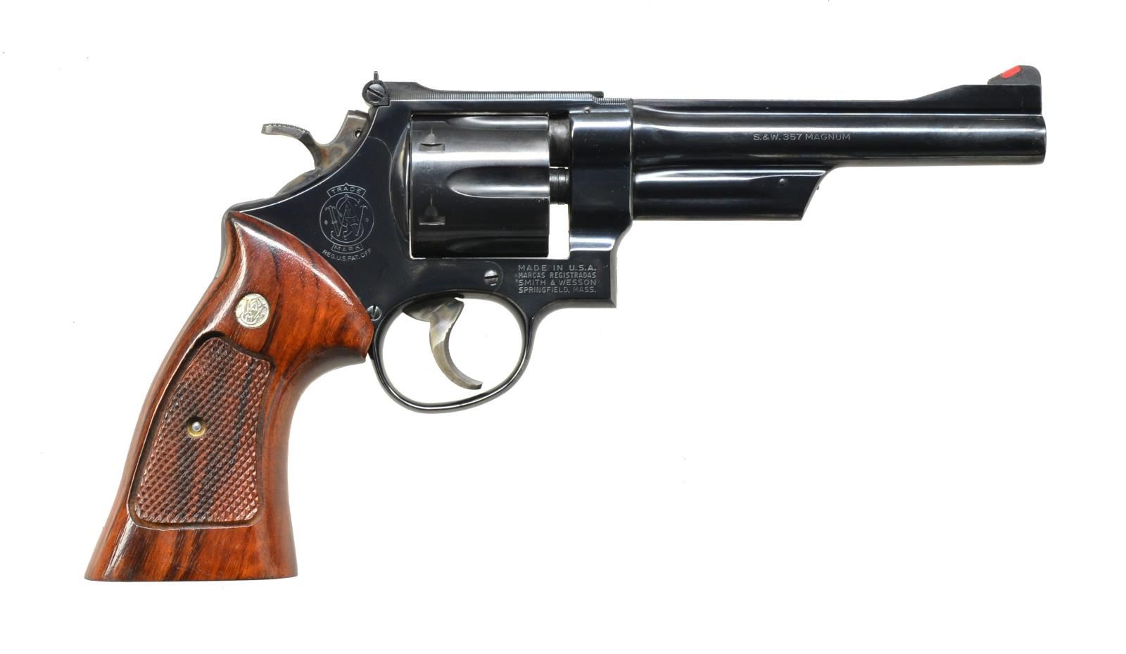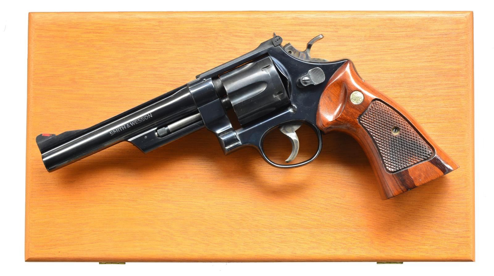 Cal. 357 Mag. S# N612072. Bbl. 6" w/ shrouded extractor & rib. Red ramp front sight w/ white outline adj. rear sight on a checkered top strap. 6 Shot fluted cyl. Blue finish w/ case colored target hammer & trigger. 2 Piece Goncalo Alves target grips w/ S&W medallions. UNATTACHED ACCESSORIES: wood presentation box w/ fitted blue interior containing cleaning rod, brush, mop, screwdriver, instructions & warranty statement. Includes cardboard over box w/ matching label. CONDITION: over 97% blue showing cyl. drag line w/ worn finish on extractor rod. Very good grips. Bright bore w/ strong rifling. (20-3088/DS). MODERN. $600-900.