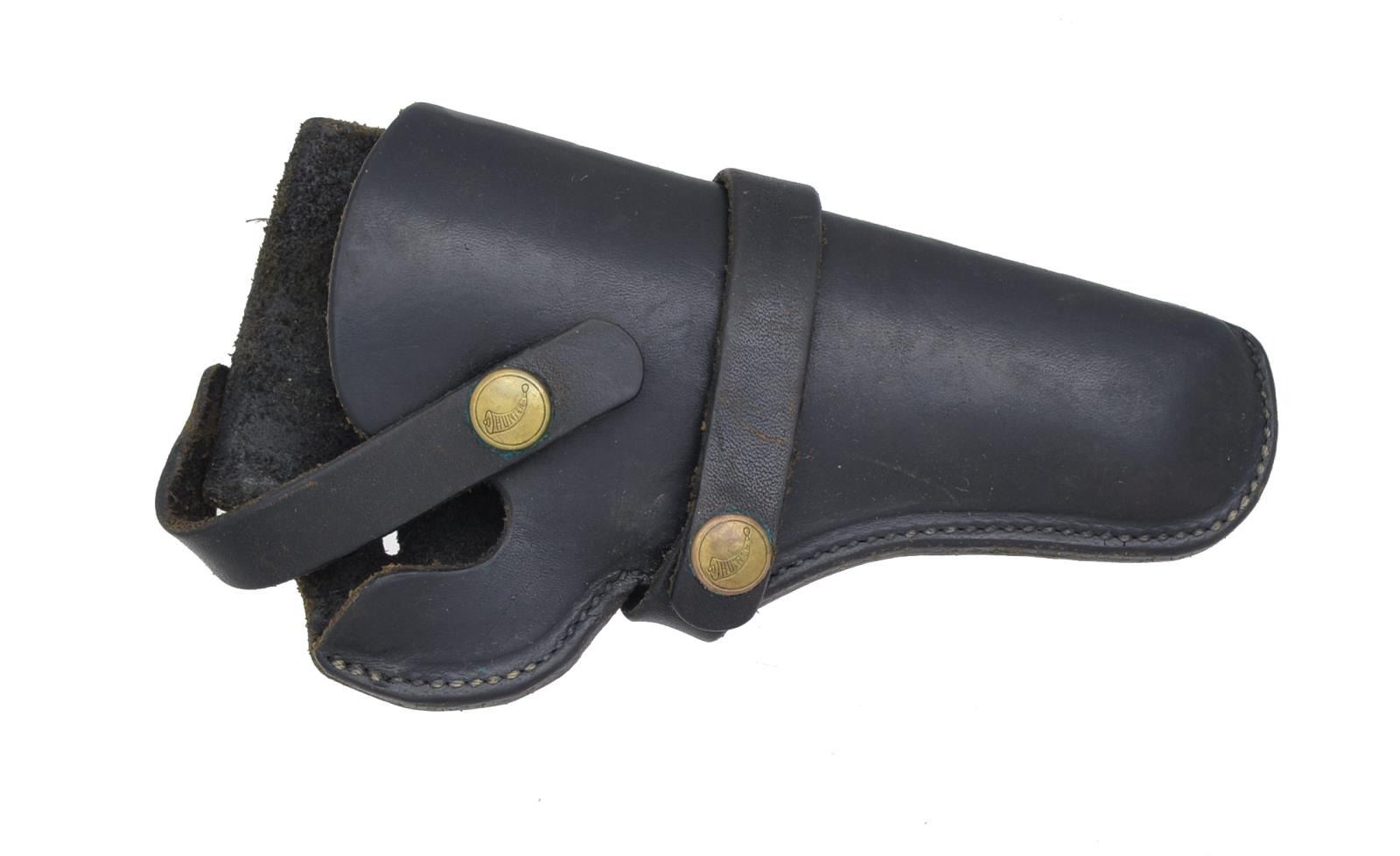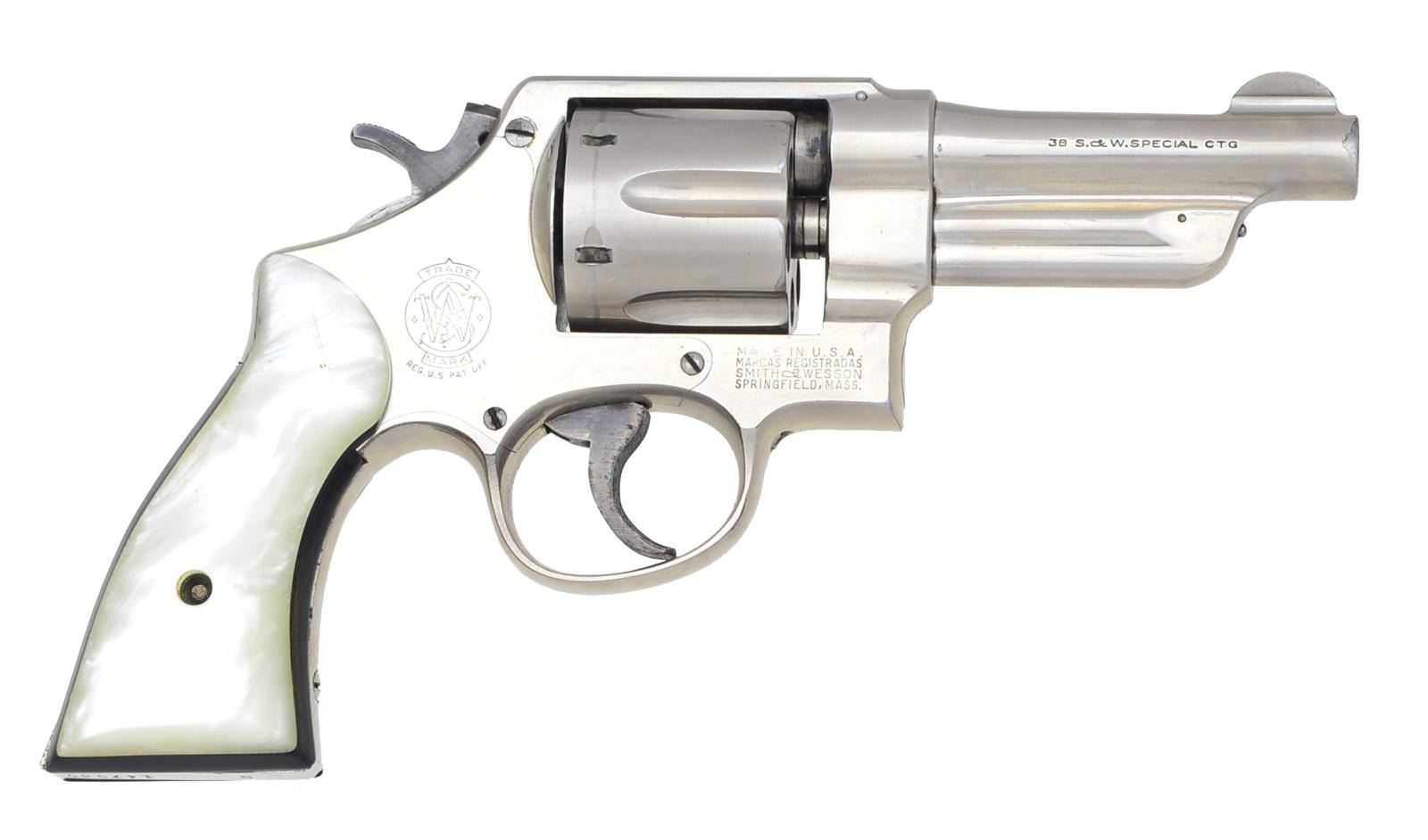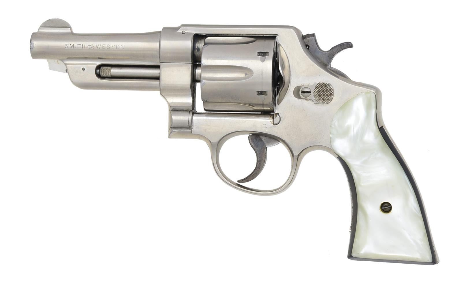 Cal. 38 Spl. S# S147980. Bbl. 4" w/ half moon front sight & frame notched rear. Mfg. 1955-1956 as "Pre Model 20" (1950-1966). 9,493 Mfg. (became Model 20 in 1957). 5 Screw N frame w/ standard case colored trigger & hammer. Matching numbered cyl., blued extractor & pinned bbl. Left bottom of frame under grip stamped "R" & "N" indicating factory renickeled. Jay Scott simulated pearl Magna style grips w/ dark wood backers. CONDITION: good plus general appearance w/ finish wear most noticeable at muzzle. General light marks throughout including cyl. turn line. Somewhat thin frame legend along w/ "Wesson" on left side of bbl. Peppery oxidation on hammer & trigger. Firing residue in action & face of cyl. Near excellent bore & grips. (20-2510/NW). CURIO. $500-800.