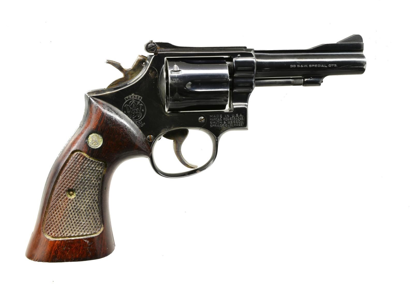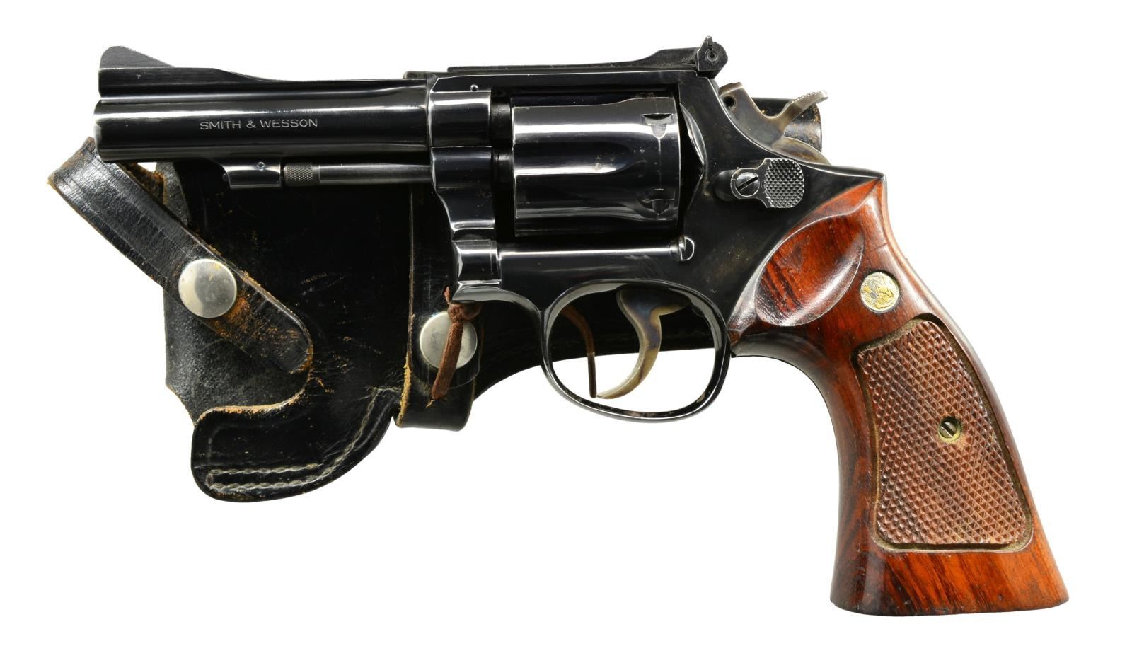 Cal. 38 Spl. S# 3K78698. Bbl. 4" w/ rib having serrated ramp front sight w/ square notch adj. rear sight. 6 Shot fluted cyl. 3 Screw action w/ pinned bbl. Blue finish. Case colored hammer & trigger. 2 Piece Goncalo Alves target grips w/ S&W medallions. UNATTACHED ACCESSORIES: S&W B21 34 black leather holster. CONDITION: 90% lightly worn blue showing muzzle & edge wear w/ faint cyl. ring having sm. spots of pitting on sideplate. Grips have worn finish w/ handling marks & show sanding at butt. Good mechanics. Bore is bright w/ strong rifling. (20-1973/DS). MODERN. $300-500.