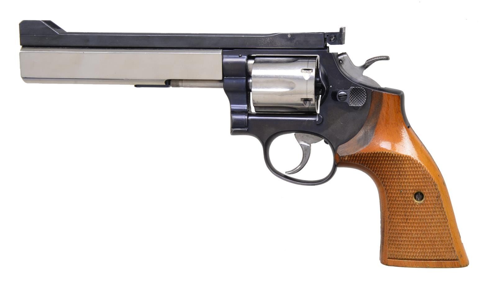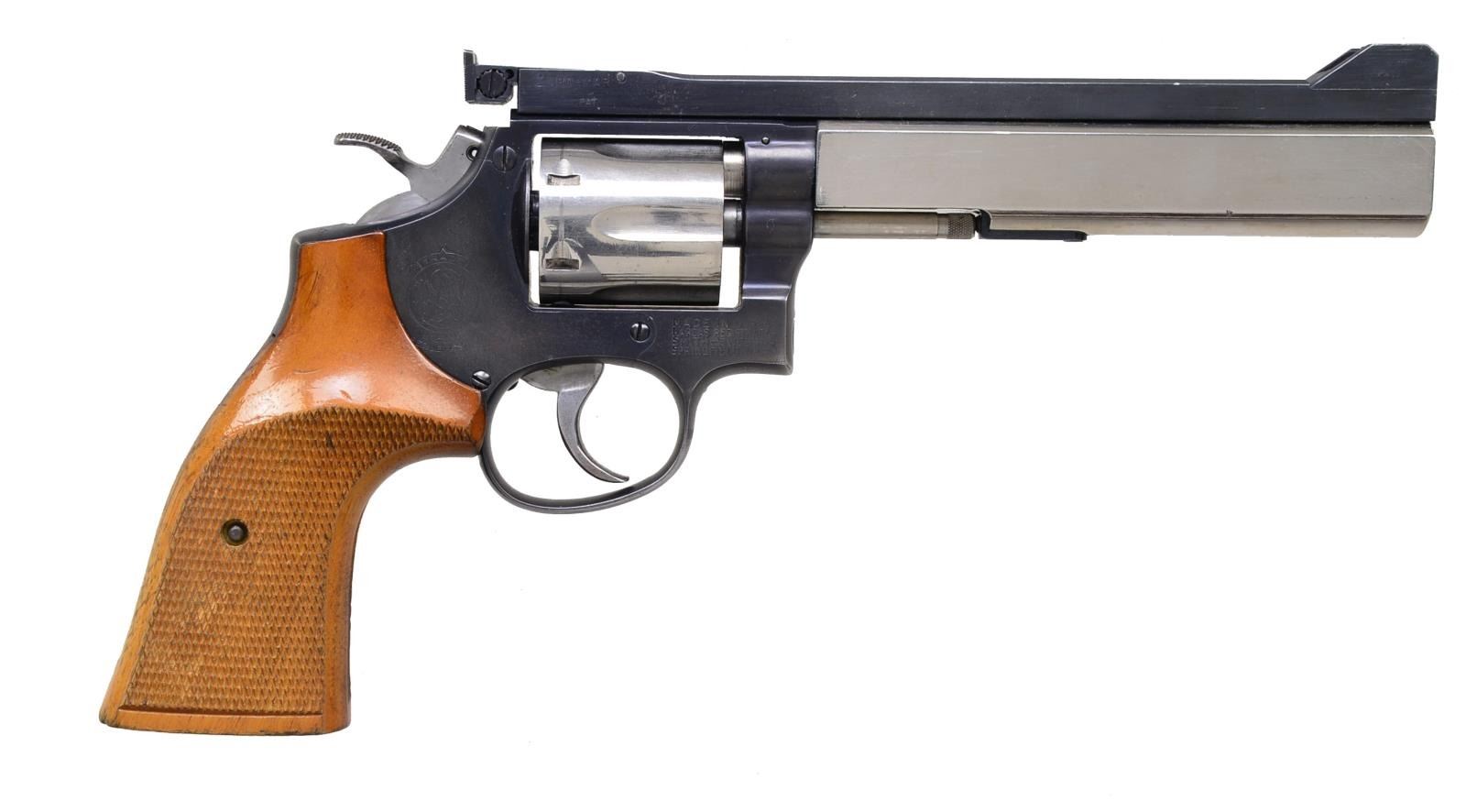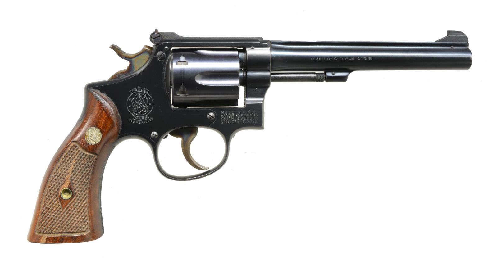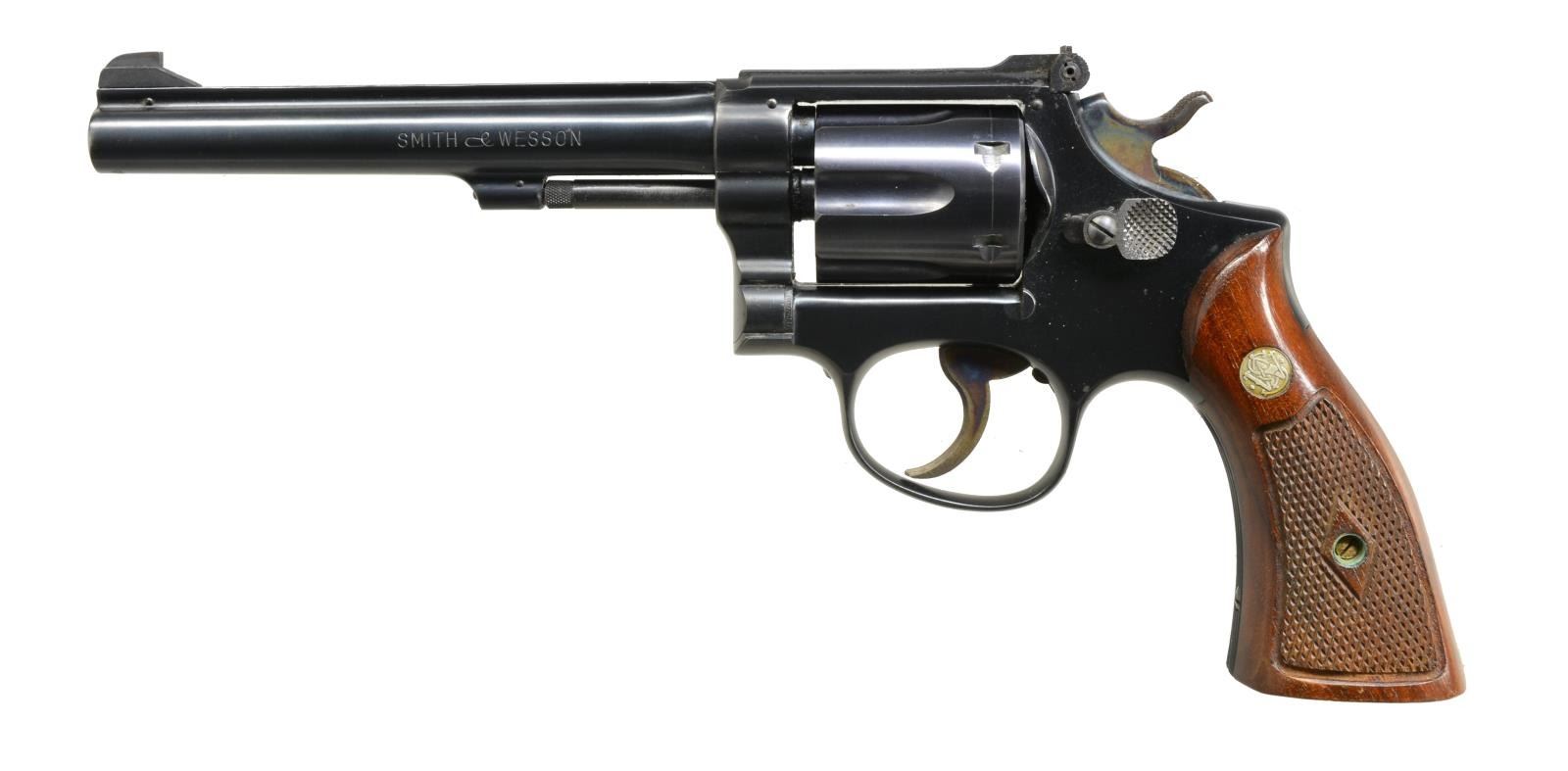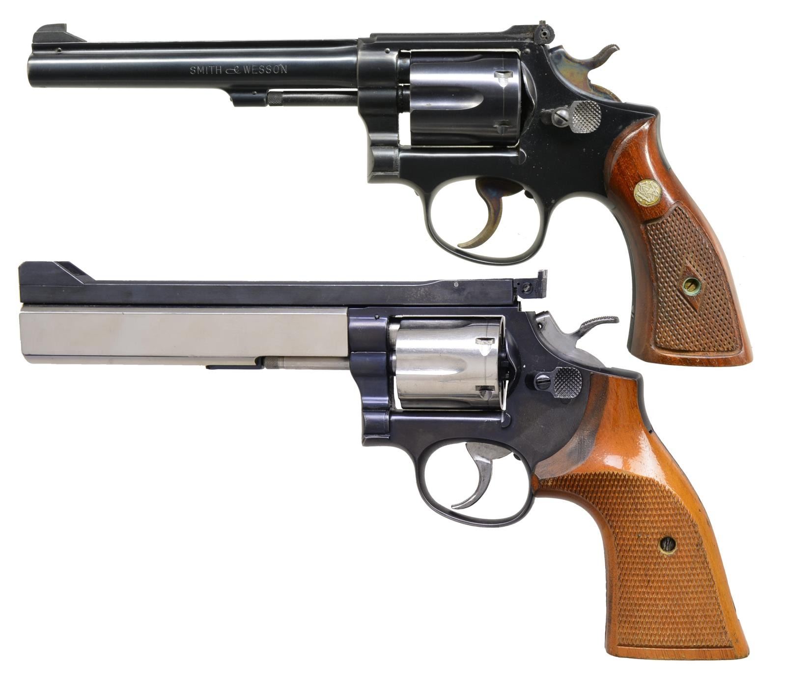 1) K22. Cal. 22 LR. S# K74583. Bbl. 6" w/ rib, patridge front sight & square notch adj. rear sight. 5 Screw action w/ pinned bbl. 6 Shot fluted cyl. Blue finish w/ case colored hammer & trigger. 2 Piece diamond checkered Magna walnut grips w/ S&W medallions. CONDITION: over 95% blue showing sm. spots of freckling. Grips show light wear w/ chips on right panel. Sound mechanics. Bore is bright w/ strong rifling. (20-1486/DS). CURIO. 2) K38. Cal. 38 Spl. S# K159145. Custom flat sided heavy bbl. w/ aftermarket Bo-Mar rib having a protected Patridge front sight & square notch adj. rear sight. 6 Shot fluted cyl. Blued 5 screw action w/ pinned bbl. Bbl. & cyl. have nickel finish. Hammer & trigger are polished bright. Herrett Model PK Shooting Star checkered 2 piece grips. CONDITION: action has 75% reblued finish showing edge wear w/ areas of light remaining pitting. Bbl. & cyl. retain 90% nickel showing sm. spots & cyl. drag line. Grips show finish wear w/ sm. dents at butt. Smooth polished mechanics. Bore is bright w/ strong rifling. (20-1487/DS). MODERN. $700-1,000.
