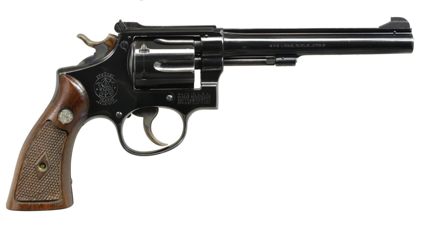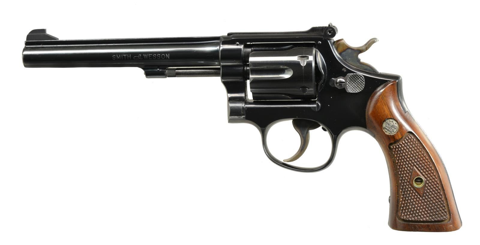 Cal. 22 LR. S# K42735. Bbl. 6". Post war 3rd model mfg. 1948 (1946-1957); also referred to as Pre Model 17. Matching numbered bbl., cyl., extractor & diamond center checkered walnut Magna grips. 6 Groove grip straps plus standard case colored trigger & hammer. Pinned bbl., recessed cyl. & 5 screw frame. Matte finished Patridge front sight & Micrometer rear. CONDITION: very good to near excellent overall appearance w/ factory quality refinish. Slight thinning at muzzle, light cyl. turn line & sm. oxidation spot above cyl. latch. Front frame legend slightly thin; all other markings sharp & clear. Lightened trigger return spring. Near excellent bore & grips. (20-2144/NW). CURIO. $650-900.