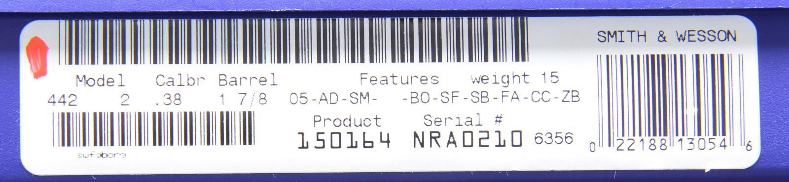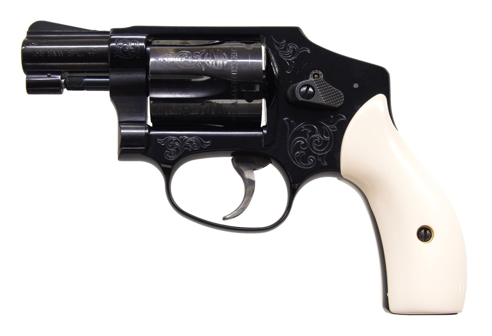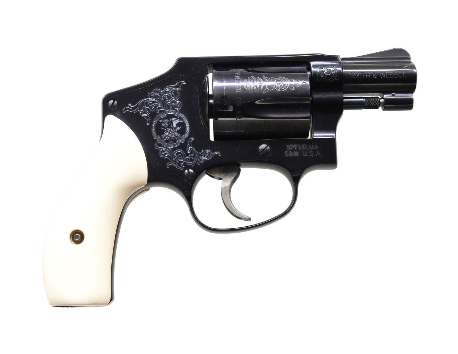 MODEL 442 WOMEN OF THE NRA DA REVOLVERS. ALL: cal. 38 S&W SPL. +P. This special Edition revolver dedicated to the Women of the NRA was issued during Sandra Froman's tenure as NRA president (2005-2007). Information cards w/ the guns picture Sandra Froman & quotes her views the guns as follow, "This model exemplifies the spirit & importance of our Second Amendment rights in a beautifully engraved piece that captures the essence of strong, powerful women who believe in their right to keep & bear arms." The first 130 of these 500 Special Edition guns had a spelling mistake on the cyl. The word "Amendment" was accidentally misspelled "AMMENDMENT". Only a portion of these had been sent to deals & distributors, S&W immediately asked for the guns to be returned, so cyls. could be replaced. To S&W's dismay, the distributor in possession of these 4 consecutive numbered guns declined to return them. It's believed that only a handful, other than these 4, are in circulation. Alloy J frame revolvers w/ concealed hammers. 1 7/8" Ribbed bbls. w/ serrated ramp front sights. Swing out fluted 5 shot cyls. Case colored triggers. Synthetic ivory rnd. butt grips. Ornamentation consists of scroll engraving on muzzle end of bbls., both sides of frame & cyl. between flutes w/ "NRA" markings. Left side of frame features the NRA seal. Inscription around the back of cyl. reads "ORIGINAL DEFENDER OF FREEDOM SECOND AMMENDMENT". UNATTACHED ACCESSORIES: both guns are housed in original blue molded S&W boxes w/ matching S# labels. Boxes contain instruction manuals, S&W club, laser engraving, NRA pamphlets & Sandra Froman cards along w/ trigger locks & fired cases. Also included are glass fronted wooden display cases w/ blue velour interiors having NRA seal on lids. CONDITION: both guns appear near new & unfired showing a slight drag line on the cyls. 1) S# NRA0210. (19-339/DS). 2) S# NRA0211. (19-340/DS). ALL MODERN. $4,000-6,000.