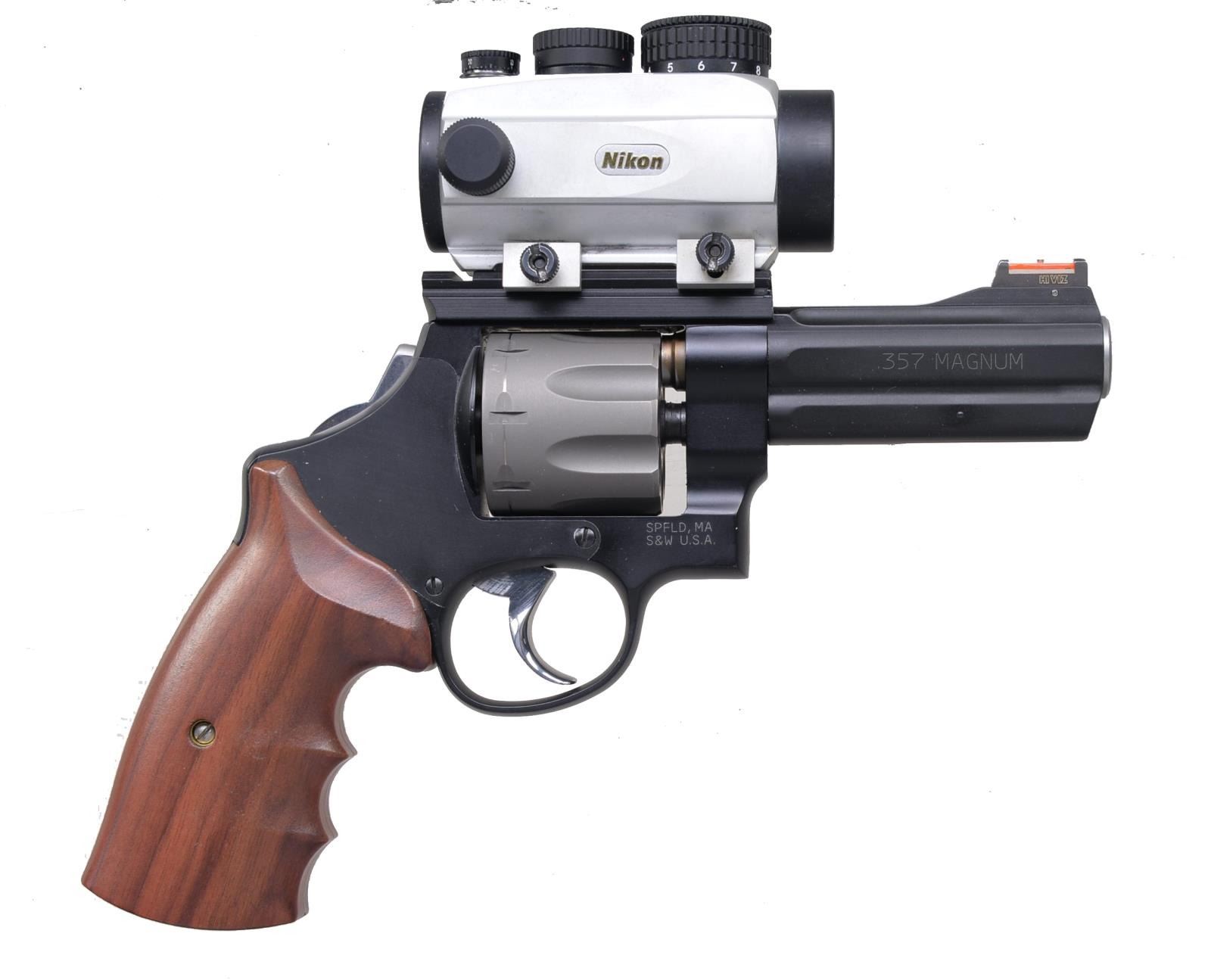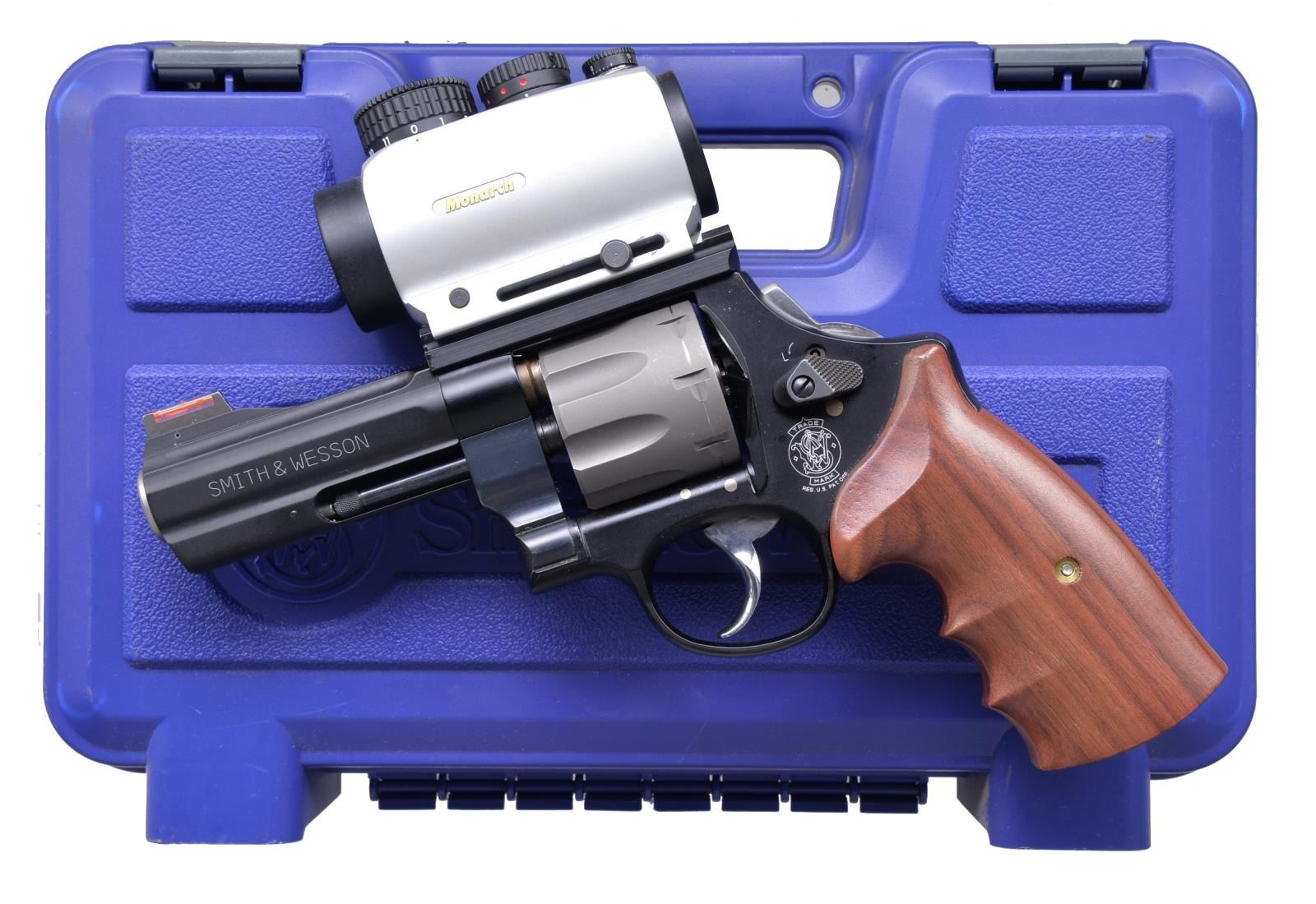 Cal. 357 Mag. S# DCW6985. Bbl. 4 1/8" w/ aluminum shroud w/ steel bbl. liner. Fully shrouded ejector. Red fiber optic ramp mounted front sight. Rear sight removed to allow mounting of Nikon Monarch optical sight. Scandium frame w/ matte black finish. Gray finished 8 shot Titanium cyl. Custom action job by Ron Power that includes DA only conversion w/ bobbed hammer, a smooth rnd. machine trigger & other improvements. 2 Piece finger grooved wood grips. Mfg. 2008-2009. UNATTACHED ACCESSORIES: blue plastic box w/ matching label containing instruction manual, club 1852 card, Action job papers, NRA ad, left over parts from action job, fired cartridge & adj. wrenches. CONDITION: over 98% metal finish showing a cyl. drag line & sm. handling marks. Grips have very good finish. Smooth mechanics. Bore is bright w/ sharp rifling w/ faint ring 1" forward of breech end. Functioning optical sight. PROVENANCE: From the Frederic W. Thrane Collection. (20-2435/DS). MODERN. $500-700.