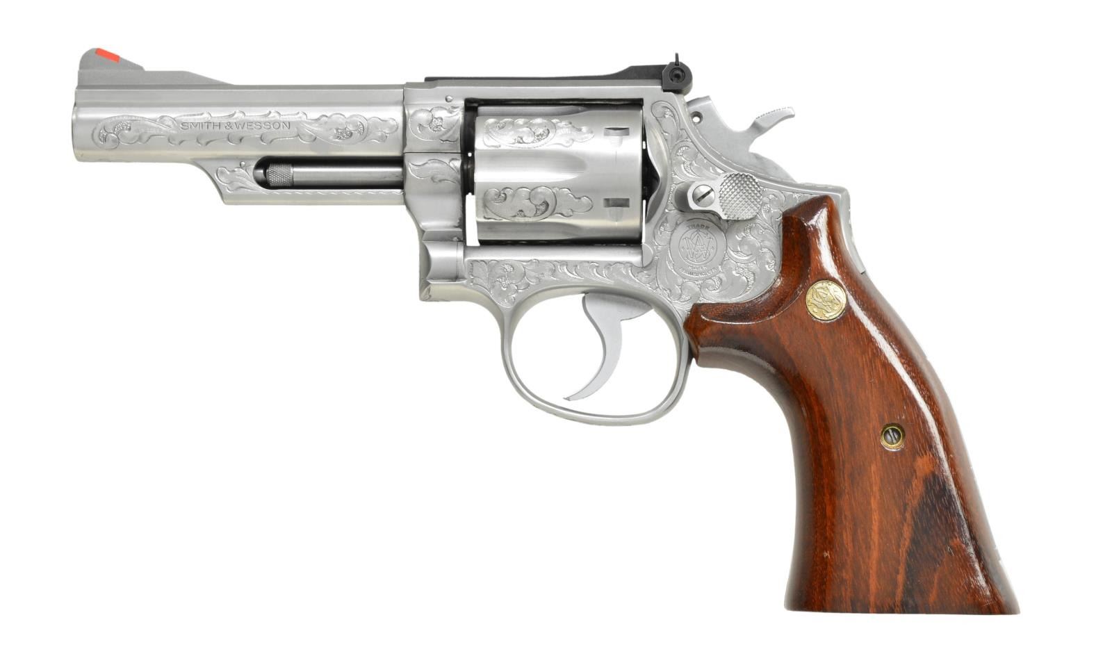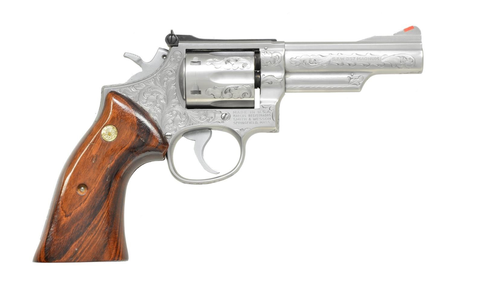 Cal. 357 Mag. S# 58K1123. Bbl. 4" w/ rib. Serrated red ramp w/ square notch adj. rear sight. 6 Shot fluted cyl. 3 Screw action w/ pinned bbl. Stainless steel construction. Frame, cyl. & bbl. have custom aftermarket scroll pattern hand engraving w/ punch dot backgrounds. 2 Piece Goncalo Alves smooth target grips w/ S&W medallions. CONDITION: very good metal finish showing a slight cyl. drag line. Grips show light handling marks. Sound mechanics. Bright near excellent bore. (20-1963/DS). MODERN. $1,250-1,750.