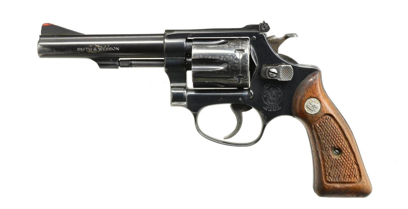 1) MODEL 10-5. Cal. 38 S&W Spl. S# C868919. Bbl. 4" w/ integral ramp front sight. Rear sight is integral w/ top of frame. 2-Piece S&W checkered grips. Standard trigger & hammer. 6 Shot cyl. CONDITION: blue is very good w/ minor knicks & scratches w/ wear on sharp edges. Grips have original finish w/ good checkering & minor depression on left grip. Bore is good. Gun is in time. (20-3032/BT). 2) MODEL 34-1. Cal. 22 LR. S# M205403. Bbl. 4" ribbed w/ integral ramp w/ orange paint as an insert. Adj. rear sight. Standard checkered S&W grips. Standard hammer & trigger. 6 Shot cyl. Commonly referred to as a “kit gun”. CONDITION: original blue is fair. Muzzle wear on both sides of bbl. Blue loss on cyl. Rub mark on right side of frame. Grips are solid w/ traces of original finish. Good checkering. Flattened points on left grip. Bore is bright. Gun is in time. (20-3041/BT). BOTH MODERN. $450-900.
