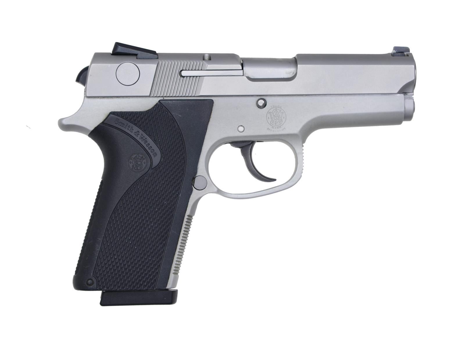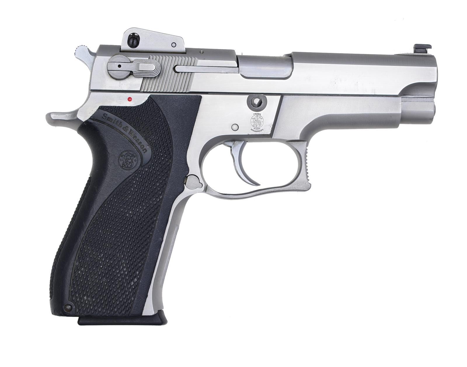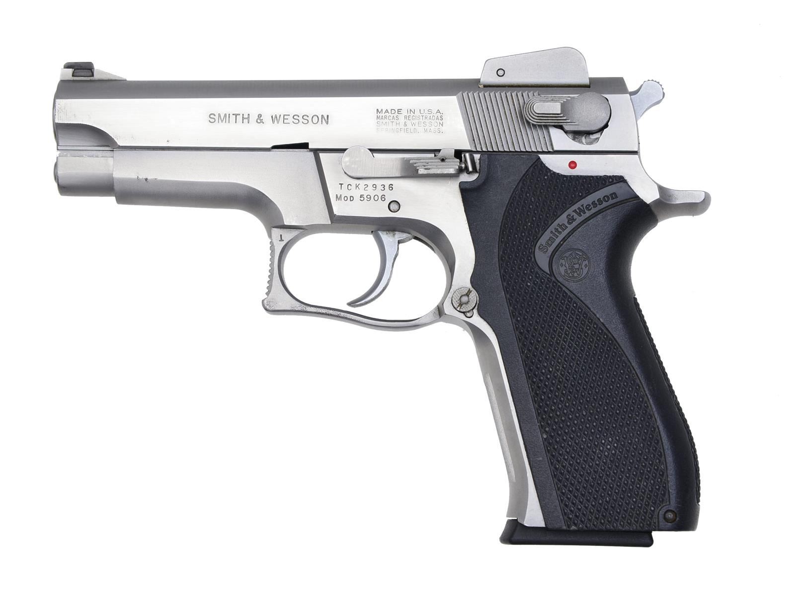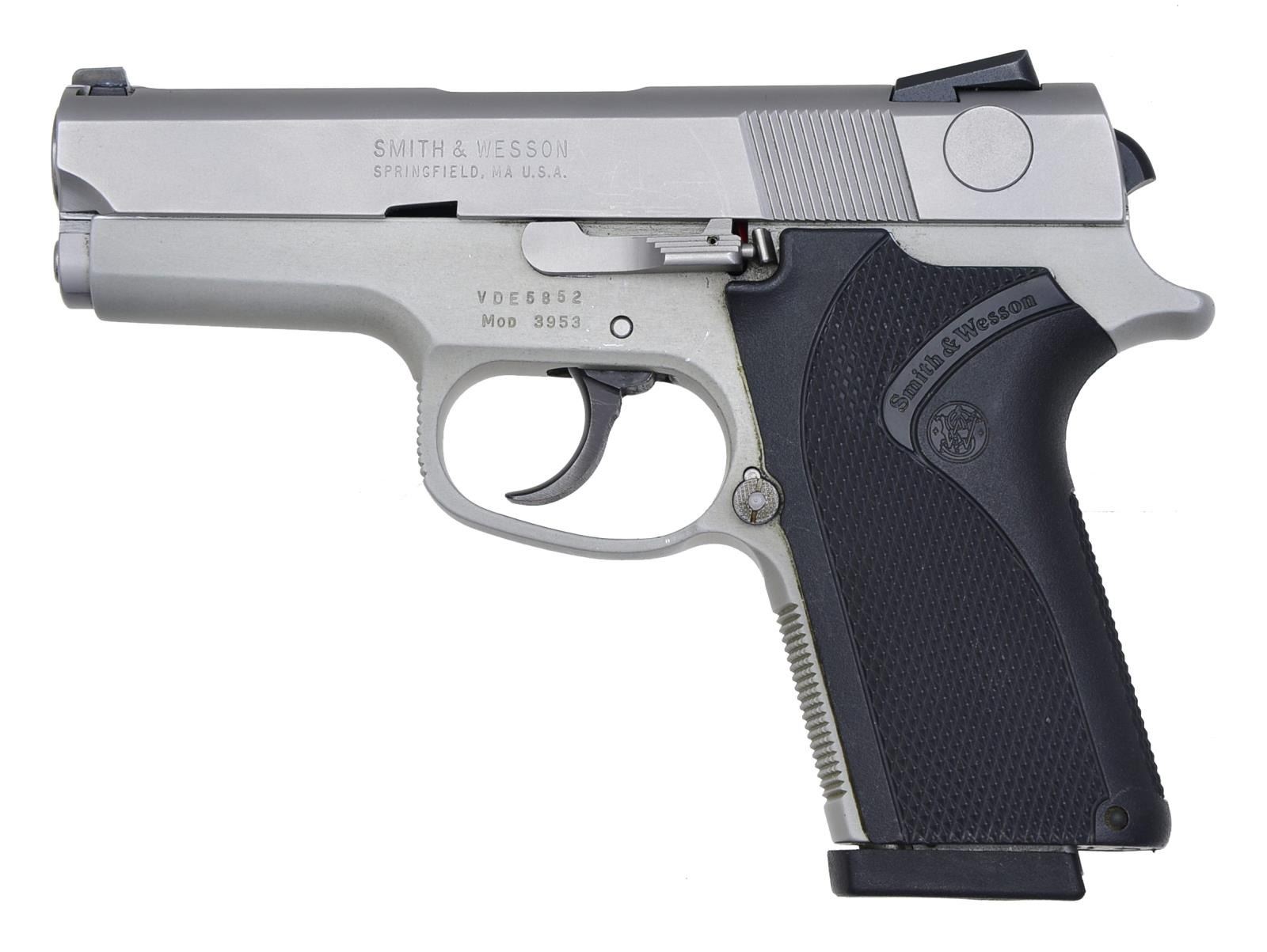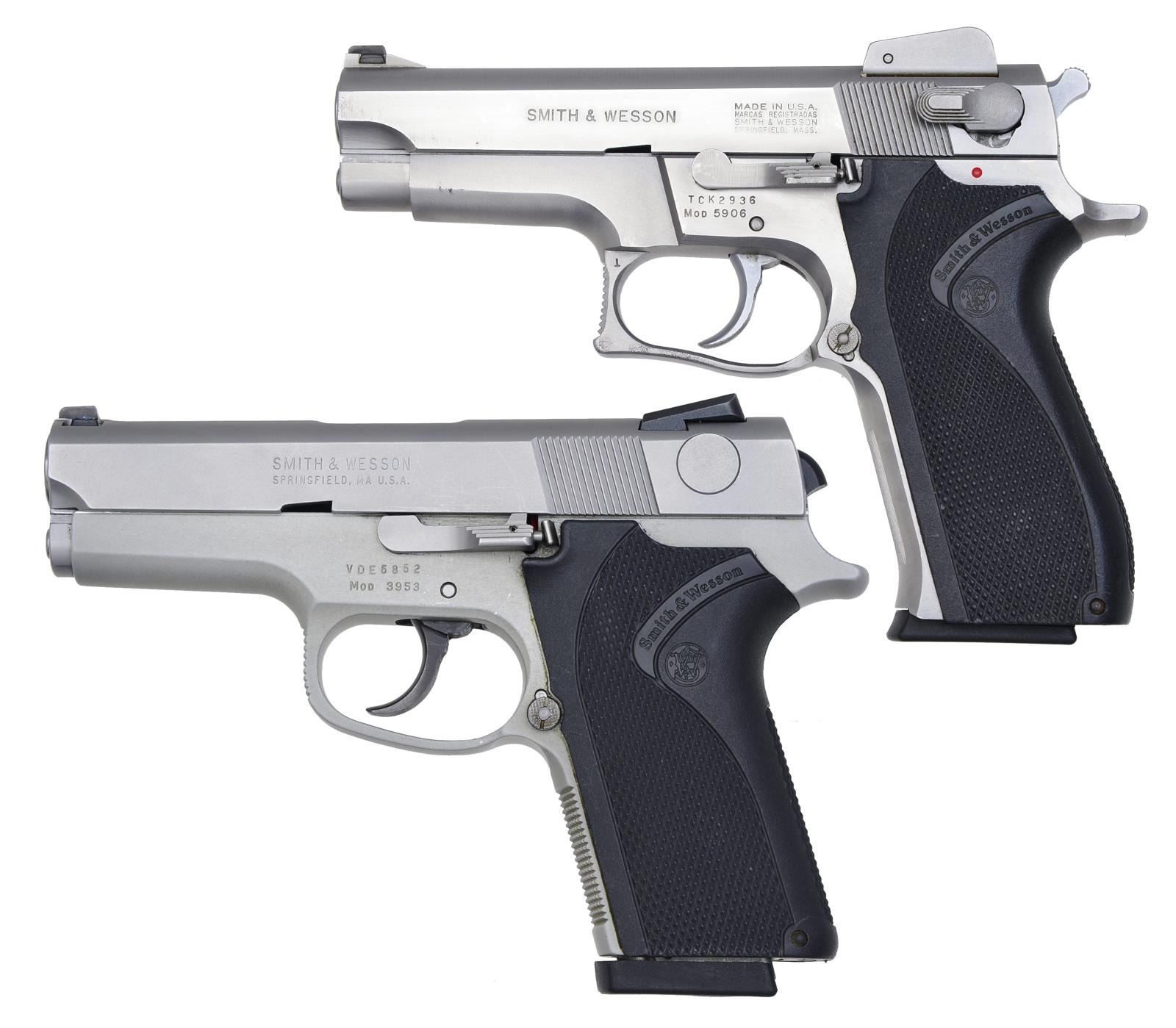 1) SMITH & WESSON 5906. Cal. 9mm. S# TCK 2936. Bbl. 4". Ramp front w/ dovetail white bead sight & adj. rear sight. Checkered S&W black hard rubber grips. MAGS: 1 - 14 rd. factory mag. CONDITION: retains good original stainless steel finish. Grips have good checkering. Bore is very good. (20-3641/BT). 2) SMITH & WESSON 3953. Cal. 9 mm. S# VDE5852. Bbl. 3 1/2". Dovetail white bead front & no back style rear sight w/ 2 white beads. This is a dbl. action only gun. S&W checkered black hard rubber grips. MAGS: 1 factory 8 rd. mag. CONDITION: gun retains most of its stainless steel finish. Grips have good checkering. Bore is good. (20-3645/BT). BOTH MODERN. $500-900.