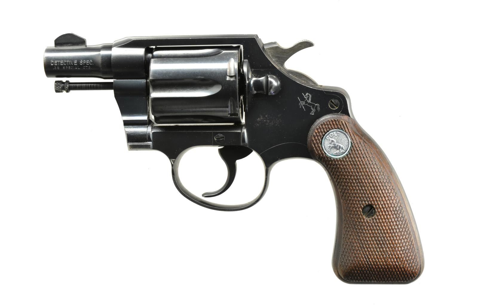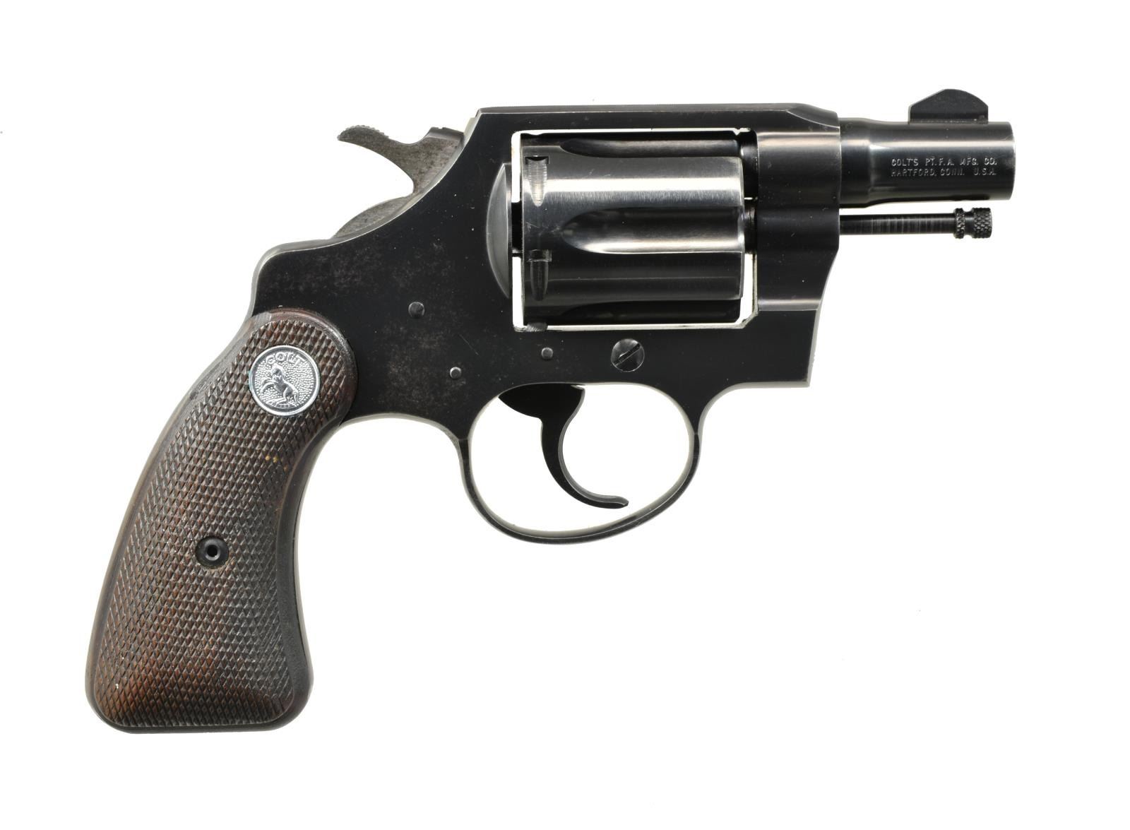 Cal. 38 Spl. S# 826476. Bbl. 2" w/ serrated ramp front sight, 6 Shot long flute cyl. Blue finish. 2 Piece checkered rnd. butt grips w/ silver Rampant Colt medallions. 1963 Mfg. CONDITION: over 90% original blue showing slight muzzle & edge wear w/ scattered sm. spots of light pitting. Grips show moderate wear. Sound mechanics. Bright bore has strong rifling. PROVENANCE: The Estate of Richard Willman. (20-2353/DS). CURIO. $550-850.