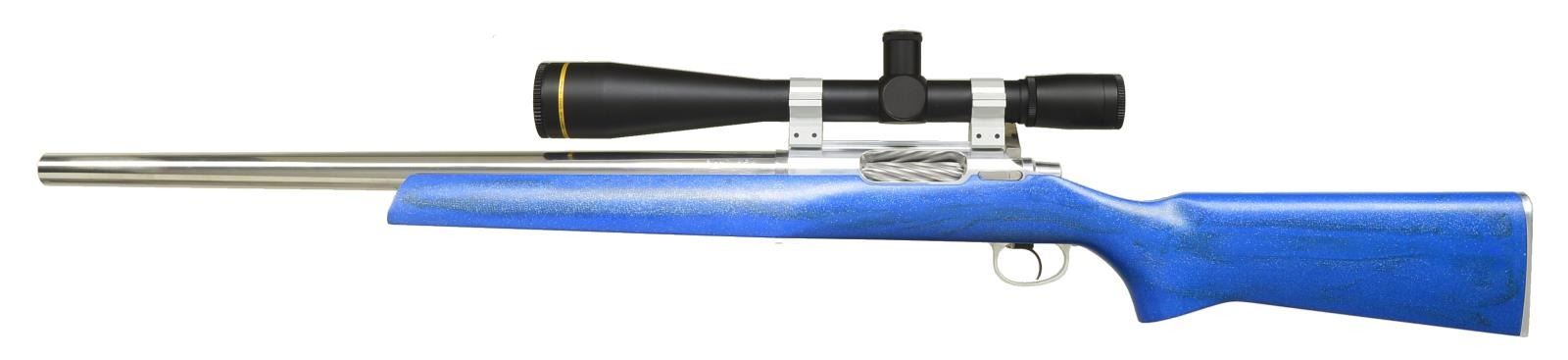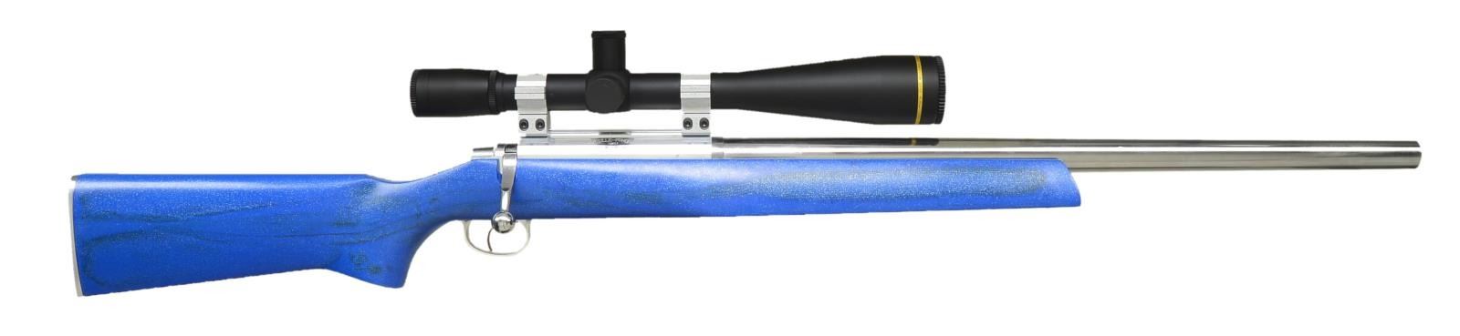 Cal. 6X47 Rem. S# 13201. Bbl. 23 1/2" heavy taper polished stainless measuring .985 at muzzle & 1.250" at recoil lug; recessed 2 step crown. 6x47 Is long time wildcat of 222 Rem. Mag. opened to 6mm w/ no other changes. Polished aluminum action, handle & shroud w/ spiral fluted right handed bolt; left side loading port. Super light Kelbly blued single stage trigger. Lightweight Kevlar stock w/ natural finished aluminum trigger guard & smooth contoured & polished buttplate. 3 Pillar bedded action screws; 2 in front of trigger guard, 1 at rear. 13 1/2" LOP. Blue finish w/ metal flake & black streaks also shows occasional crosshatch pattern of Kevlar material. Toe line 1/2" flat, forend 3" flat; flared portion of forend 11" long. Kelbly aluminum 30mm rings mated to grooved receiver. Matte finished Leupold Competition Series 45X45mm scope having capped target turret knobs plus capped parallax adj. at turret. Fine cross hair & dot reticle. Screw in lens caps. CONDITION: all aspects of entire assembly near excellent. PROVENANCE: From the Frederic W. Thrane Collection. (20-2455/NW). MODERN. $1,200-1,800.
