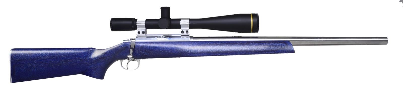 Cal. 222 Rem. S# 13204. Bbl. 23 1/8" heavy taper polished stainless measuring .986 at muzzle & 1.250" at recoil lug. Polished aluminum action, handle & shroud w/ spiral fluted right handed bolt; left side loading port. Super light Kelbly blued single stage trigger. Lightweight Kevlar stock w/ natural finished aluminum trigger guard & smooth contoured & polished buttplate. 3 Pillar bedded action screws; 2 in front of trigger guard, 1 at rear. 13 3/8" LOP. Dark blue finish w/ metal flake & black streaks also shows occasional crosshatch pattern of Kevlar material. Toe line 1/2" flat, forend 3" flat; flared portion of forend 11" long. Kelbly aluminum 30mm rings mated to grooved receiver. Matte finished Leupold Competition Series 45X45mm scope having capped target turret knobs plus capped parallax adj. at turret. Fine cross hair & dot reticle. Screw in lens caps. CONDITION: all aspects of entire assembly near excellent. PROVENANCE: From the Frederic W. Thrane Collection. (20-2459/NW). MODERN. $1,200-1,800.