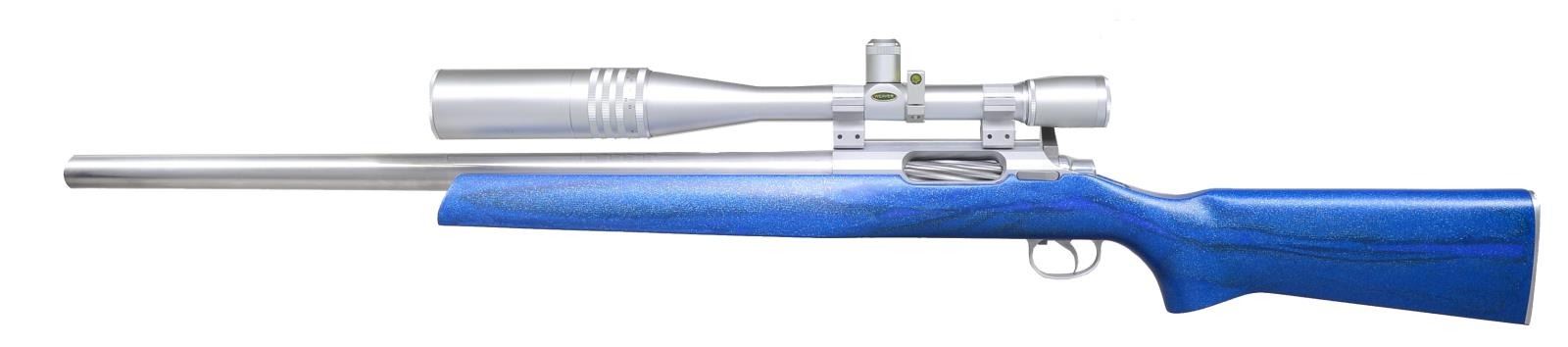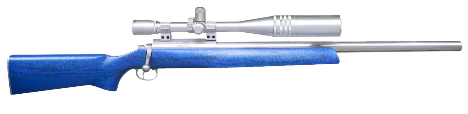 Cal. 6mm 220 Swift. S# 06267. Bbl. 24". Heavy taper polished stainless w/ recessed crown measuring 1.036" at muzzle & 1.195" at receiver. Aluminum action w/ spiral fluted right handed bolt & left side loading port. Super light Kelbly appearing single stage trigger. Lightweight Kevlar stock w/ natural finished aluminum trigger guard & smooth contoured & polished buttplate. 3 Pillar bedded action screws; 2 in front of trigger guard, 1 at rear. 13 3/8" LOP. Blue finish w/ metal flake & black streaks also occasionally shows crosshatch pattern of Kevlar material. Toe line 1/2" flat, forend 3" flat; flared portion of forend 11" long. Kelbly aluminum 1" rings mated to grooved receiver. Matte silver finished Weaver CT36 Micro-Trac AO scope having capped target turret knobs plus silver spirit level on tube. Fine cross hair & dot reticle. Screw in lens caps & 4" sunshade. CONDITION: all aspects of entire assembly near excellent. PROVENANCE: From the Frederic W. Thrane Collection. (20-2462/NW). MODERN. $1,000-1,500.