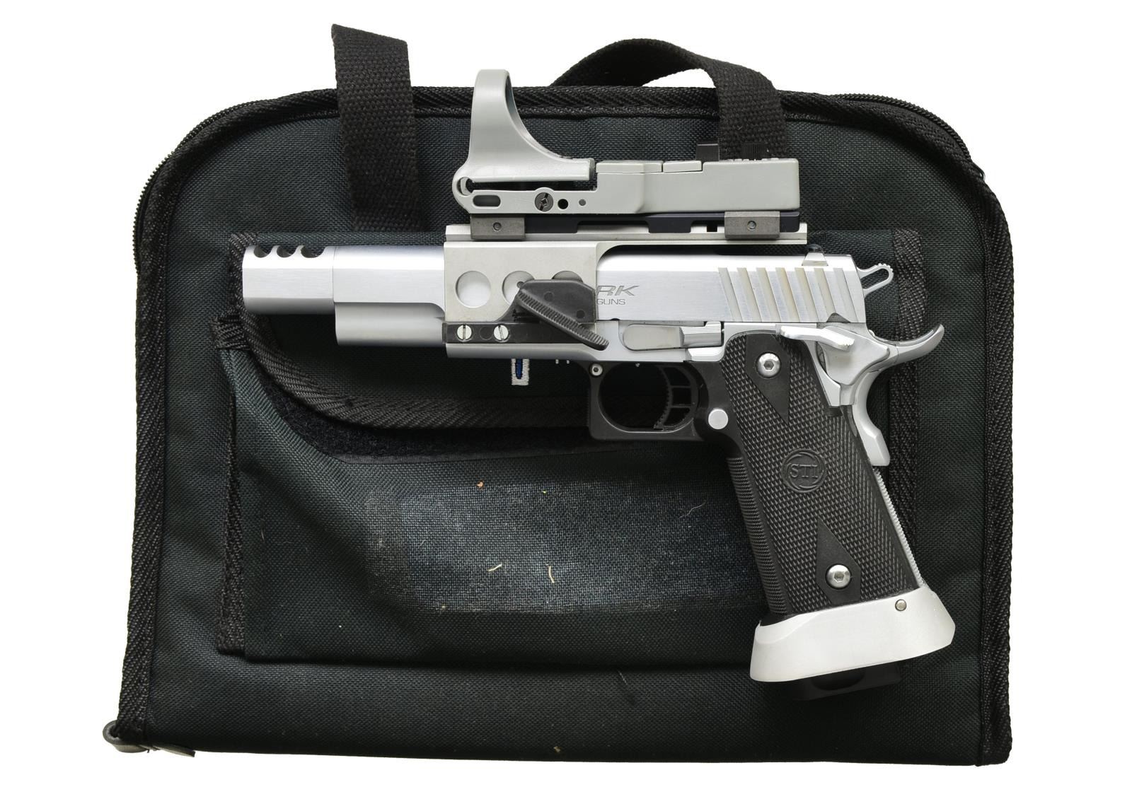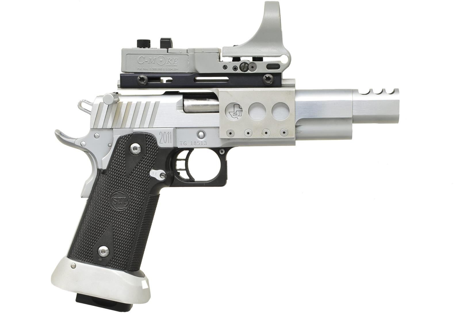 Cal. 45 ACP. S# TG18513. Bbl. 5" W/ triple port compensator. Frame, slide & some components mfg. by STI & then custom built by Clark Custom Guns. 2011 Modular frame w/ black polymer lower having checkered front strap plus front of squared trigger guard. Hard chrome finish w/ slightly polished sides of slide & comp. Angled square cut cocking grooves plus lowered top at rear of slide having slide racker. Dust cover mounted scope mt. w/ checkered thumbrest on left side; C-More red dot sight on Weaver style rail. Standard slide stop & extended paddle style safety. Extended mag. release, flat stainless checkered mainspring housing & beavertail grip safety w/ pad. Skeletonized plastic trigger w/ over travel & unusually skeletonized hammer w/ lightening cuts horizontally & vertically. Especially lg. aluminum magwell. Clark guarantees these guns to produce 2.5" groups for 10 rds. at 50 yards. Original MSRP starting price of $3800. MAGS: 4 stainless: 2 extended base 13 rd. & 2 regular base 10 rd. UNATTACHED ACCESSORIES: Dillon nylon carry bag w/ mag. pouches. Unmarked black plastic STI carry case. STI heavy bull bbl. 5" recoil master package. CONDITION: light firing residue in comp. All other aspects near excellent including bore. PROVENANCE: From the Frederic W. Thrane Collection. (20-2437/NW). MODERN. $1,500-2,000.