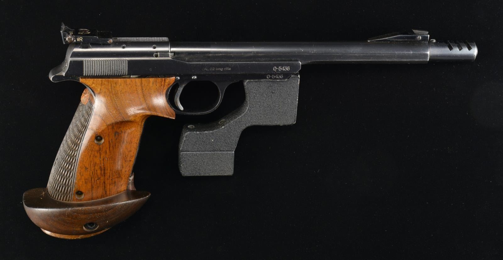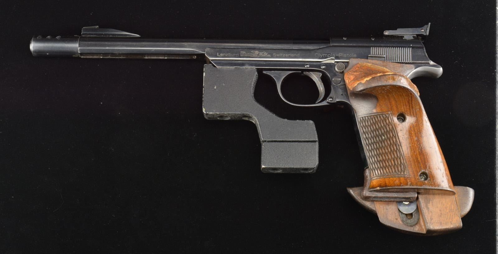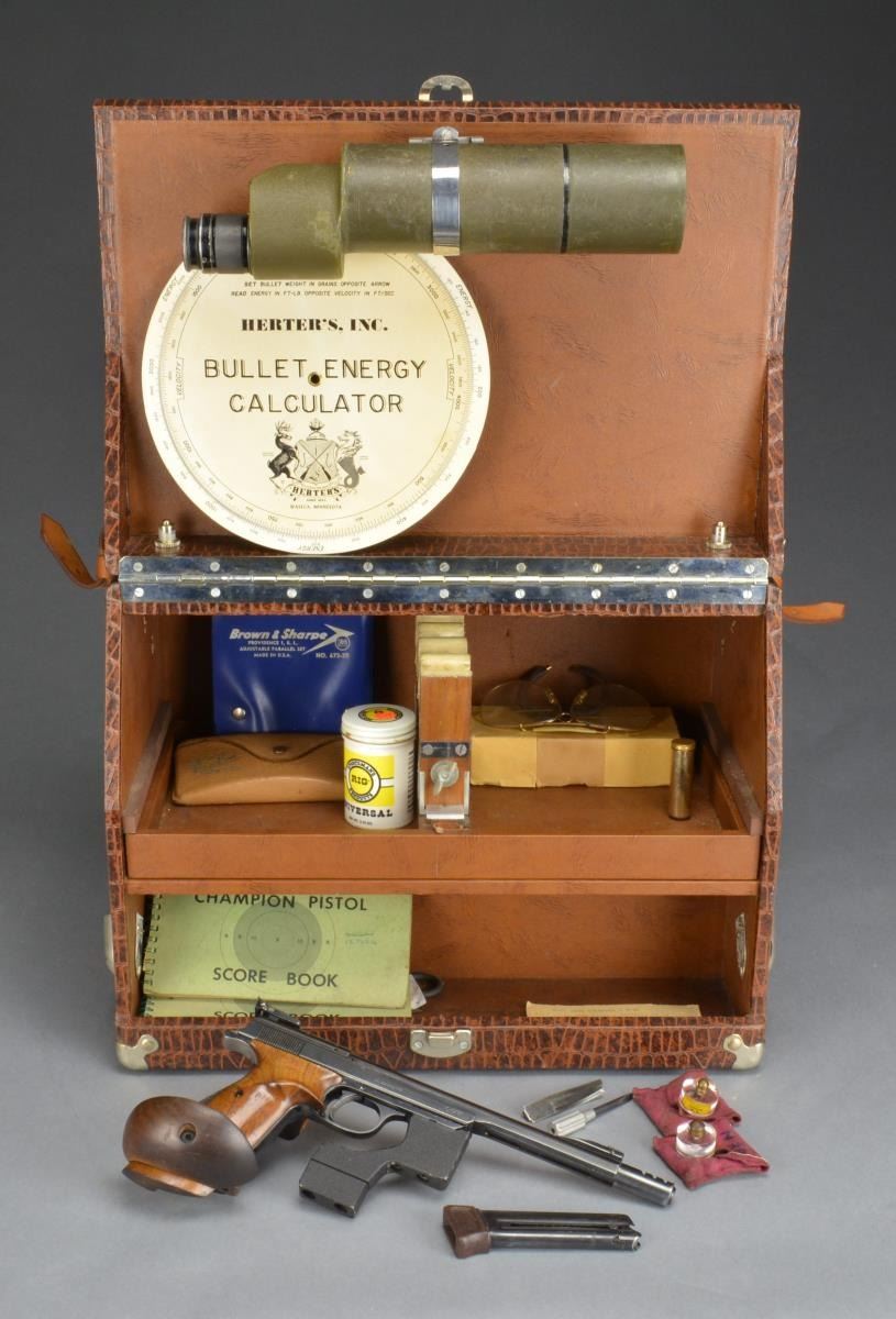 PISTOL. Cal. 22 LR. S# 0-5436. Bbl. 7 1/2" plus muzzle brake. Mfg. 1958-1963 as 1958 type w/ brake. Krinkle paint finished cast weight assembly attached to forward portion of frame by Allen screws. Undercut match front sight & target adj. rear. Coarsely checkered walnut RH thumbrest target grips w/ adj. palm rest & pronounced thumbrest having wood putty added at top. MAGS: 2 factory 10 rd. w/ extension base. Spines electro numbered 5436 at base. Underside of bbl. at muzzle end & rear edge of muzzle brake both numbered 65. UNATTACHED ACCESSORIES: alligator printed shooter’s box in good condition w/ leather carry strap & handle. Standard opening door on one side w/ ingenious push button locks to retain upright allowing use of attached Bausch & Lomb spotting scope w/ very good optics. Includes tray for pistols w/ supports plus sm. compartment at base on opposite side. Robust latches & metal capped corners. Misc. items also included such as yellow B&L shooting glasses, Brown & Sharpe adj. parallel set (appears new) & Herter’s bullet energy calculator that is circular disks operating similar to a slide rule. CONDITION: very good to near excellent overall appearance w/ faint thinning around muzzle brake area. Weight set w/ some paint loss. Grip set sound & very comfortable although not exactly pleasing in appearance. Near excellent bore. Unusual European target pistol w/ fantastic trigger pull. (20-1556/NW). CURIO. $600-900.