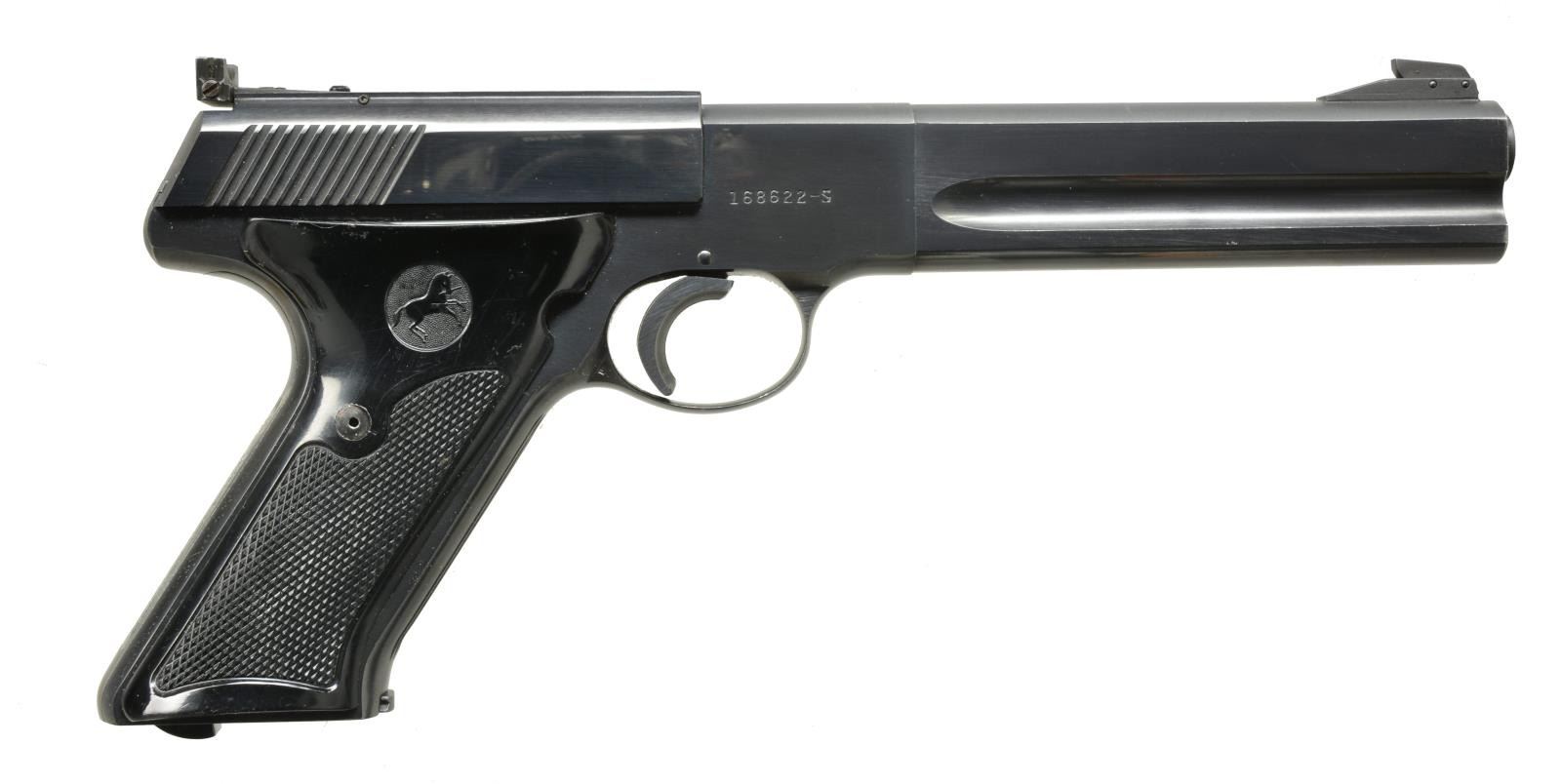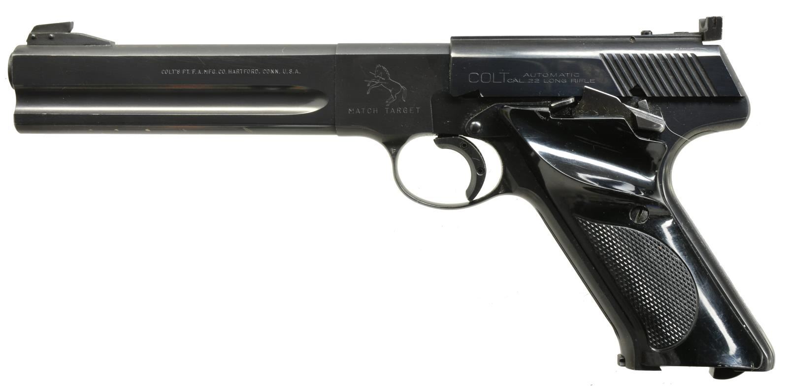 Cal. 22 LR. S# 168622-S. Bbl. 6" flat sided w/ full lug. Serrated ramp mounted Patridge front sight w/ square notch adj. target rear sight. Mag. release is located at bottom of grip. Trigger has added wide shoe. Blue finish. 2 Piece checkered plastic thumb rest grips w/ Rampant Colt marking. 1956 Mfg. MAGS: 1 - 10 rd. CONDITION: over 95% blue showing edge wear w/ series of sm. dents & spots of finish loss along bottom of bbl. lug. Grips show sm. handling marks. Bright bore w/ sharp rifling. (20-2410/DS). CURIO. $700-1,000.